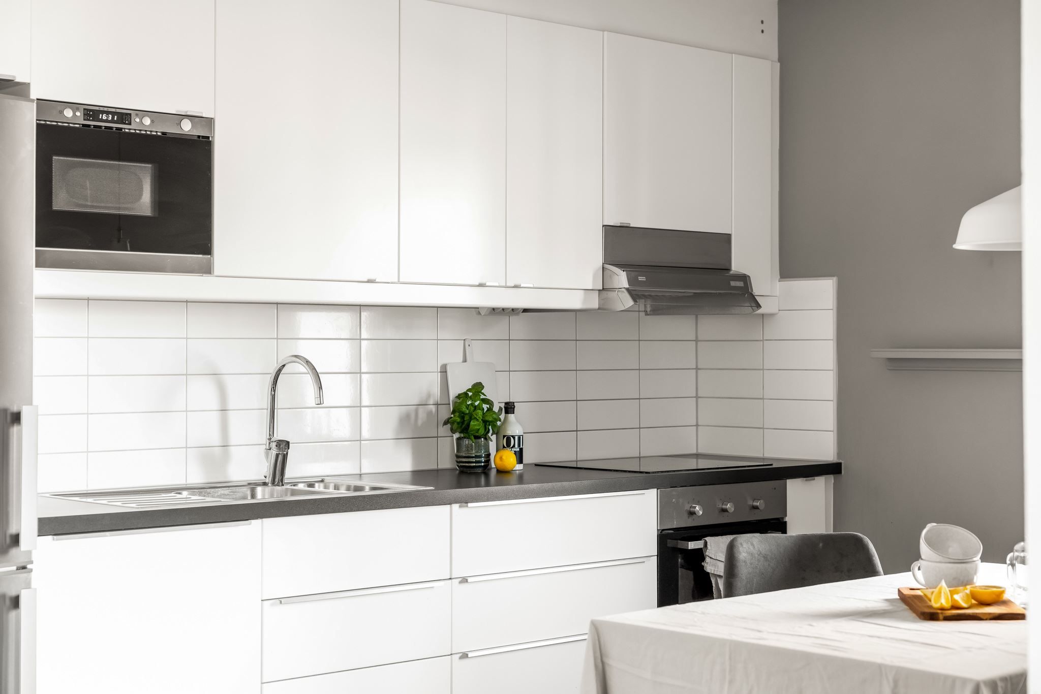 Det helkaklade badrummet är fullutrustat och stilrent utformat. Sovrummet är välplanerat med plats för både säng och förvaring. Köket håller en modern och elegant färgsättning med generösa arbetsytor och gott om förvaringsskåp. Den öppna planlösningen mellan kök och vardagsrum skapar en social och trivsam miljö – perfekt för både vardag och umgänge.
