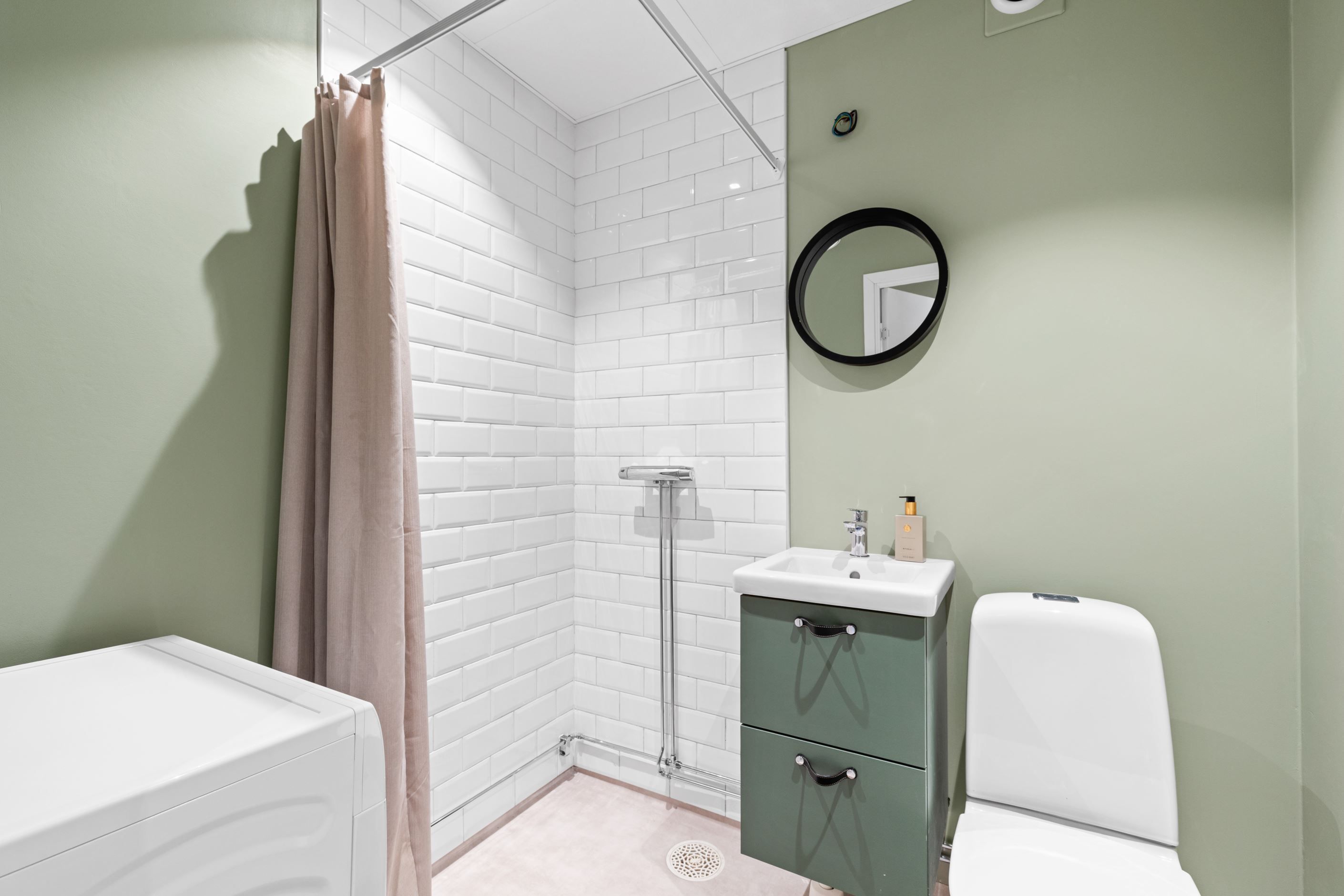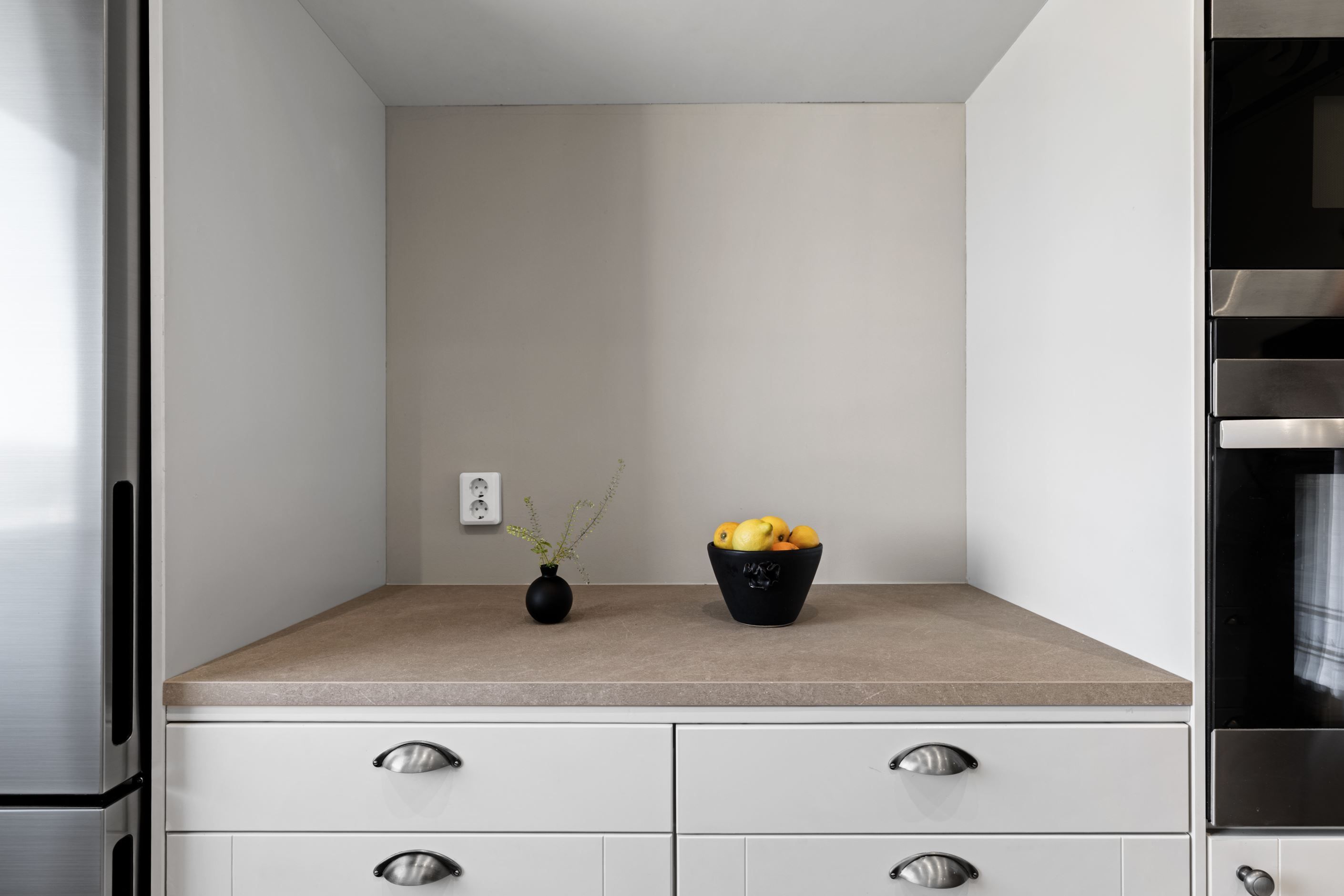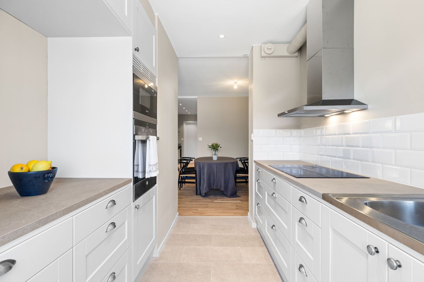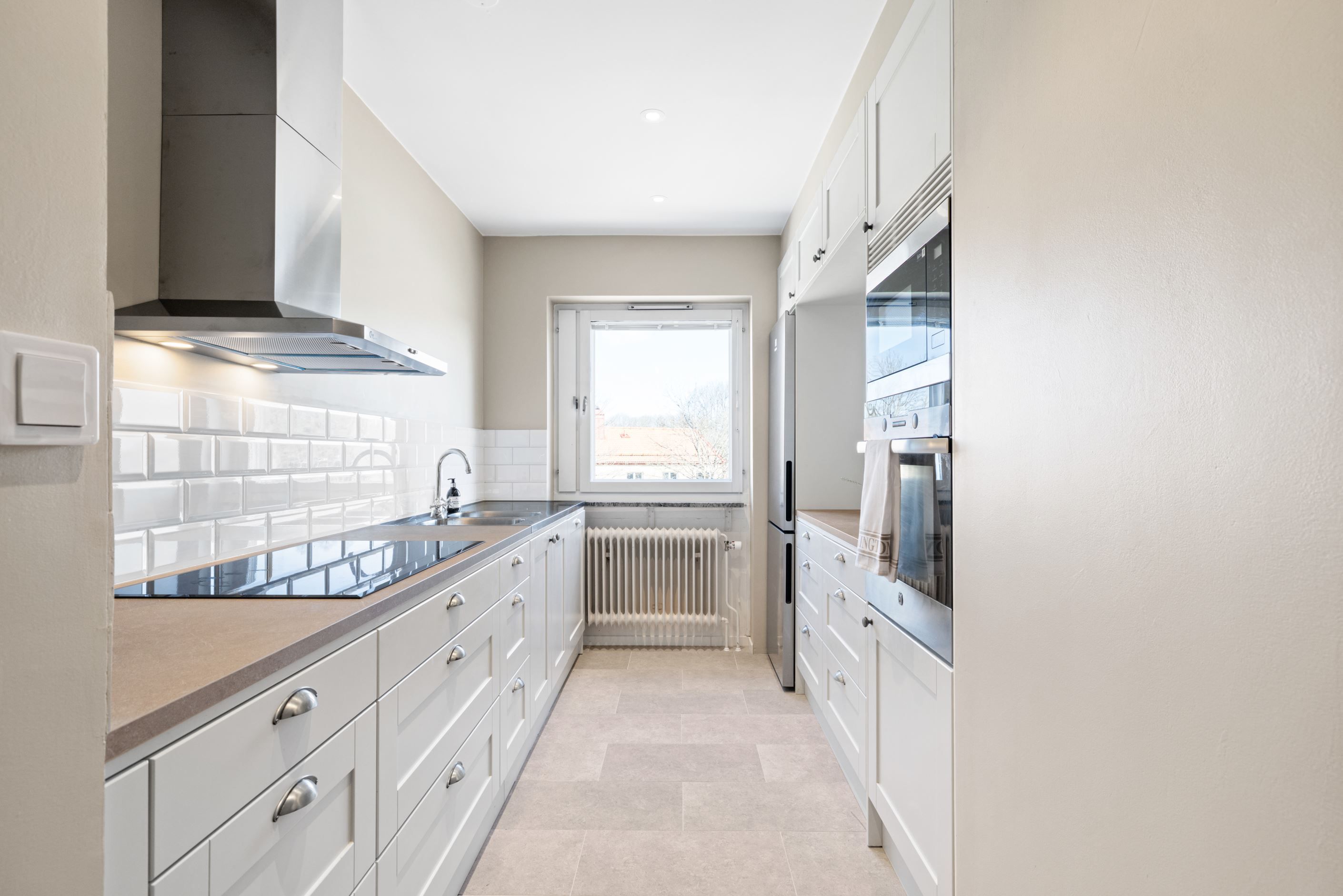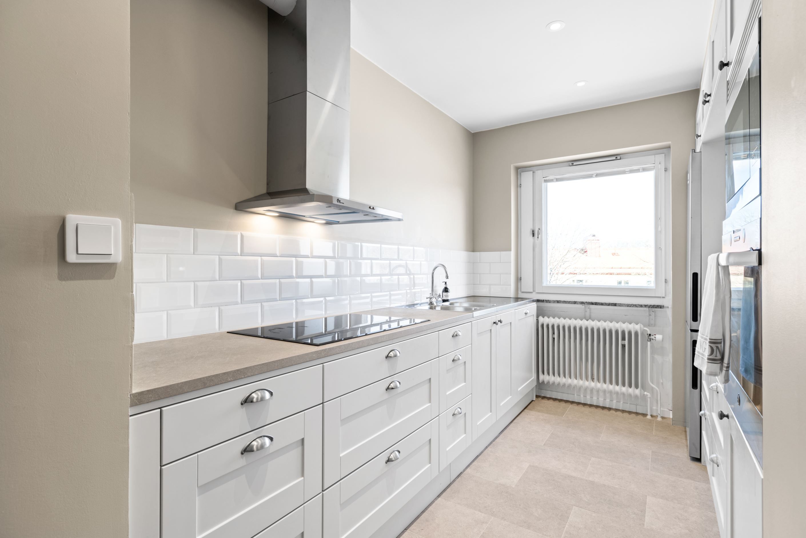 Redan i hallen möts du av stilrent klinkergolv som sedan följer vidare in i både kök och badrum och skapar en snygg röd tråd genom bostaden. Köket från Vedum går i elegant grått och erbjuder både funktion och estetik i perfekt balans. Här finns gott om arbetsyta och förvaring – ett kök att trivas i.