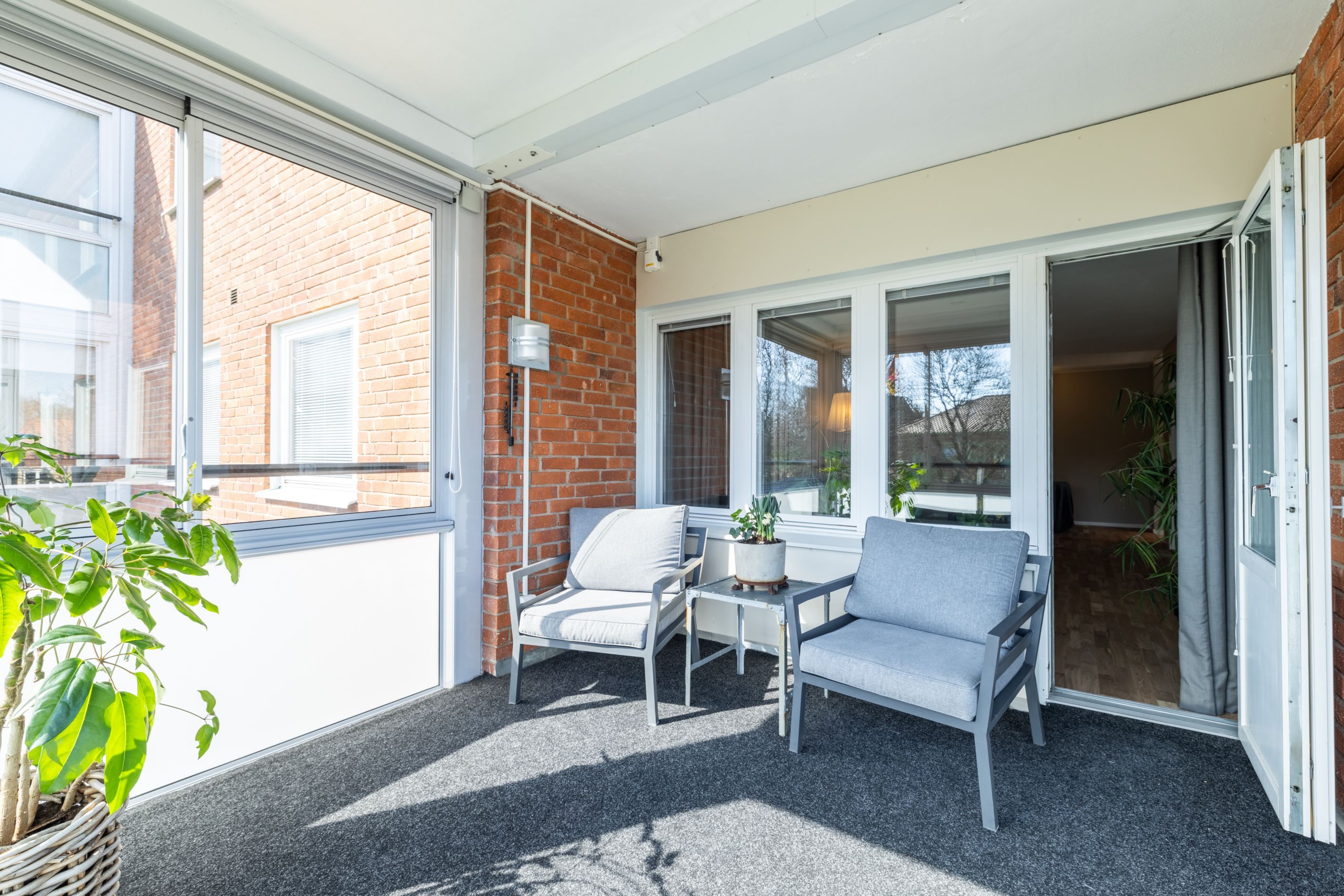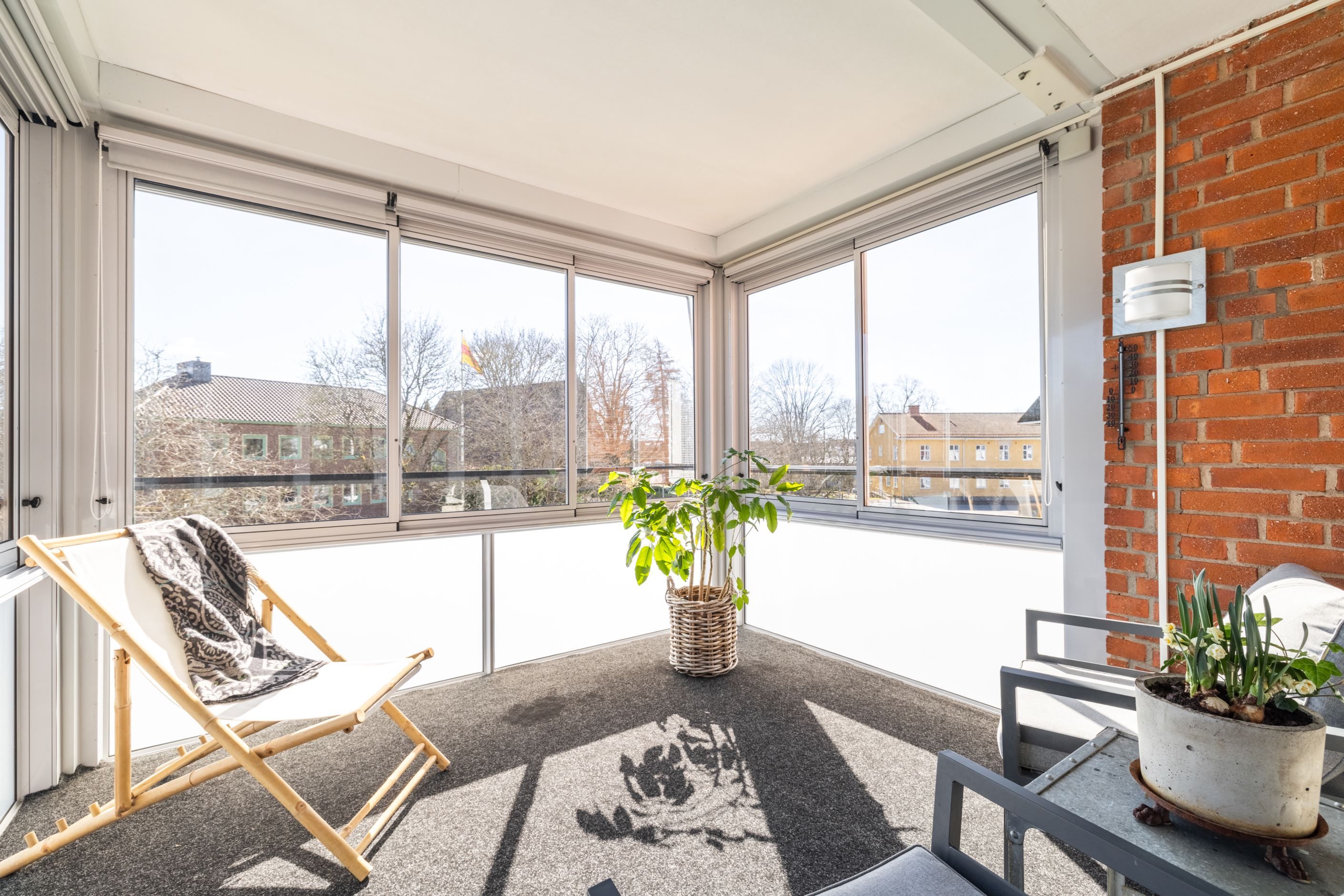 Från bostaden nås den stora inglasade balkongen i sydöstläge – en härlig förlängning av hemmet. Här finns filtmatta, markis och rullgardiner som ger ett behagligt solskydd. Läget är insynsskyddat, vilket ger en privat och lugn miljö att njuta av.