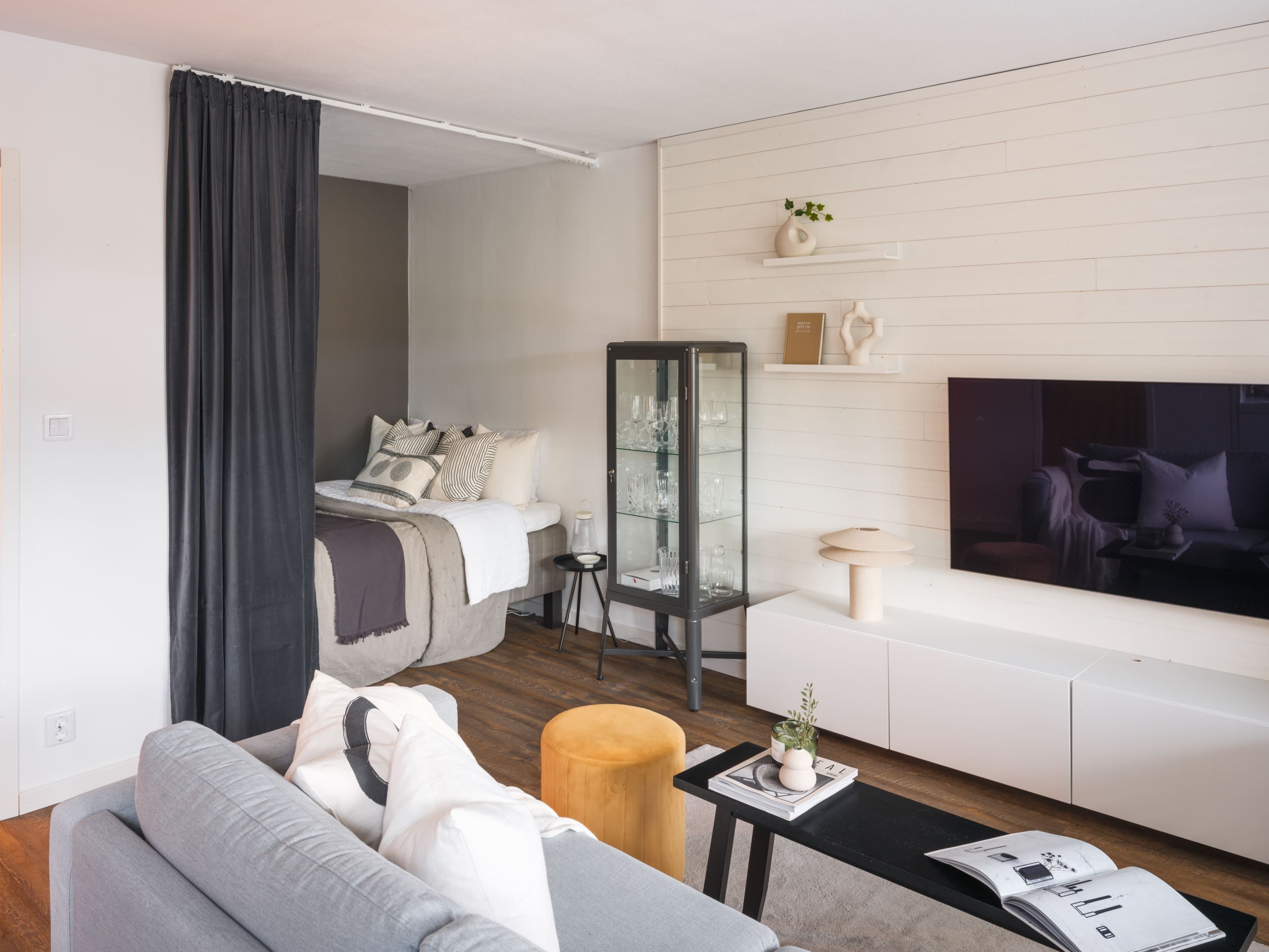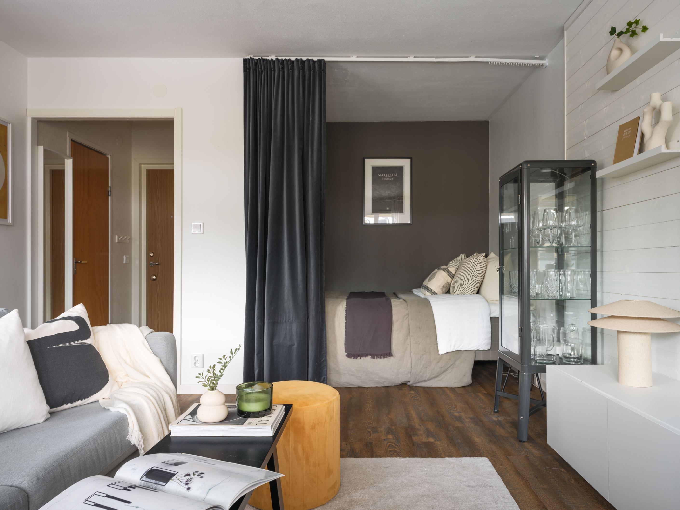 Ett trivsamt, påkostad och välutrustat kök sätter prägeln denna bostad, köket omsluter sedan det välplanerade vardagsrummet, här finns plats för både större soffgrupp samt tv-möblemang och en större säng i alkoven. Trevliga fönsterpartier samt utgång till rymlig och inglasad balkong i väster.