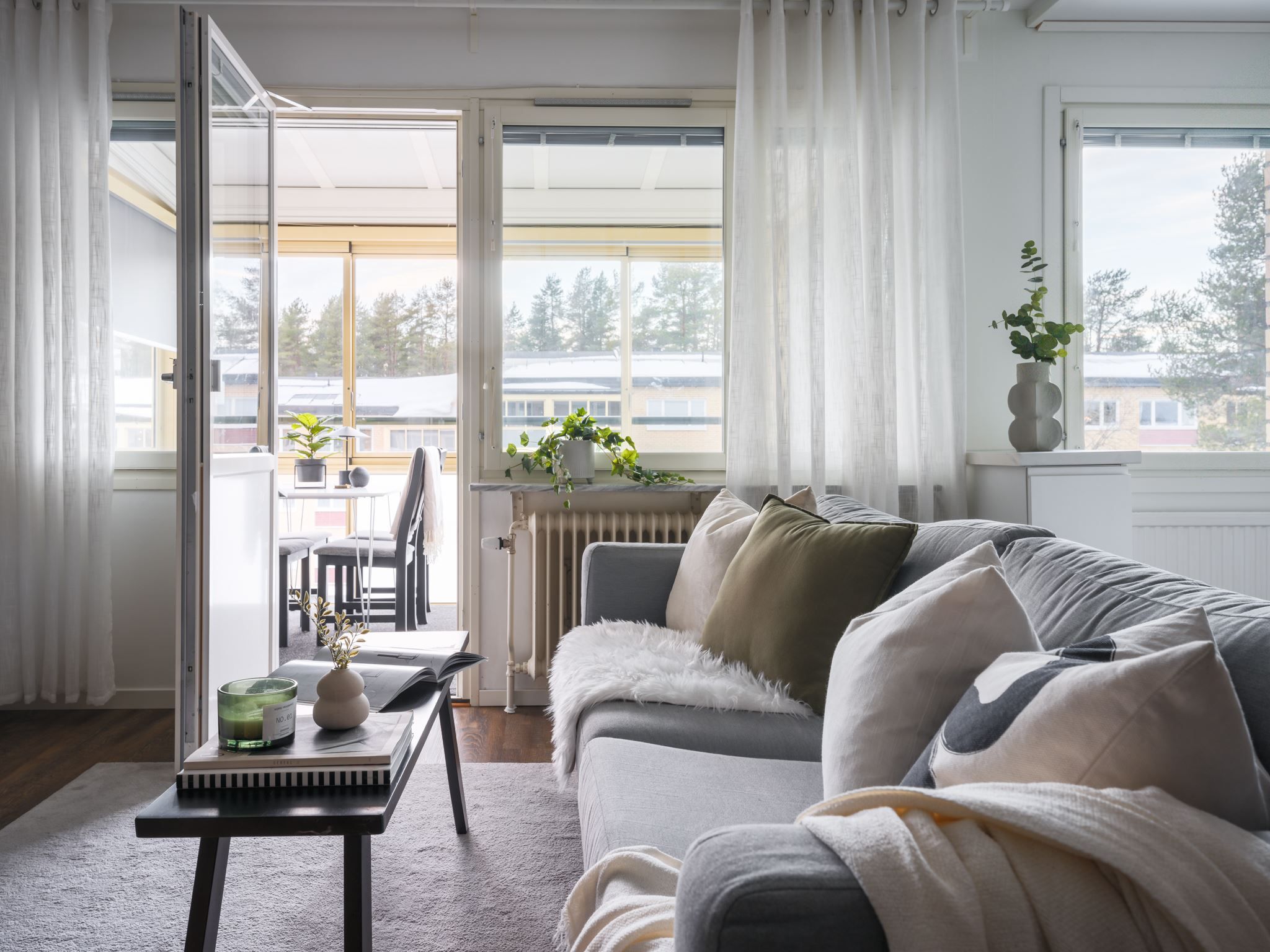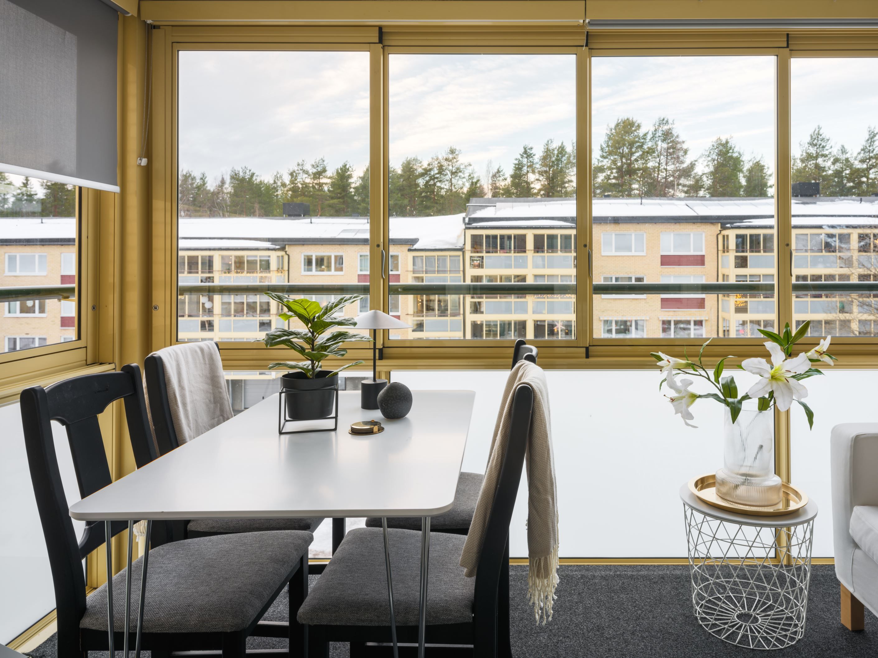 Den inglasade balkongen är något utöver det vanliga! Inglasningen gör att du kan förlänga säsongen utomhus och ger dig ett extra rum. Tack vare bostadens placering i huset har du här en plats fri från insyn och med härlig utsikt över området.