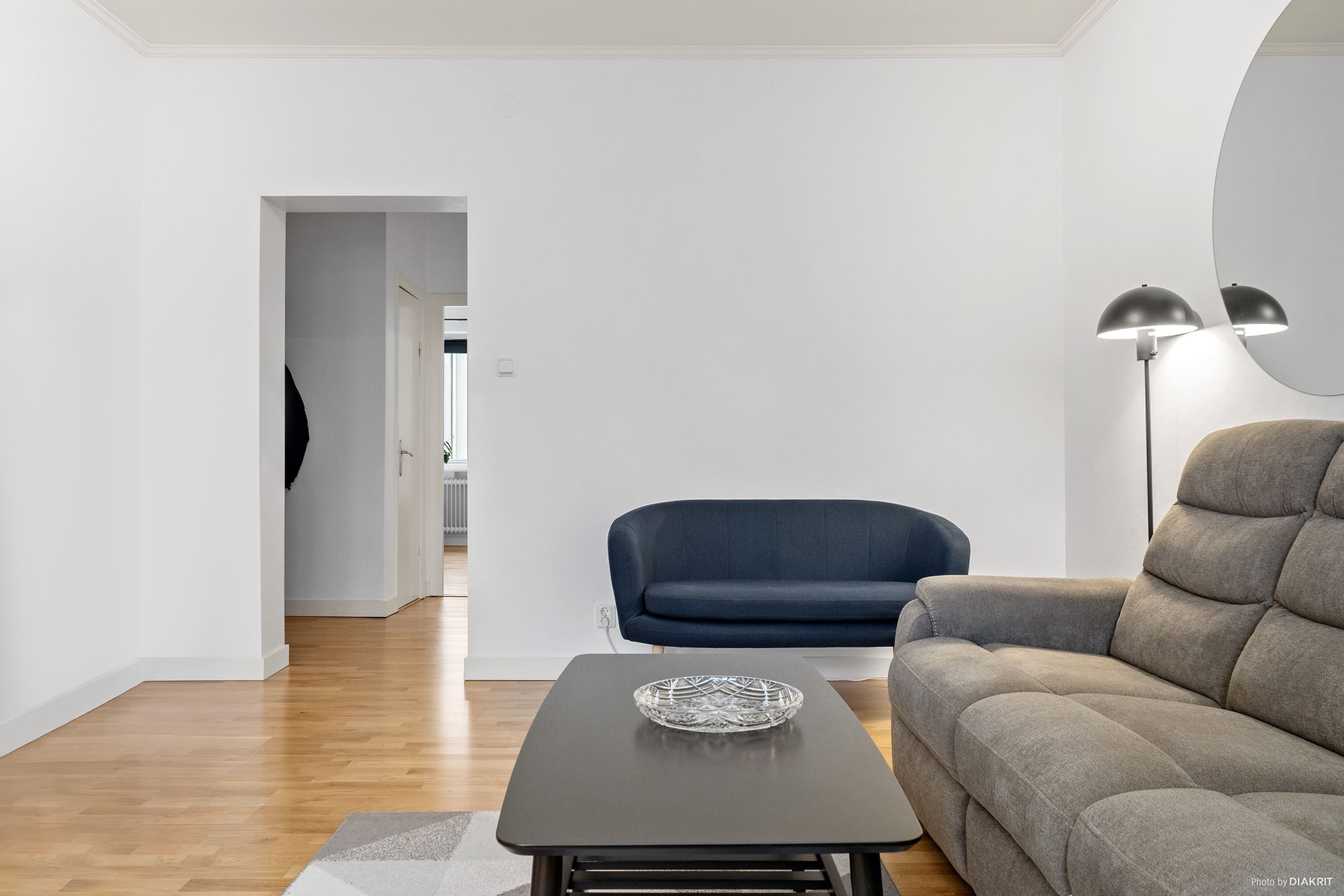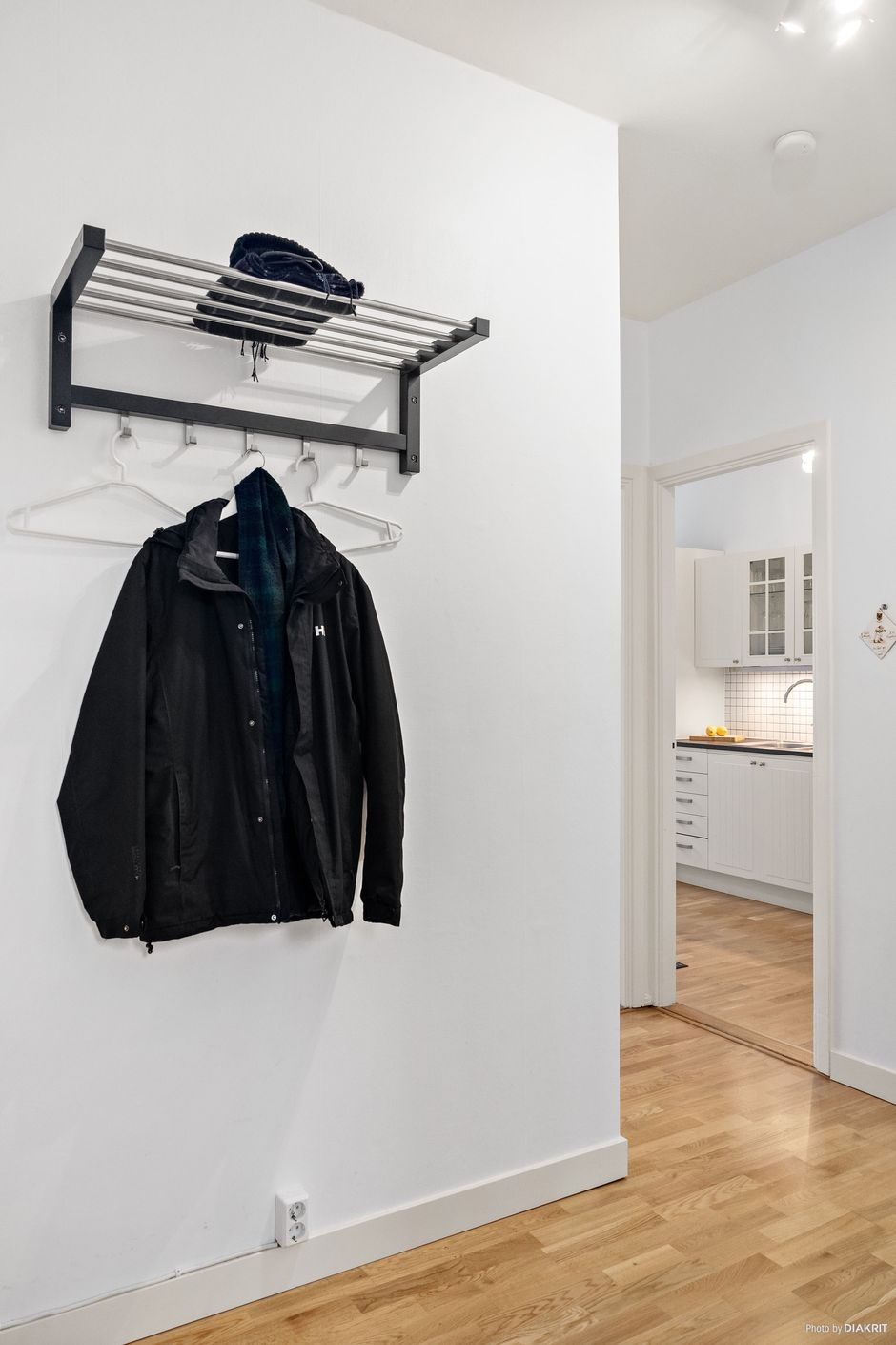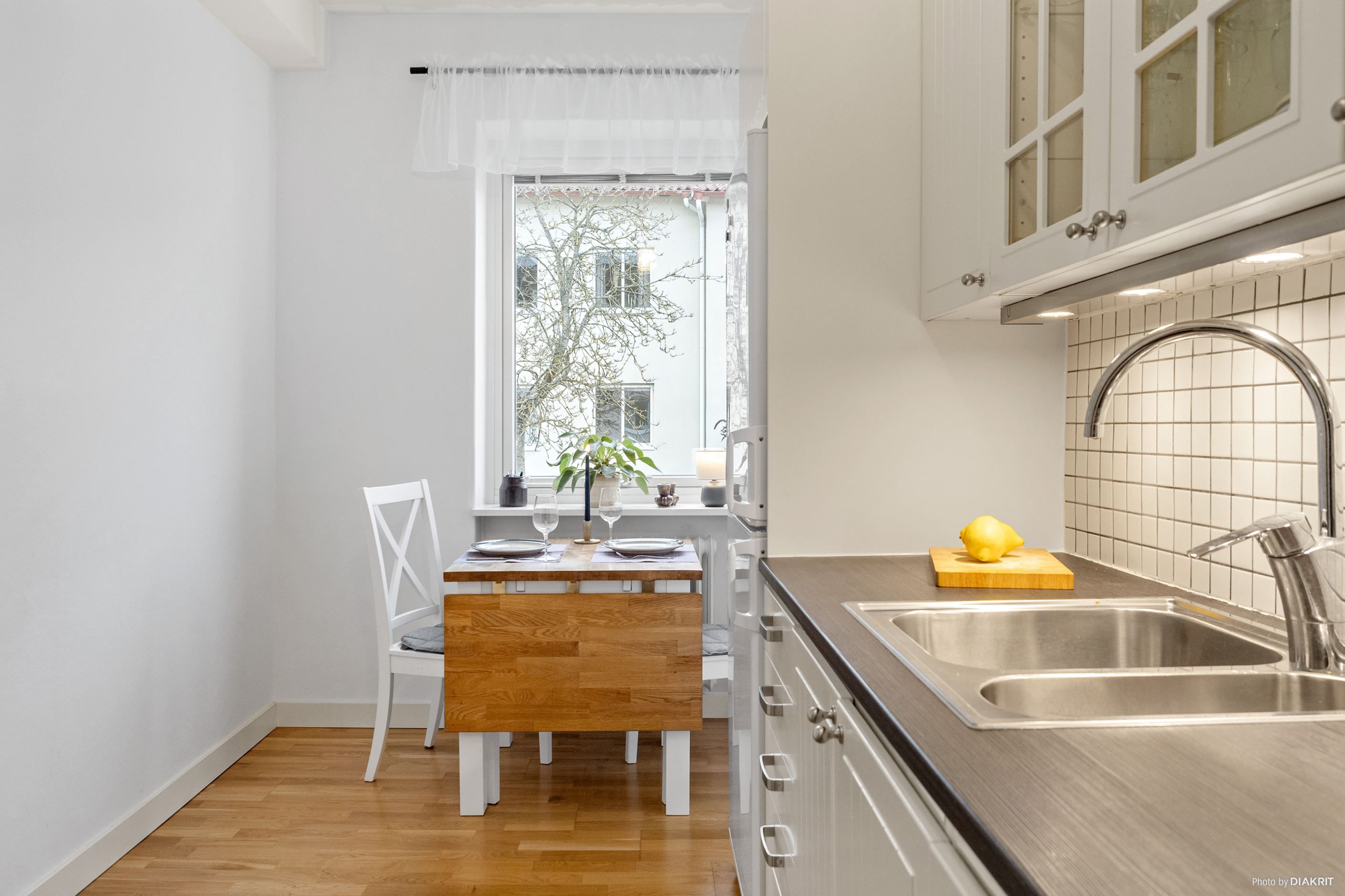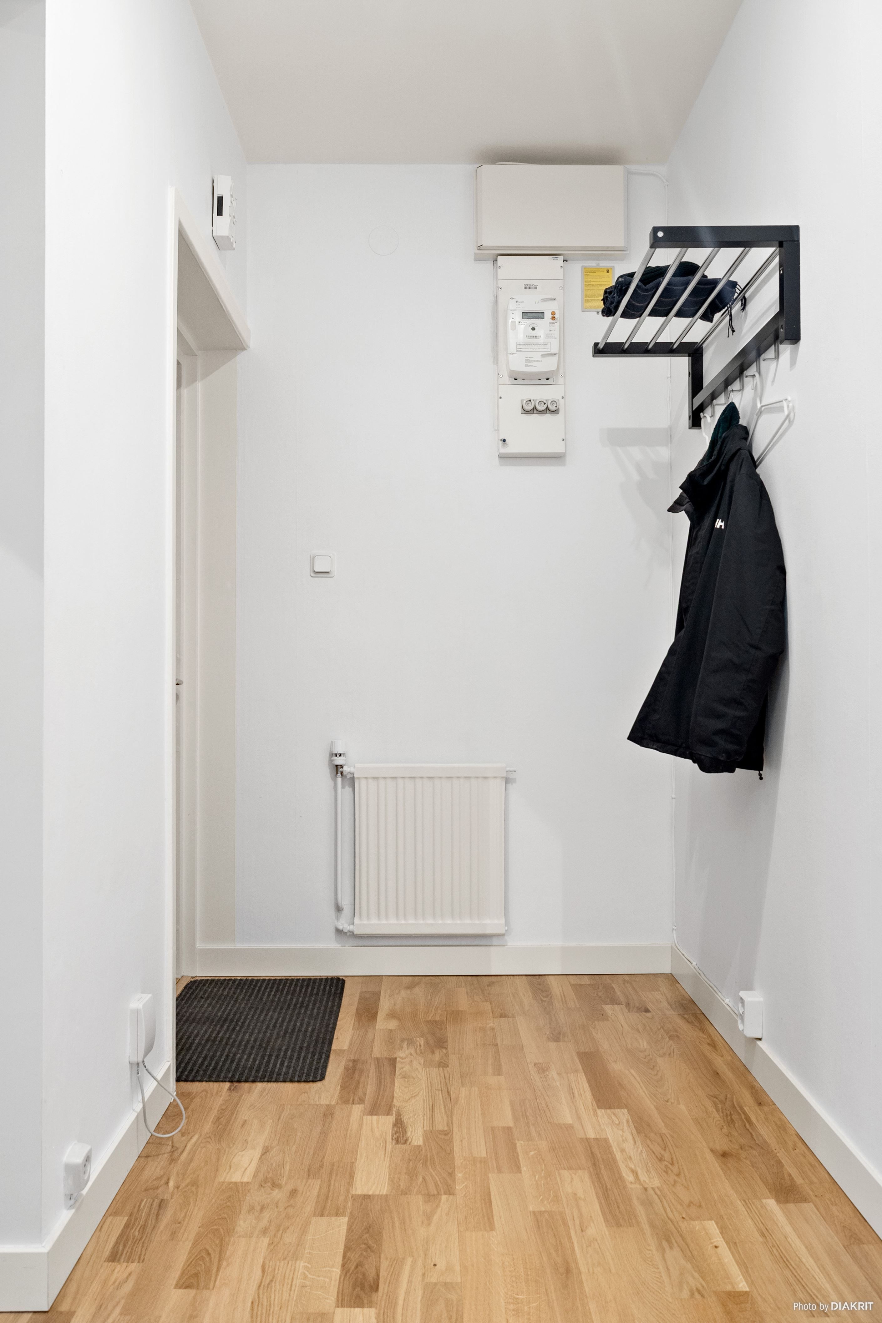Bostaden erbjuder en praktisk hall med klädkammare, rofyllt sovrum mot innergården samt ett mysigt kök med matplats vid fönstret. Vardagsrummet är rymligt och lättmöblerat med plats för både soffgrupp och matbord.