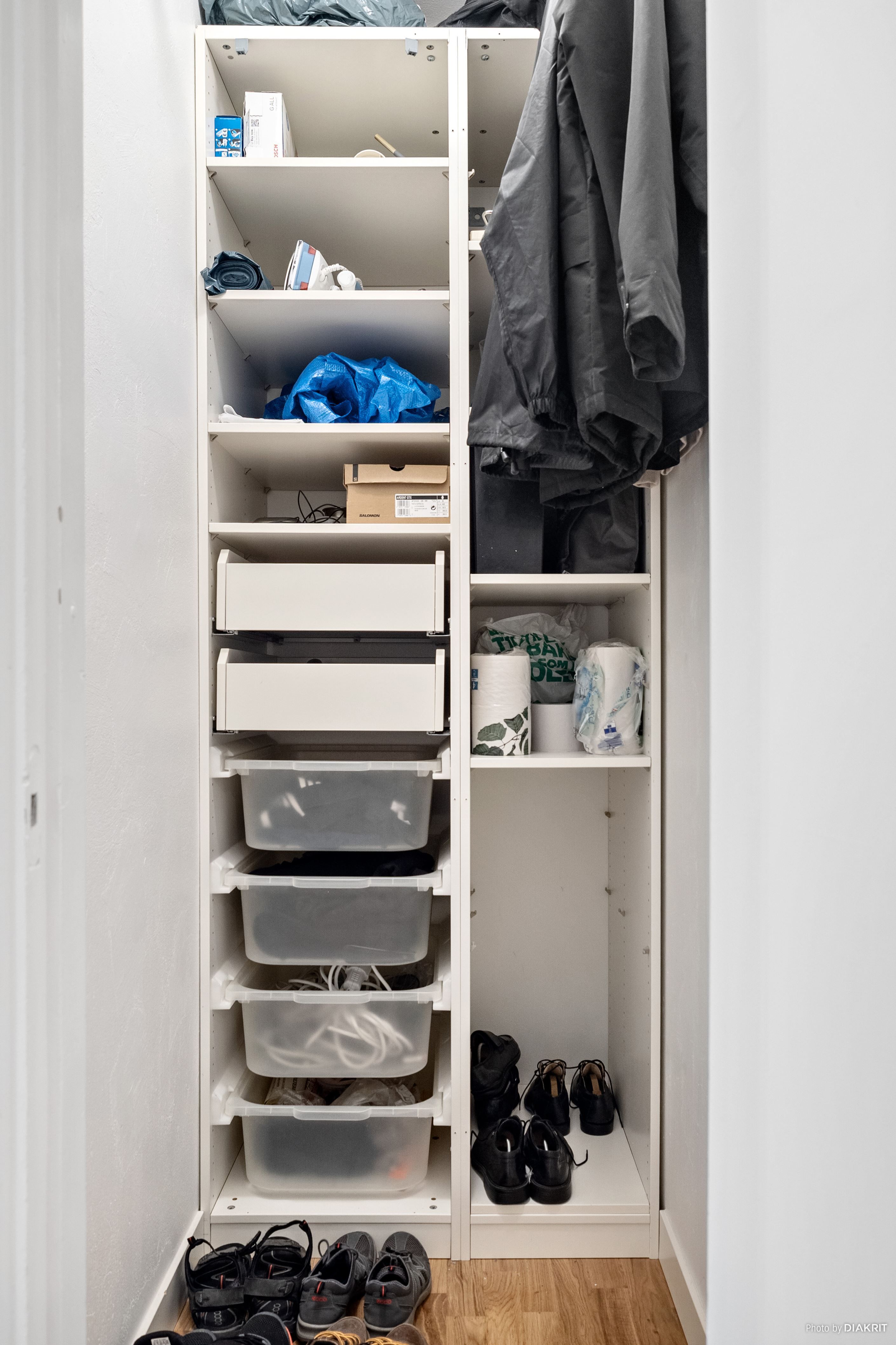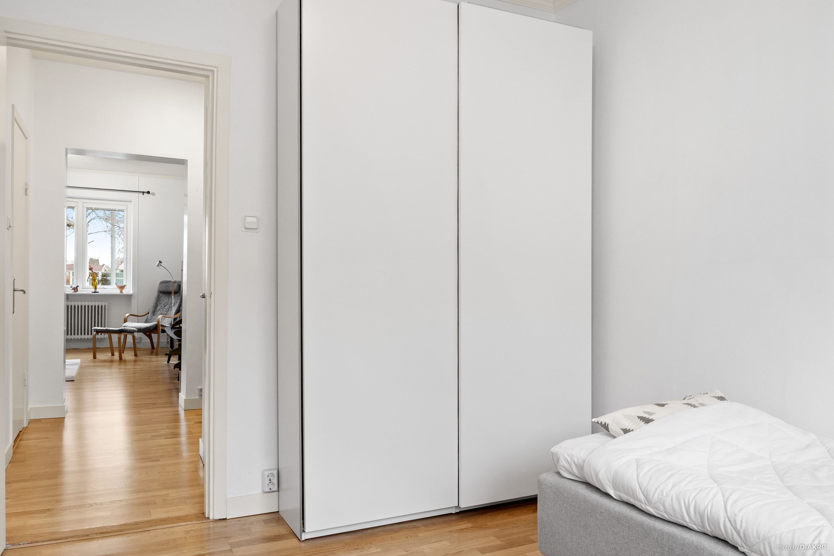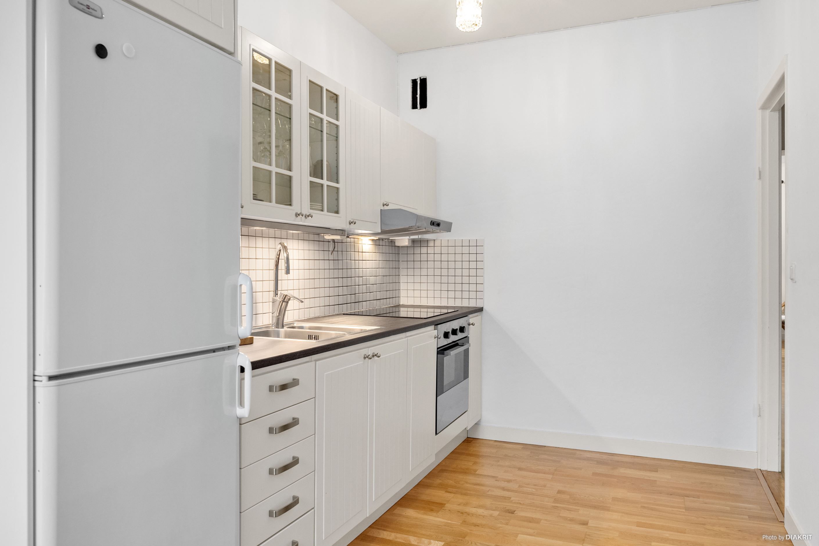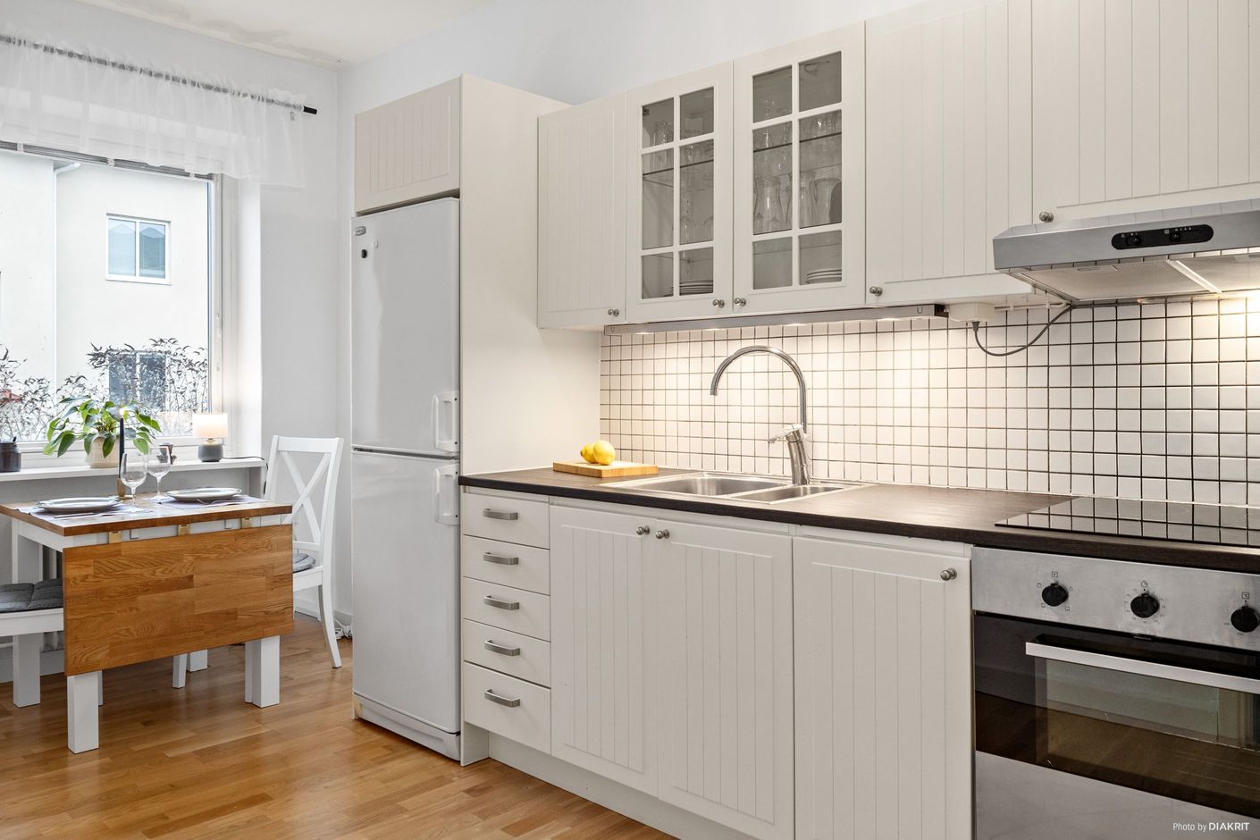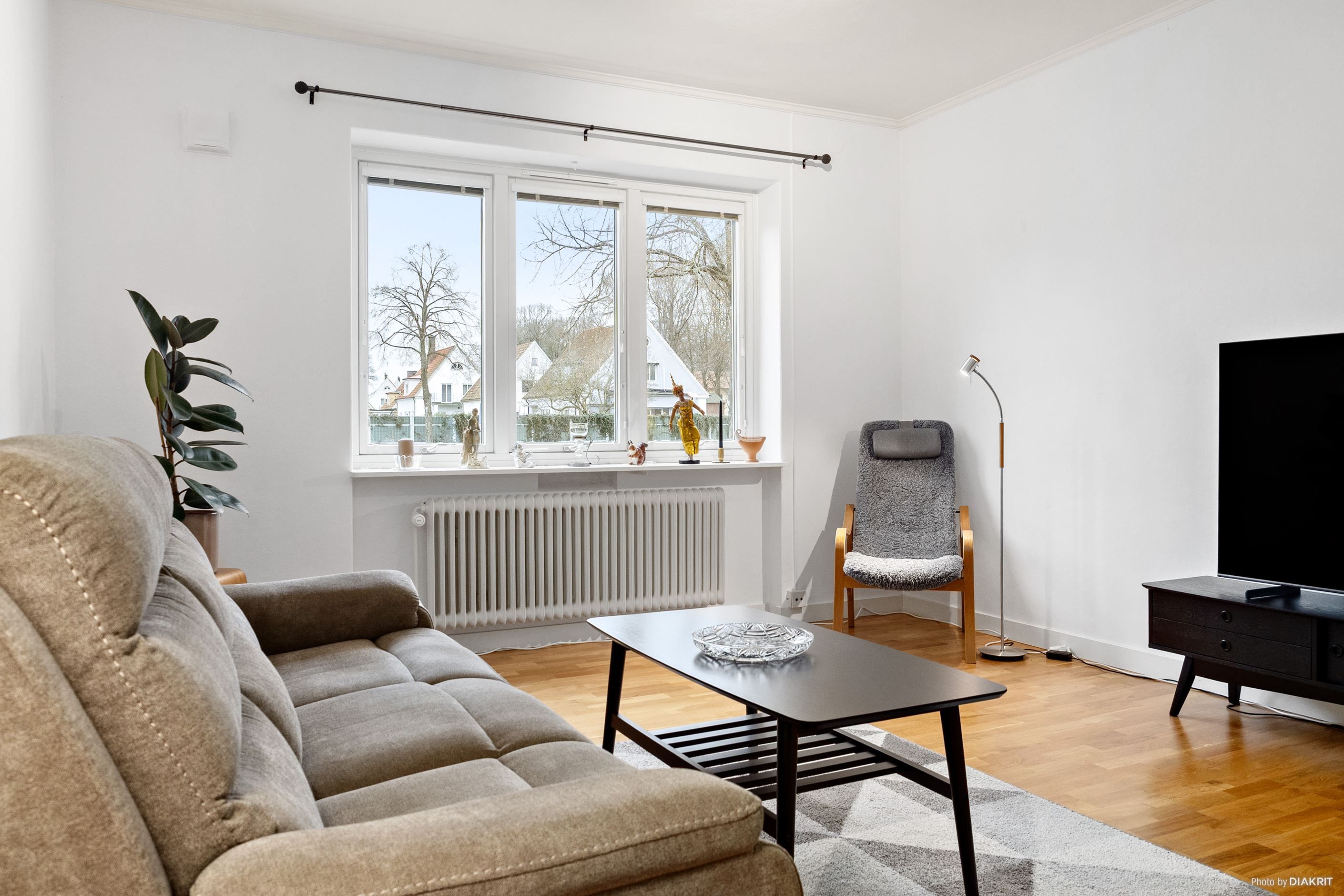 Bostaden erbjuder en praktisk hall med klädkammare, rofyllt sovrum mot innergården samt ett mysigt kök med matplats vid fönstret. Vardagsrummet är rymligt och lättmöblerat med plats för både soffgrupp och matbord.