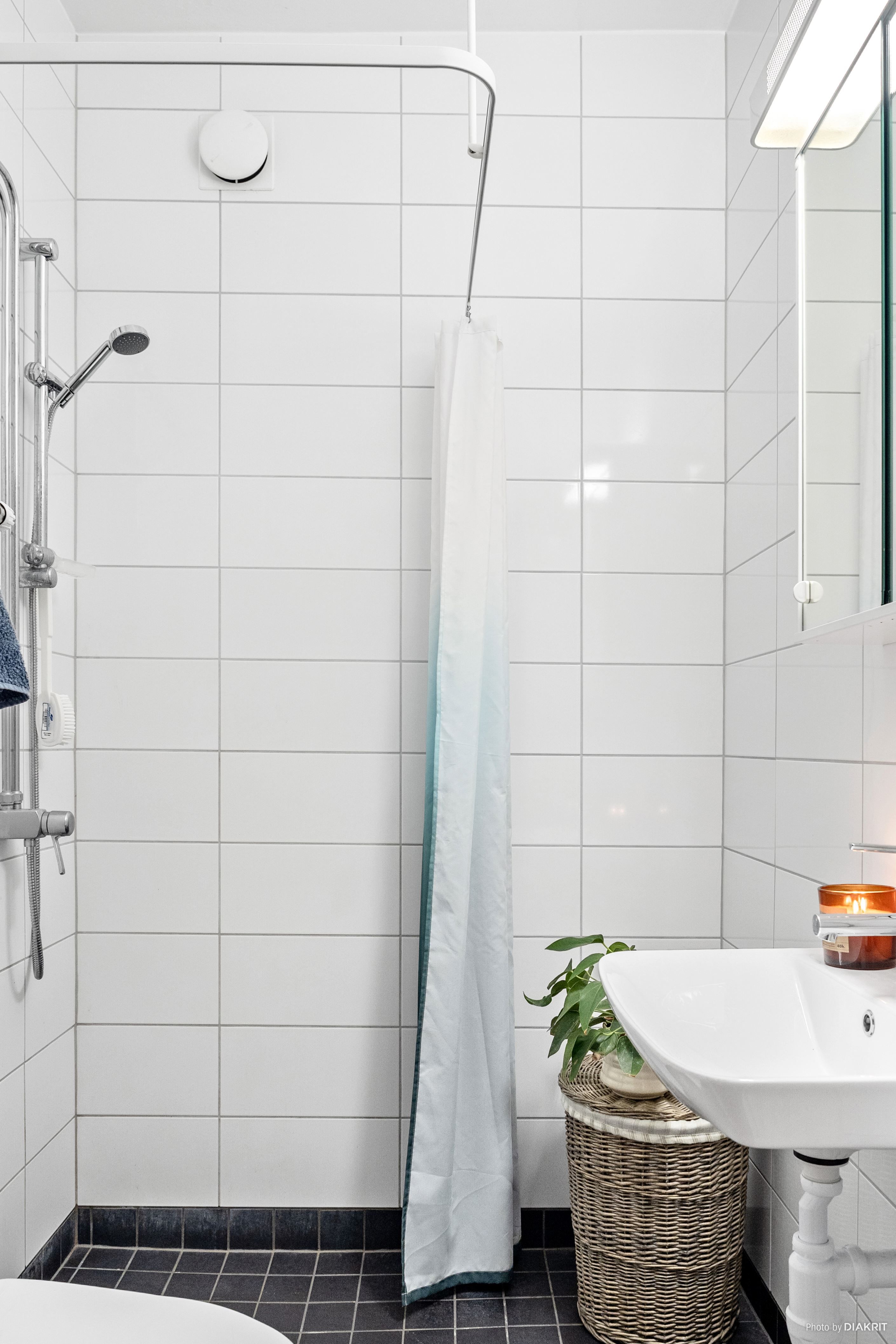 Lägenheten renoverades 2020 med nytt golv, målade väggar och ett stilrent helkaklat badrum.