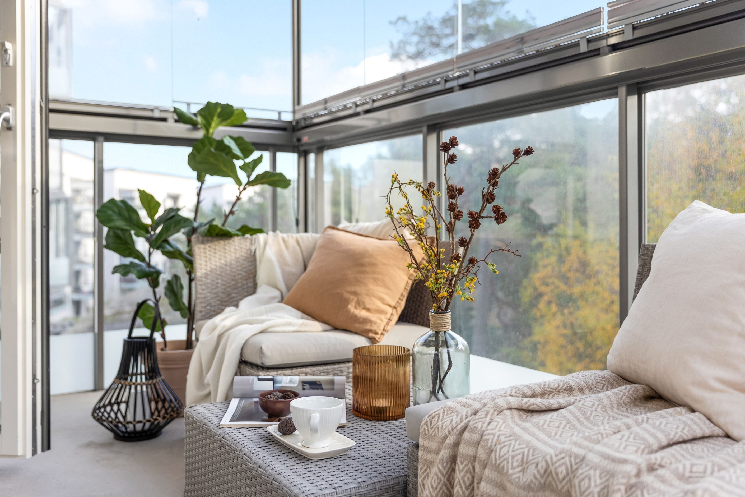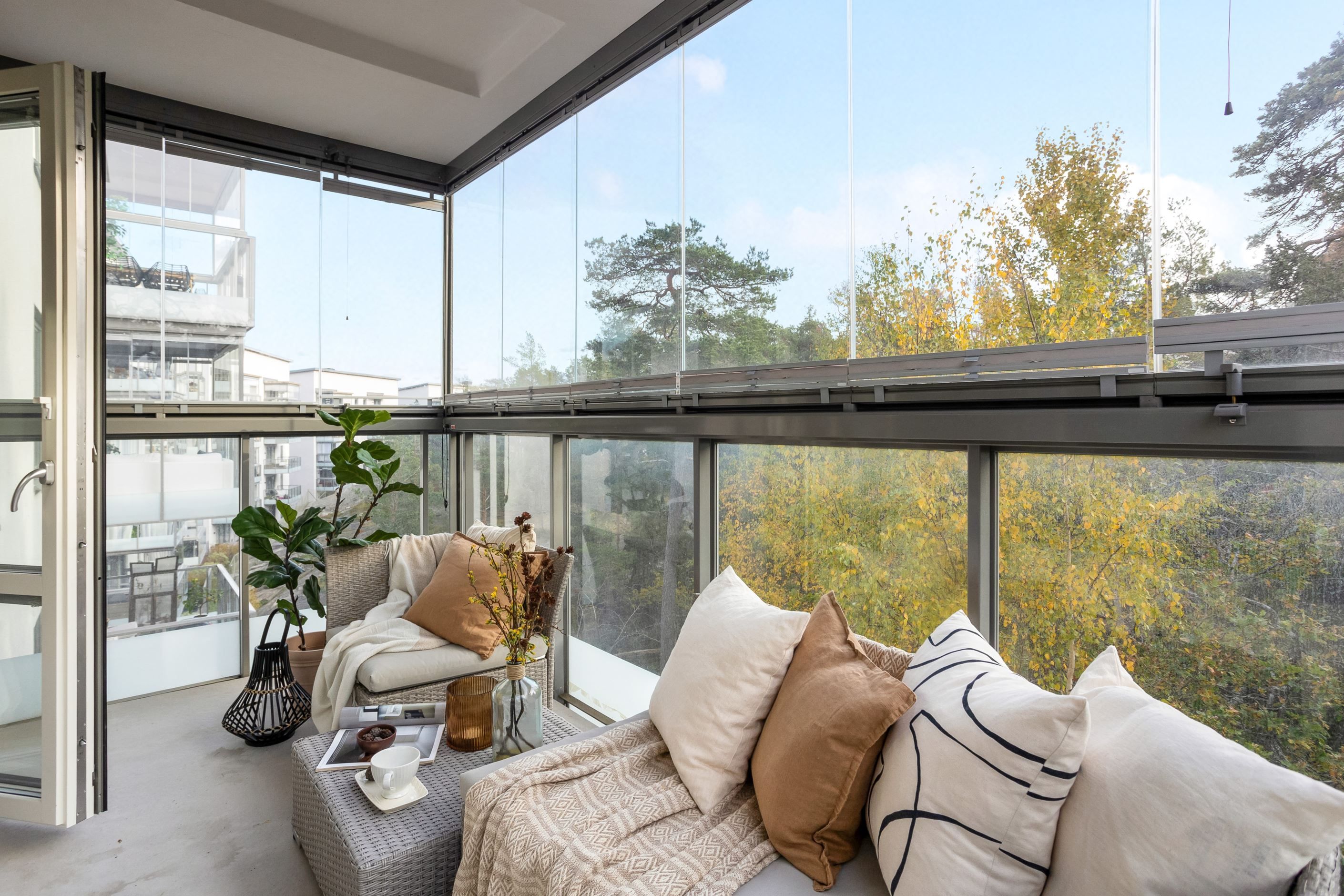 Sammantaget ett härligt boende med fin vy över Bromma med omnejd samt närbelägen skogsdunge och lugn villaidyll. Den inglasade balkongen är stor nog för möblemang och odling, för den som har intresse. Den utgör ett tilltalande uterum den varma årstiden och håller med "vardagslyx". Sammantaget en välbelägen och mycket trivsam lägenhet. Nyskickskänsla i stilrena fastigheter som torde vara bekymmersfria i många år framöver.