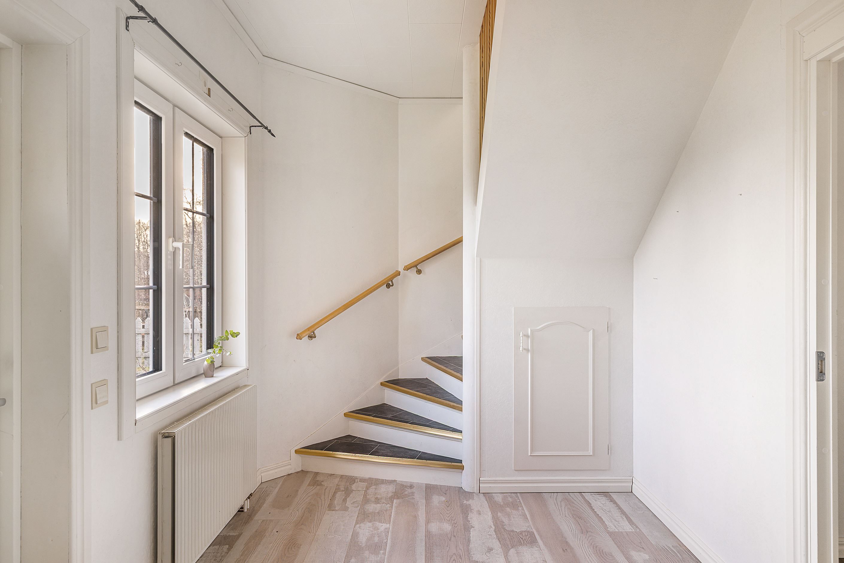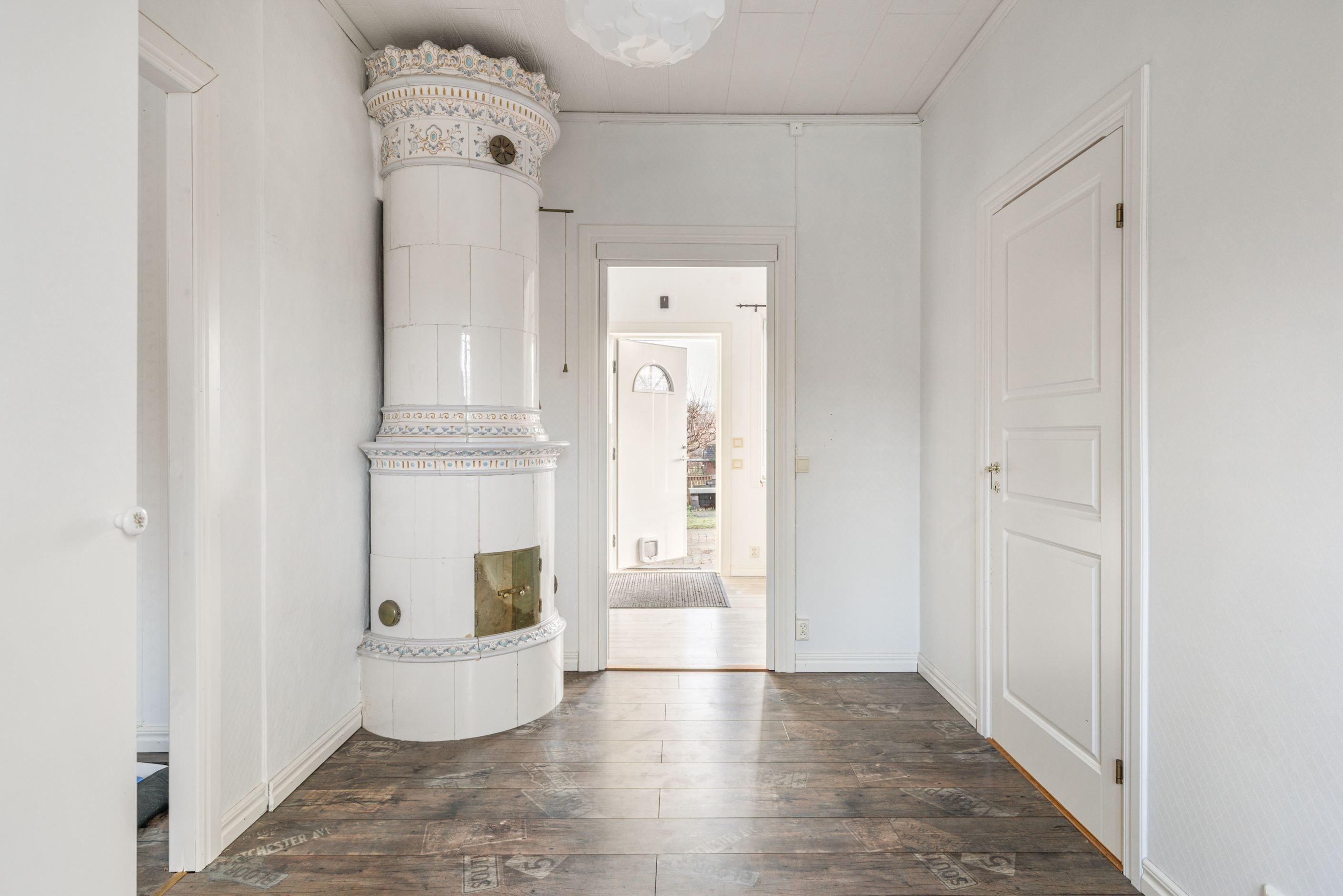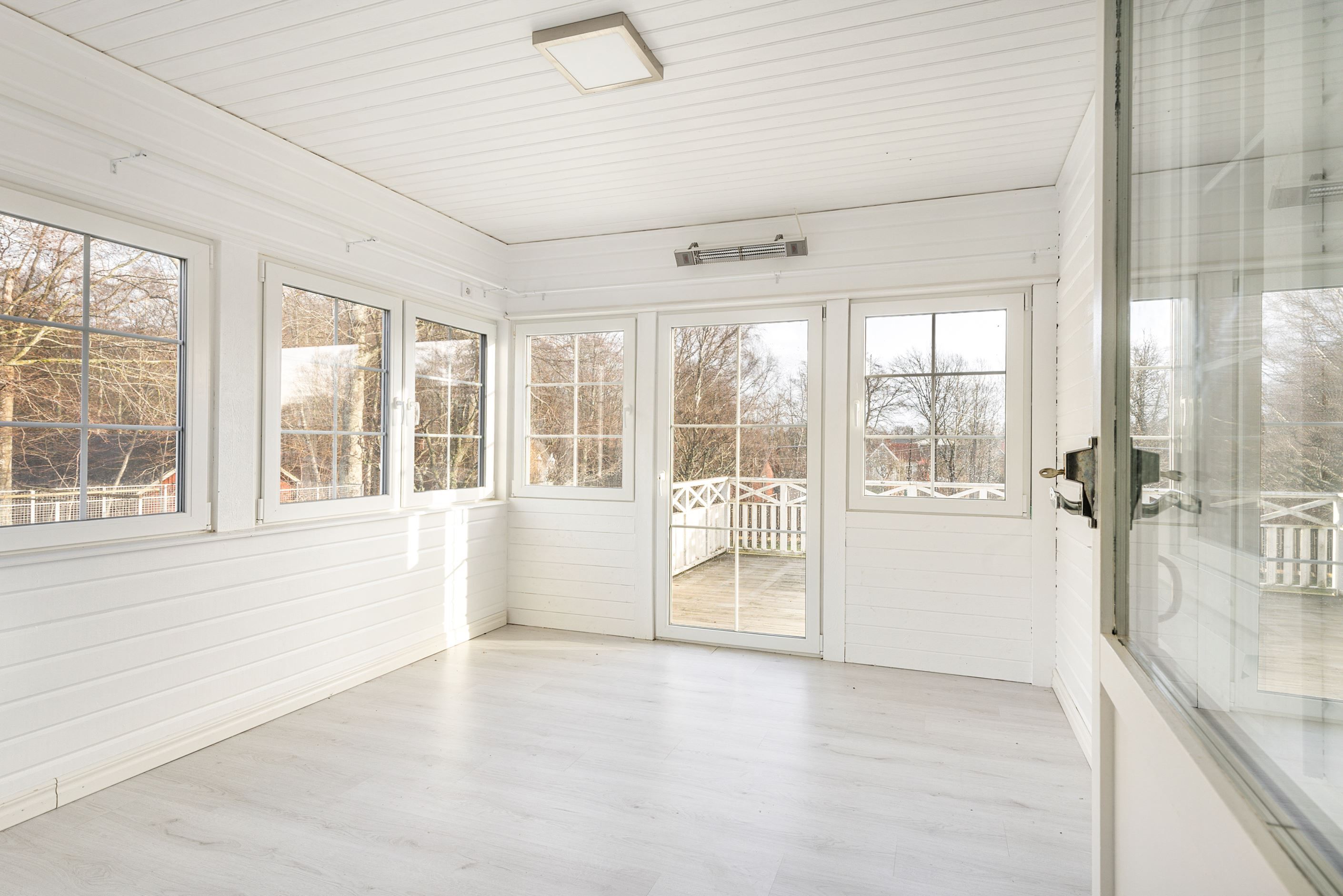 Entrén välkomnar med laminatgolv och målade väggar. Hallen leder vidare in i bostaden och har utgång till ett isolerat uterum med altan utanför, en trevlig förlängning av boendet större delen av året.
