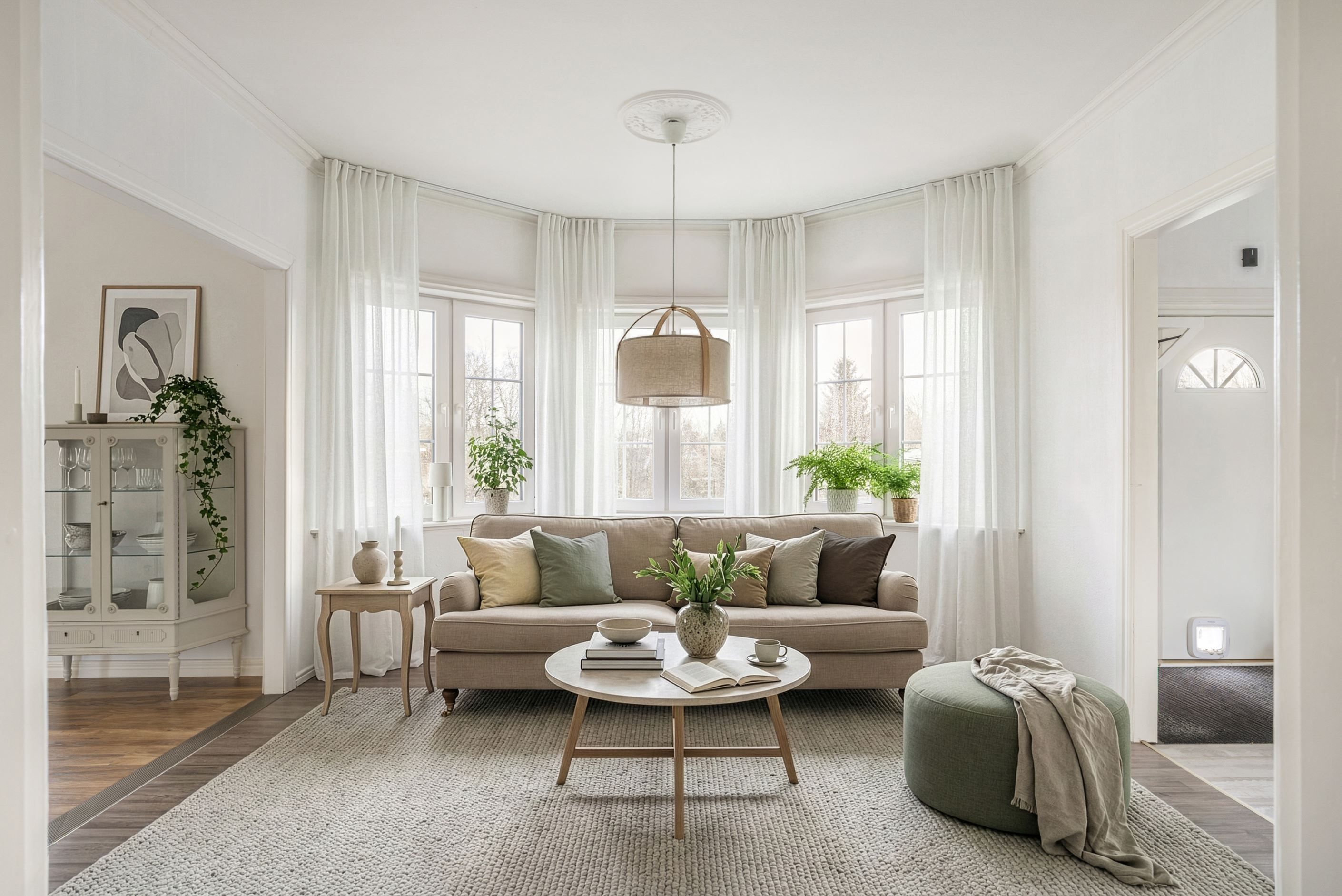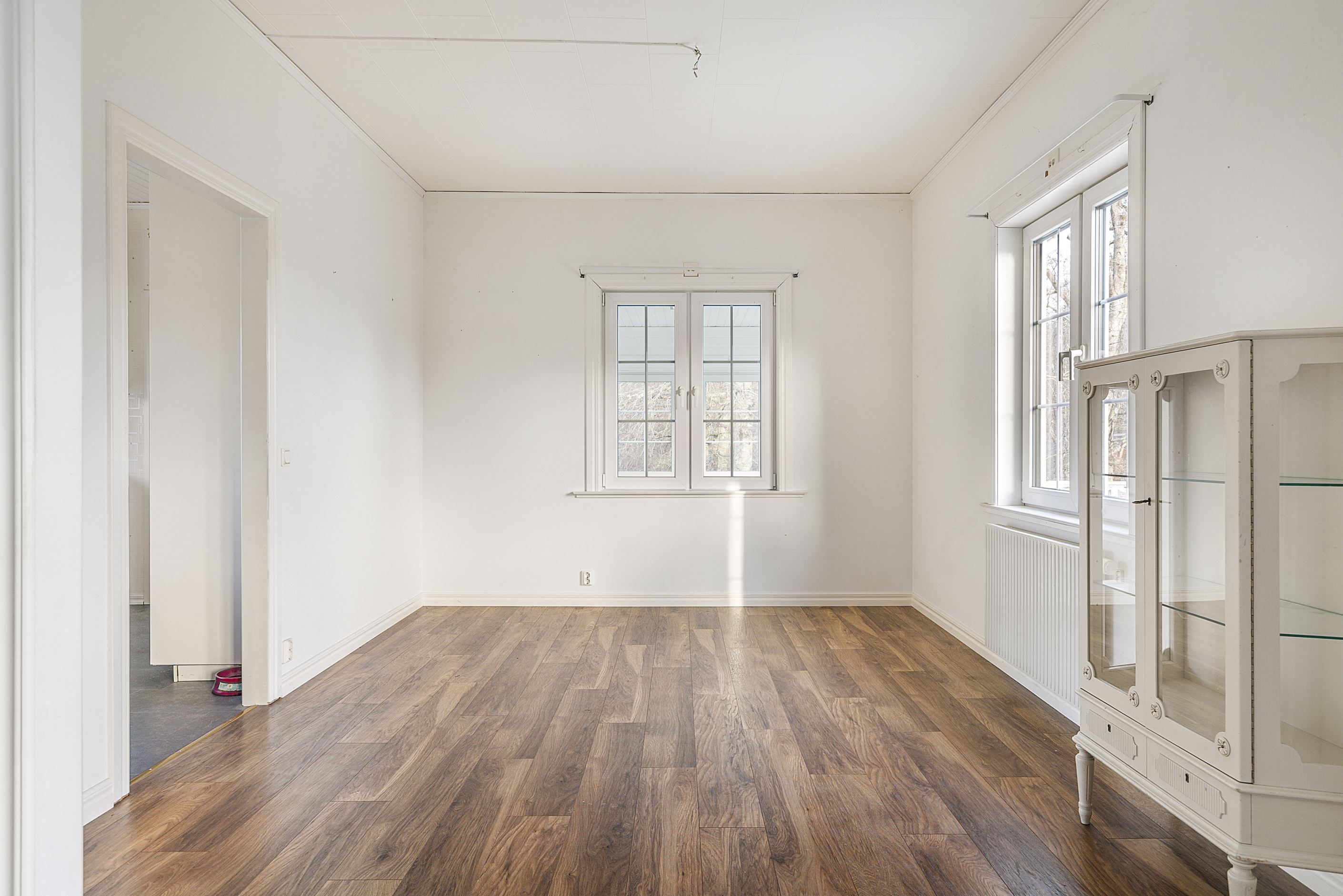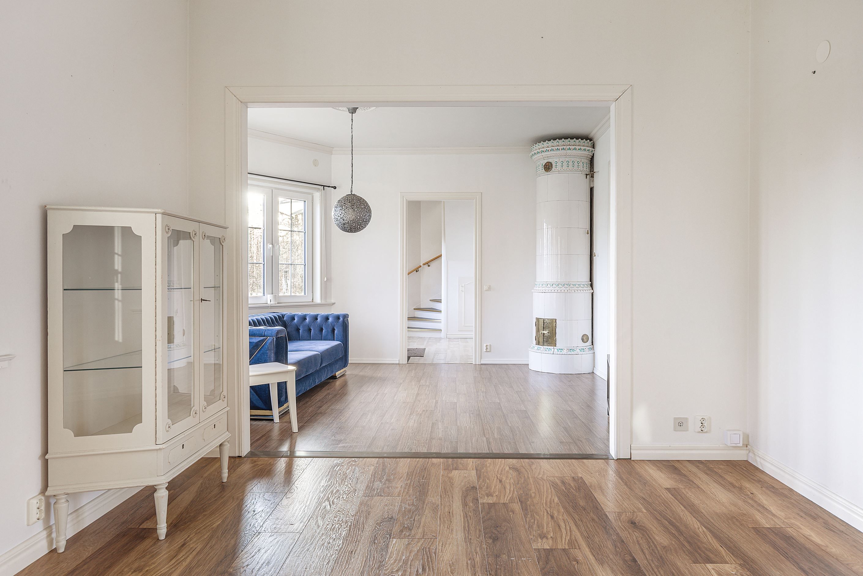 Vardagsrummet är rymligt och ljust med laminatgolv och målade väggar. Här finns även en kakelugn (eldningsförbud) som bidrar med charm.