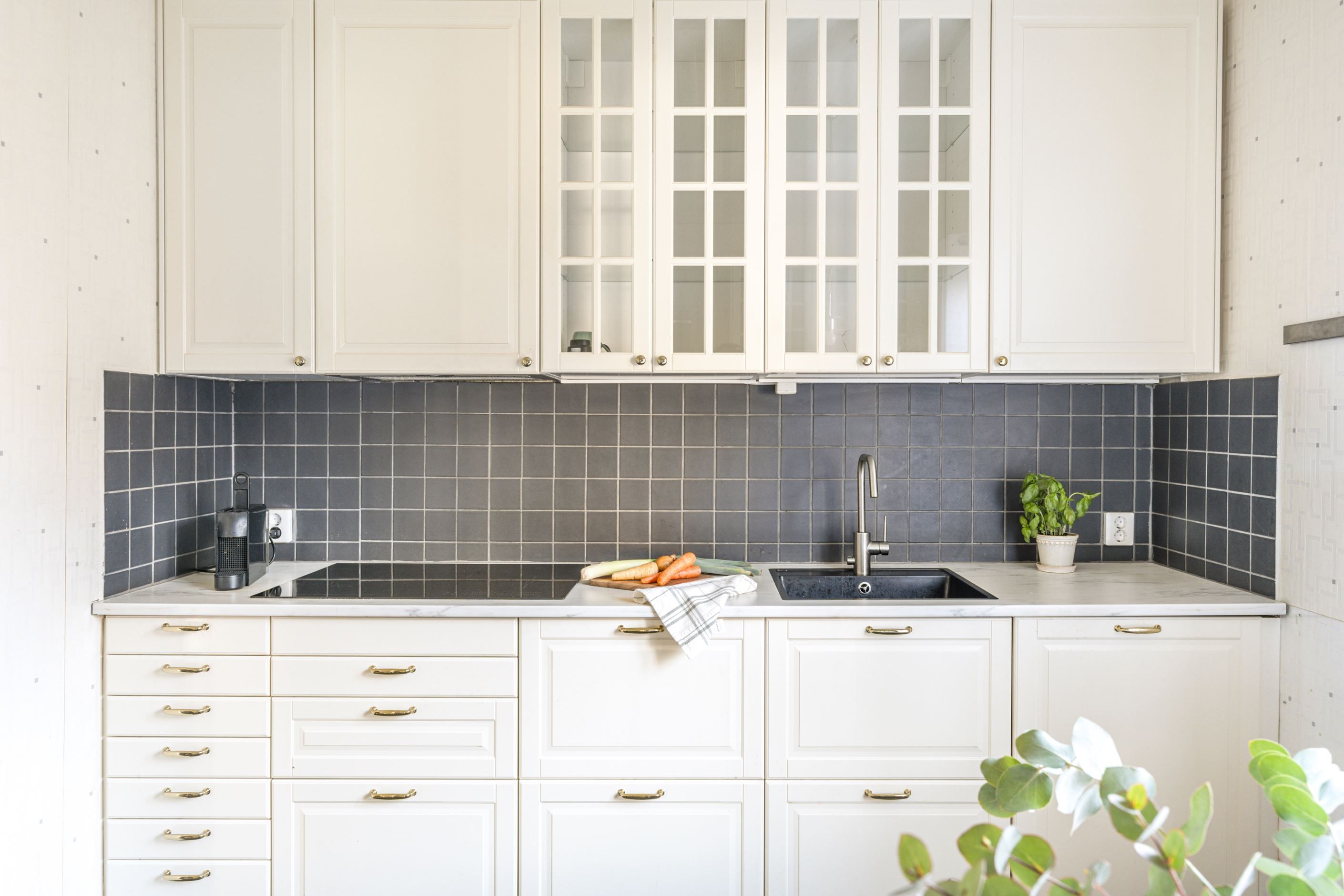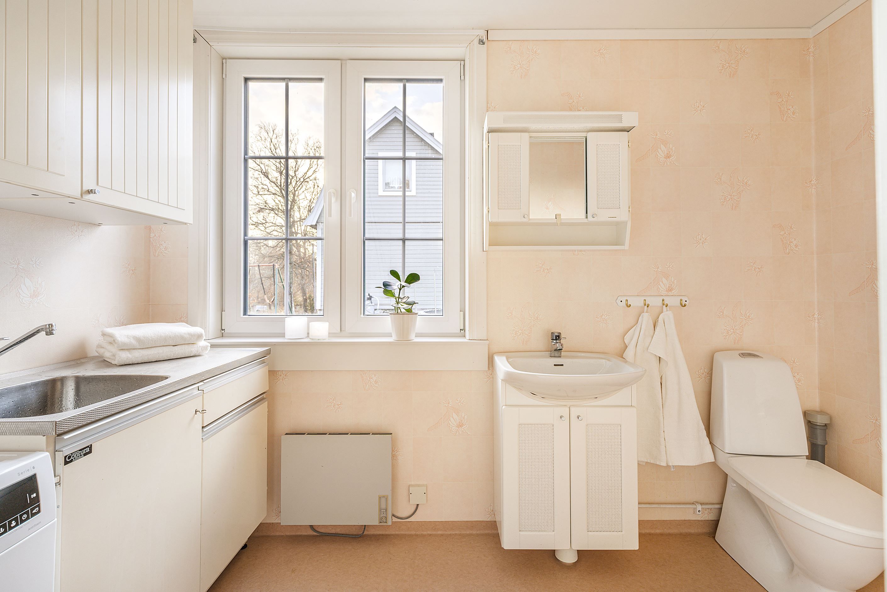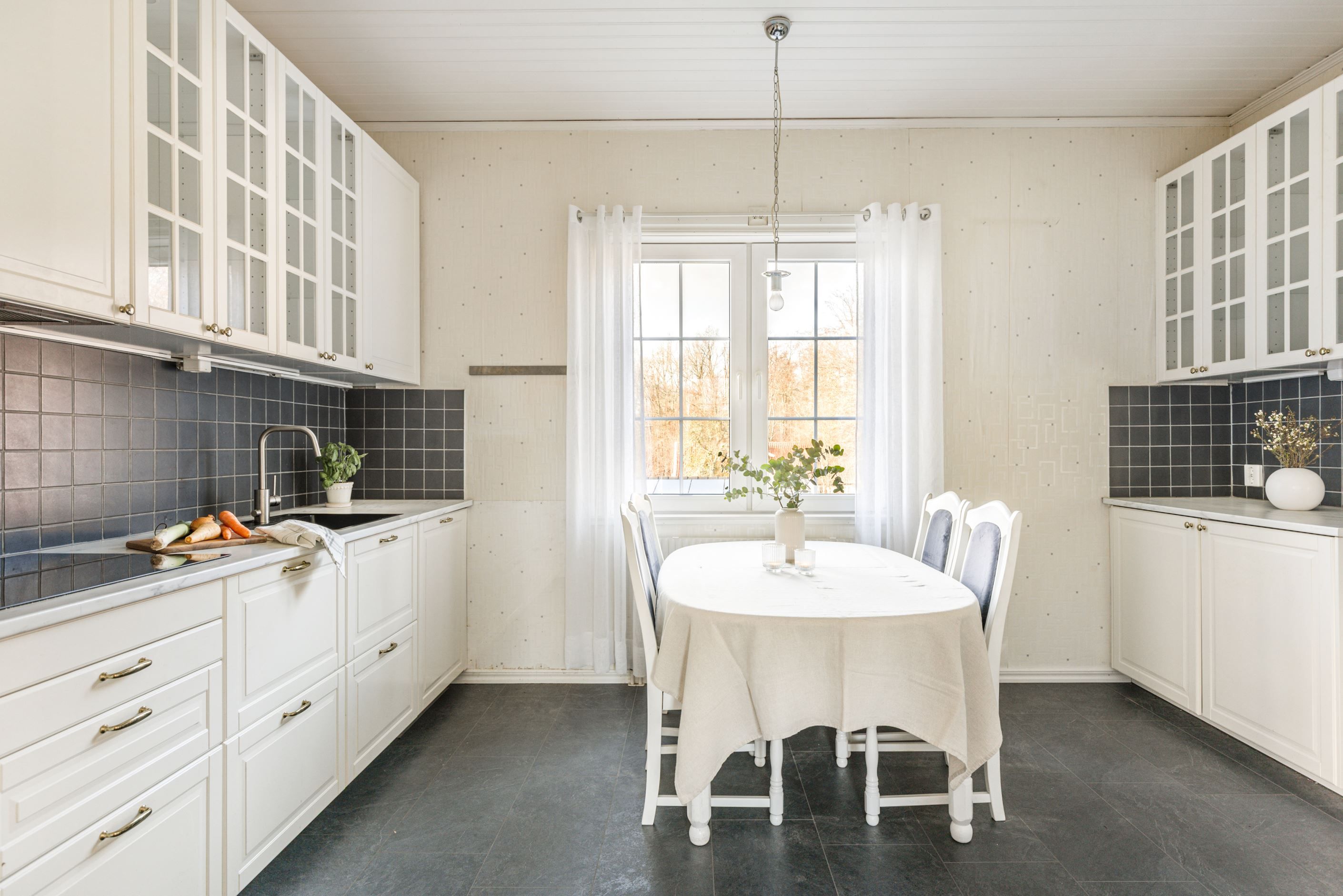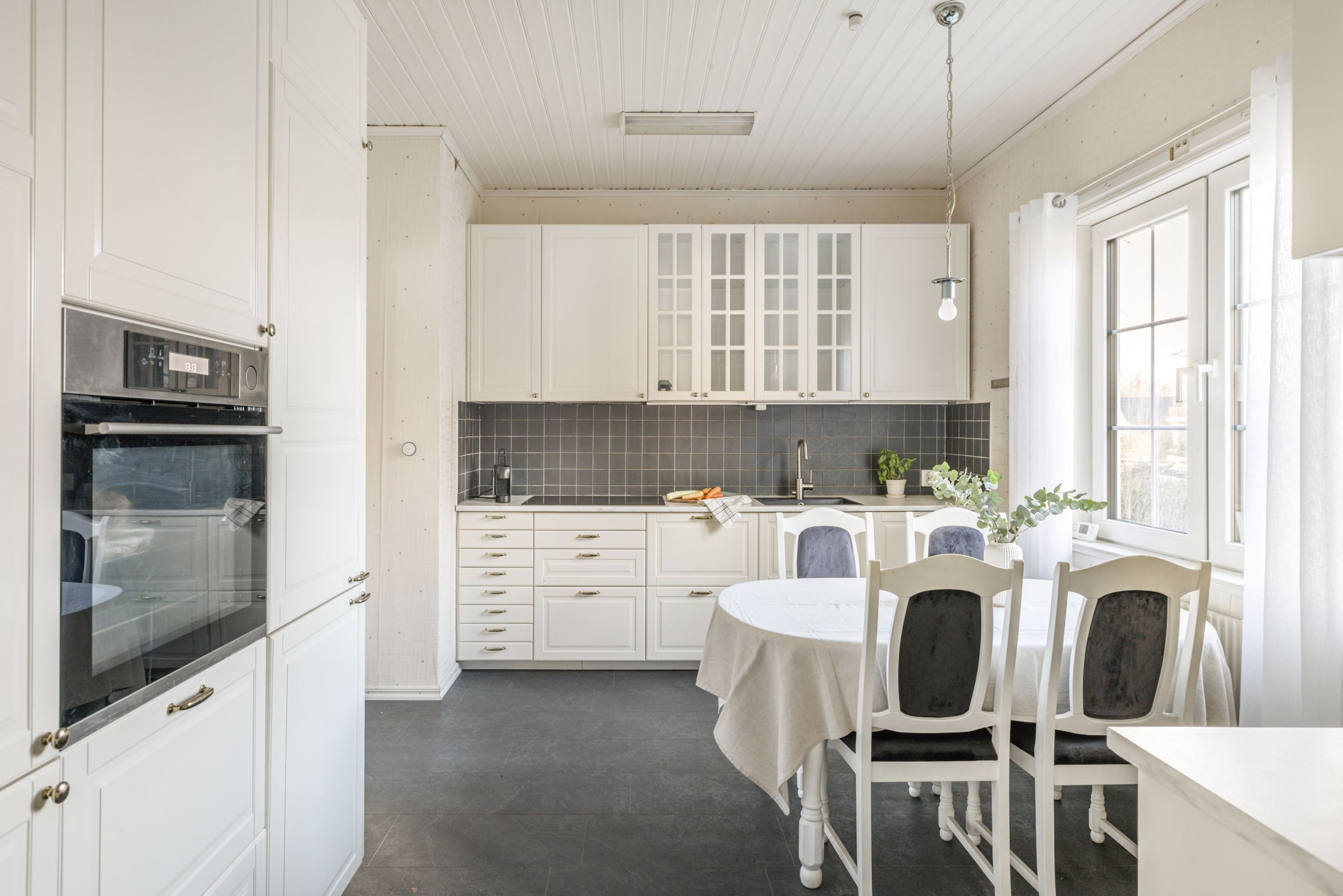 Köket är funktionellt utformat med laminatgolv, tapetserade väggar, inbyggd kyl och frys, ugn, induktionshäll samt plats för matbord. Intill köket finns matsalen som är öppen mot vardagsrummet och skapar fina sociala ytor.