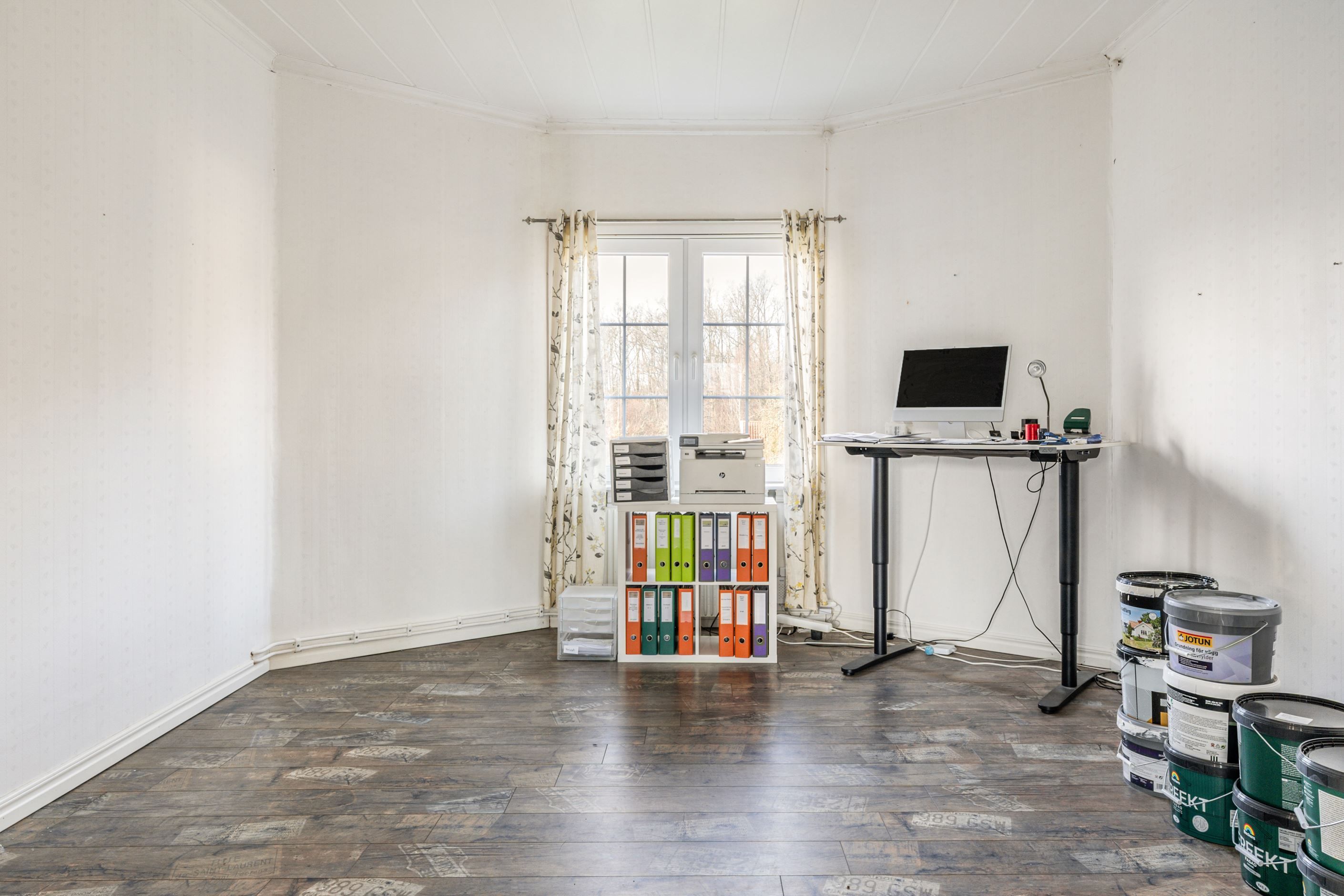 På entréplan finns flera rum som kan nyttjas som sovrum, kontor eller hobbyrum. Ett av sovrummen erbjuder plats för dubbelsäng och förvaring bakom spegelgarderober. Mellanrummet har tre garderober och ytterligare en kakelugn (eldningsförbud). Det finns även ett badrum utrustat med stort bubbelbadkar samt duschhörna.