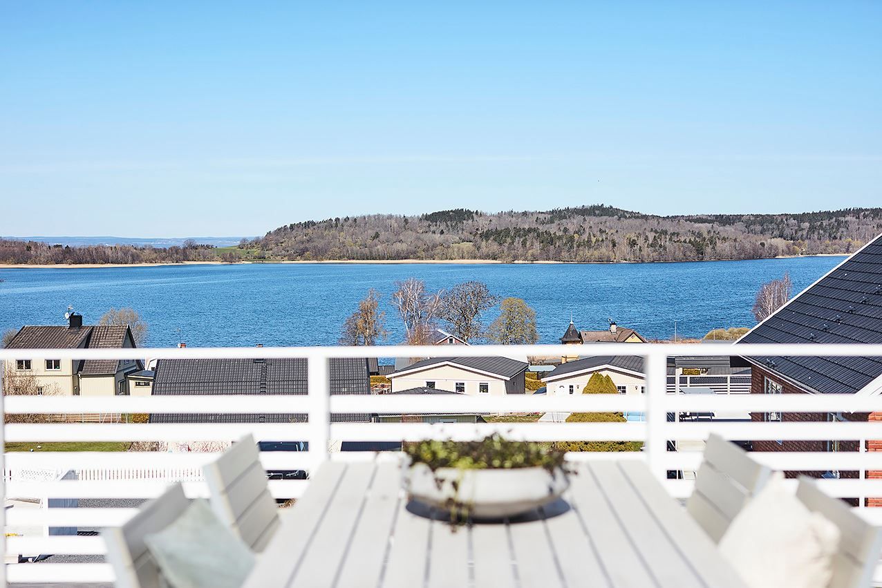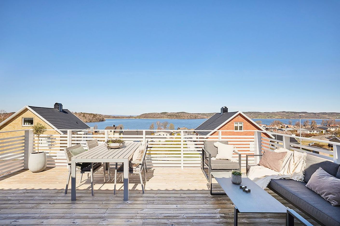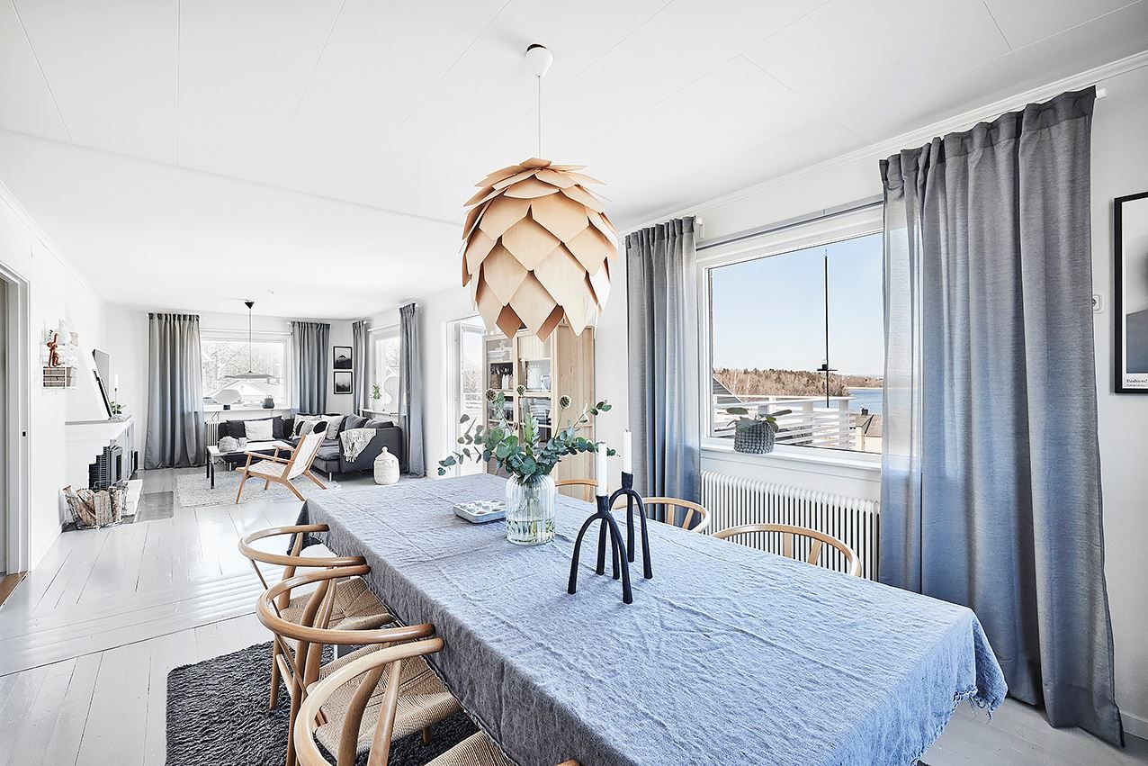 Interiört ett vitt IKEA-kök där hela familjen får plats när det är dags att tillaga middagen. Vardagsrummet med matsalsdel bjuder gott om plats för gästerna och härifrån skådar ni de magiska solnedgångarna. Sällskapsytorna som går i ljusa grafitgrå toner förlängs av den magiska terrassen och panoramavyn! Här kommer ni garanterat spendera långa och många sommardagar!