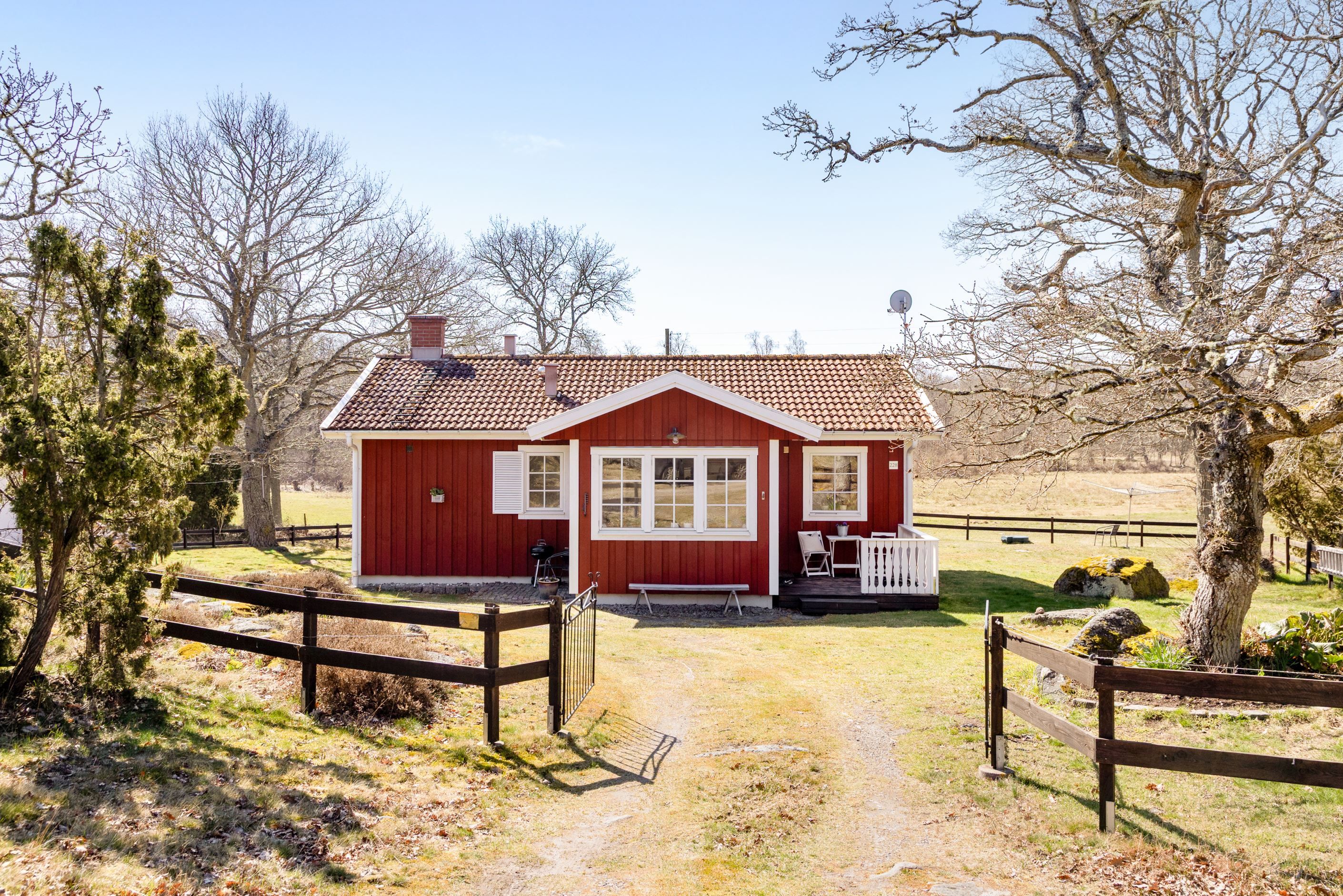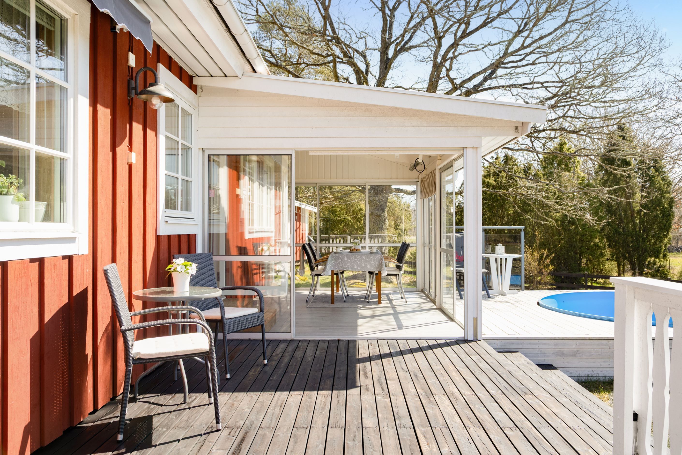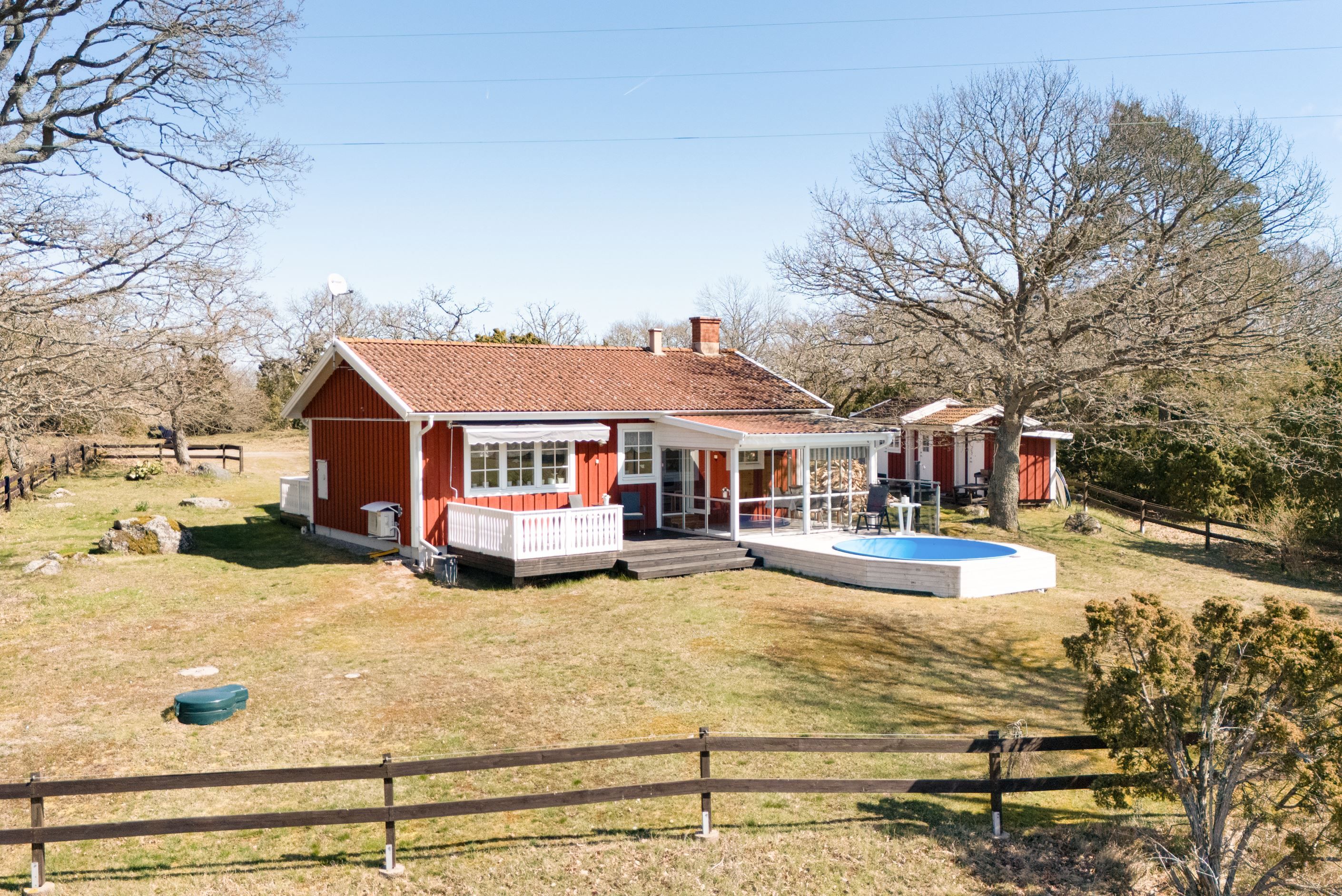 Från husets fönster breder en beteshage ut sig där kor lugnt betar och skapar en levande, rogivande tavla året om. Miljön för tankarna till en scen ur en Astrid Lindgren-saga – idyllisk, trygg och fylld av charm. På tomten finns även ett uthus med goda förvaringsmöjligheter, som vid behov kan förvandlas till en mysig gäststuga. Poolen blir en självklar samlingsplats under sommarens varma dagar – en plats för både avkoppling och glädje.