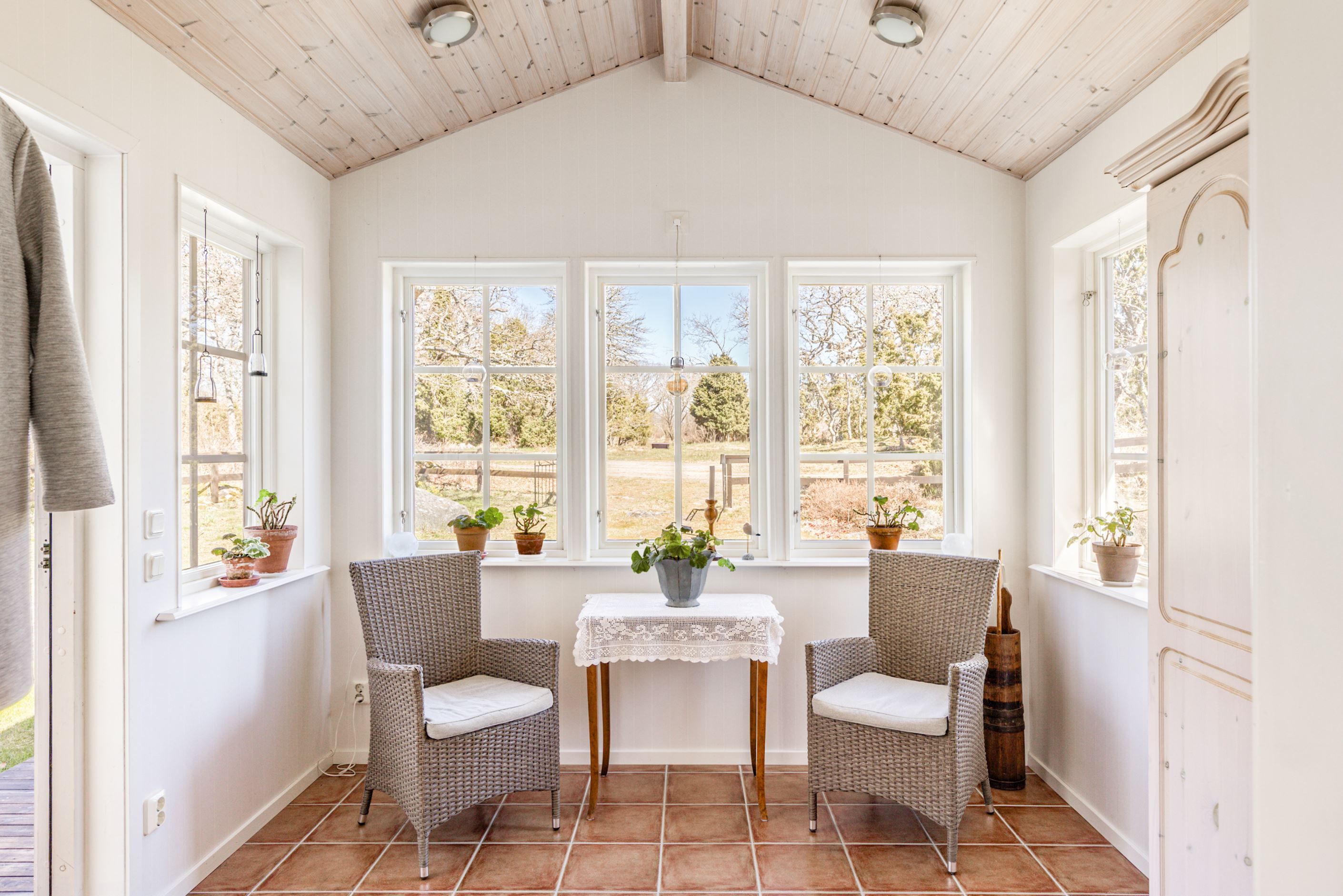 Morgonen börjar med ljuset som varsamt letar sig in genom fönstren, kanske med en kopp kaffe i den generösa entrén – en plats som nästan känns som en egen glasveranda, perfekt för att låta dagen vakna i lugn och ro.
