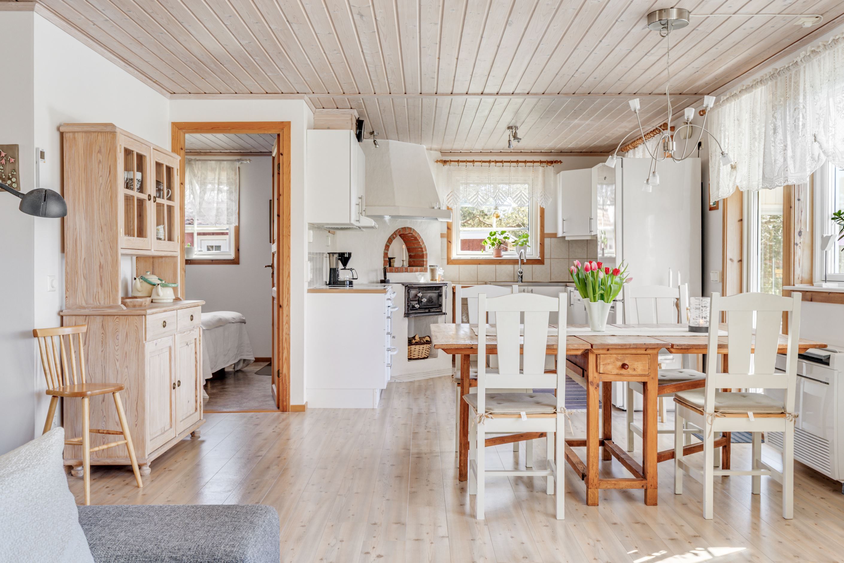 Invändigt möts du av en modern och genomtänkt planlösning där kök och vardagsrum samspelar i en öppen, social yta – idealisk för både vardagsliv och umgänge. Köket är stilrent och funktionellt utformat, med en vacker vedspis som både skapar värme och fungerar som en naturlig samlingspunkt. Här finns två rogivande sovrum samt ett badrum utrustat med tvättmaskin för en bekväm vardag. Med kommunalt VA och moderna bekvämligheter får du det bästa av två världar – naturens lugn och hemmets funktionalitet.