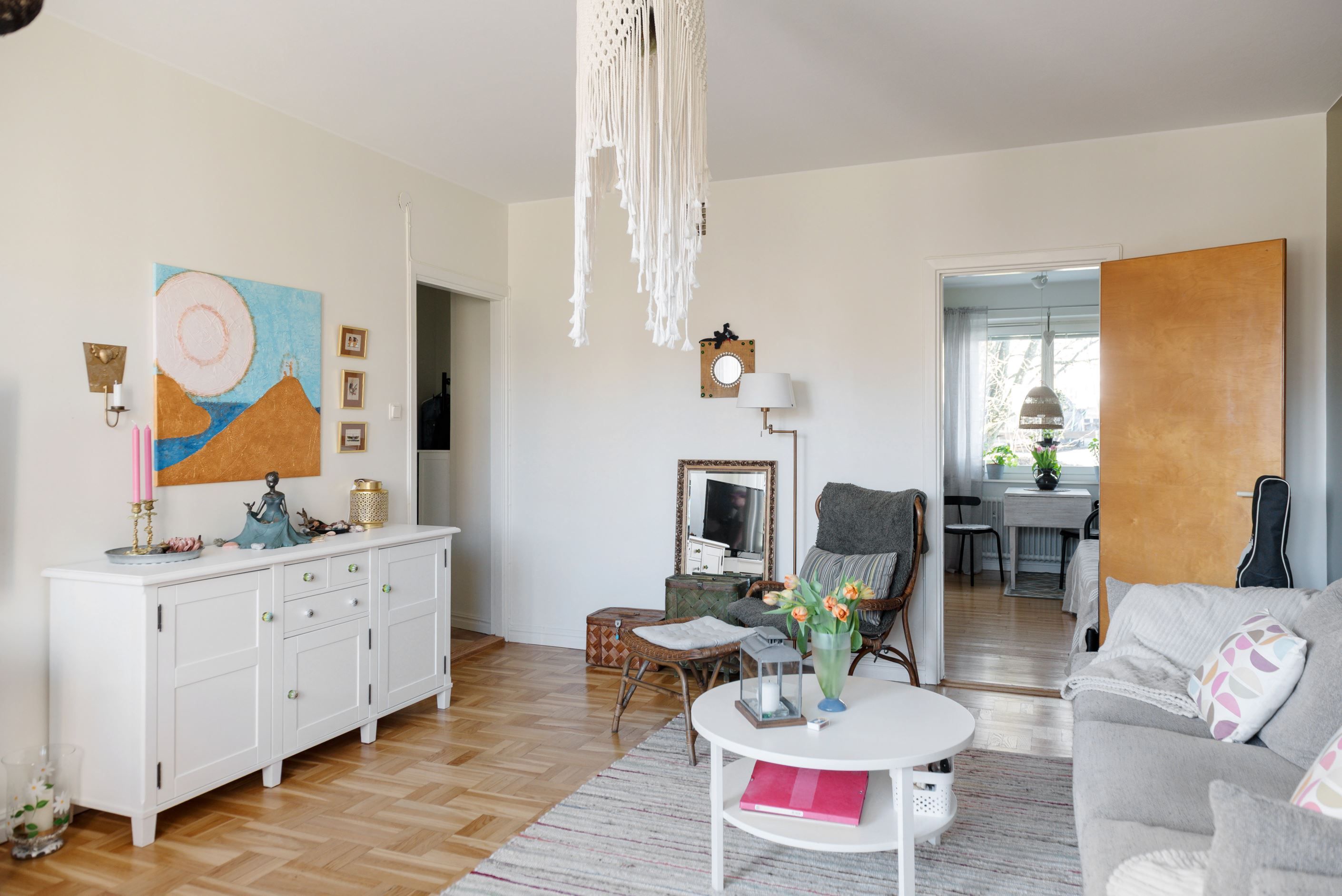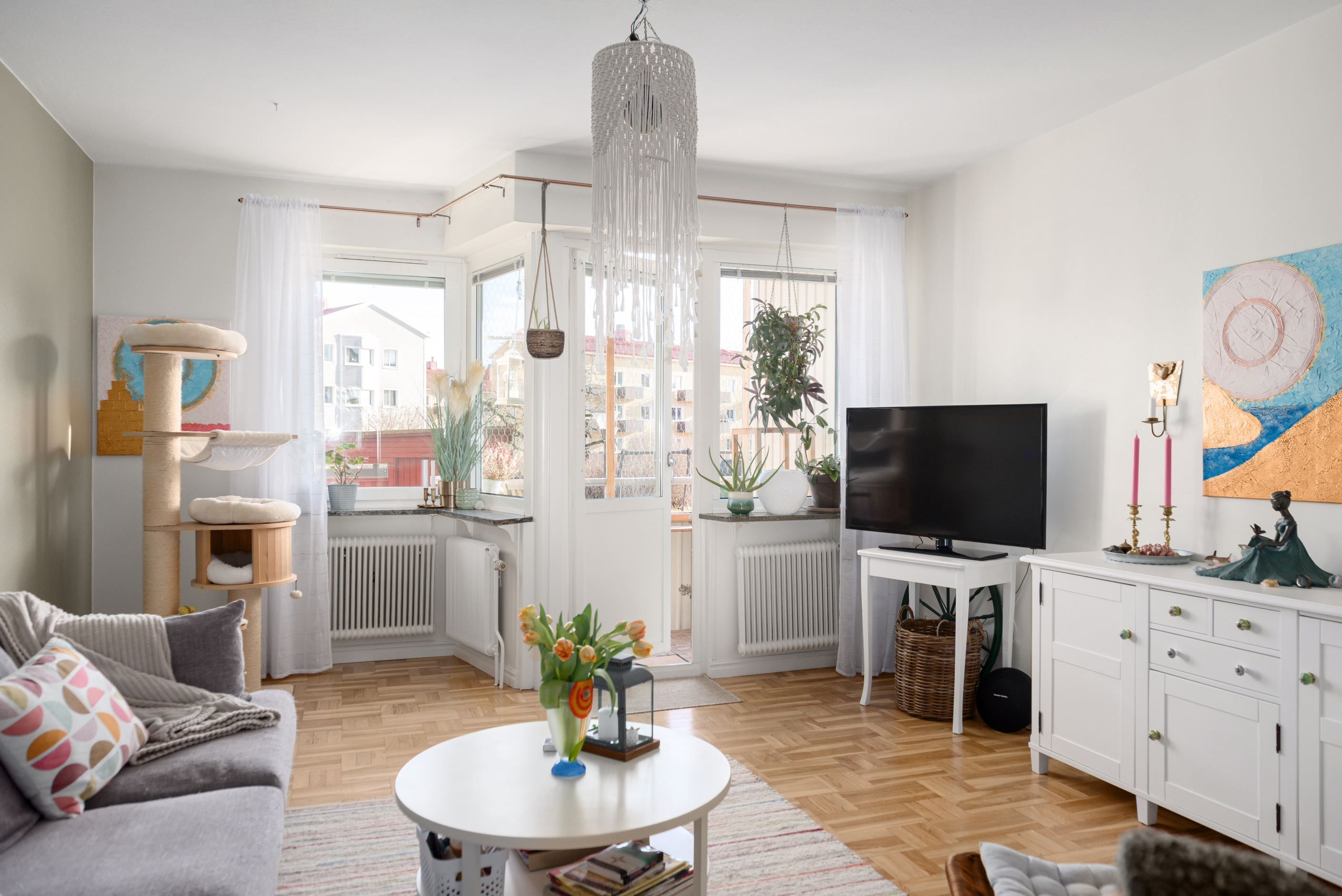Vardagsrummet rymmer plats för både matbord och soffmöblemang och tillsammans med den trevliga balkongen med utsikt över den grönskande innergården erbjuder ett rum för ett socialt liv. Bostaden är praktiskt belägen 1/2 trappa upp i huset.
