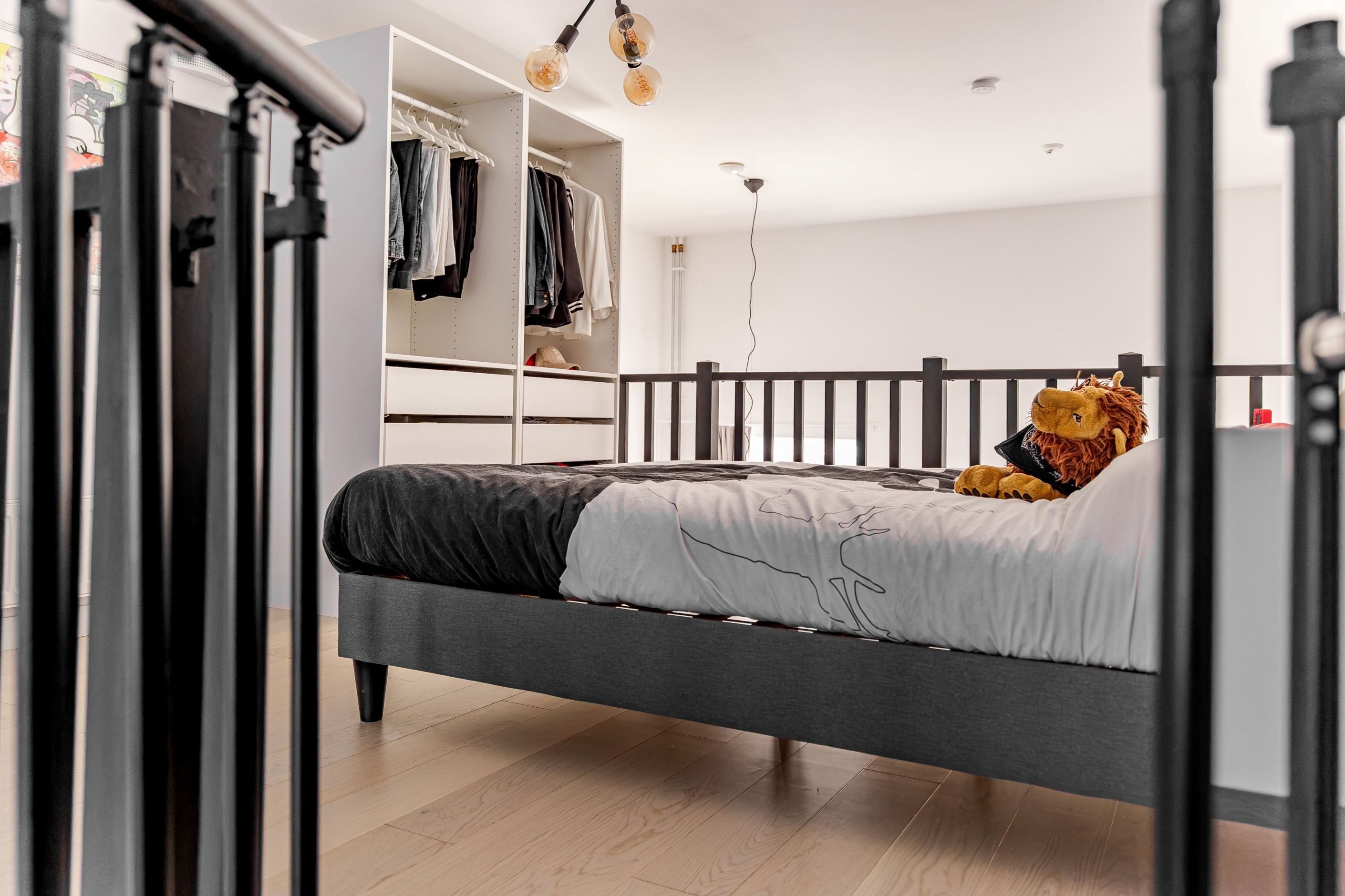 Den stilrena spiraltrappan leder upp till loftet – en flexibel yta som passar perfekt som sovdel. Här finns även möjlighet till förvaring, och tack vare den öppna takhöjden skapas en luftig och modern känsla som genomsyrar hela bostaden.