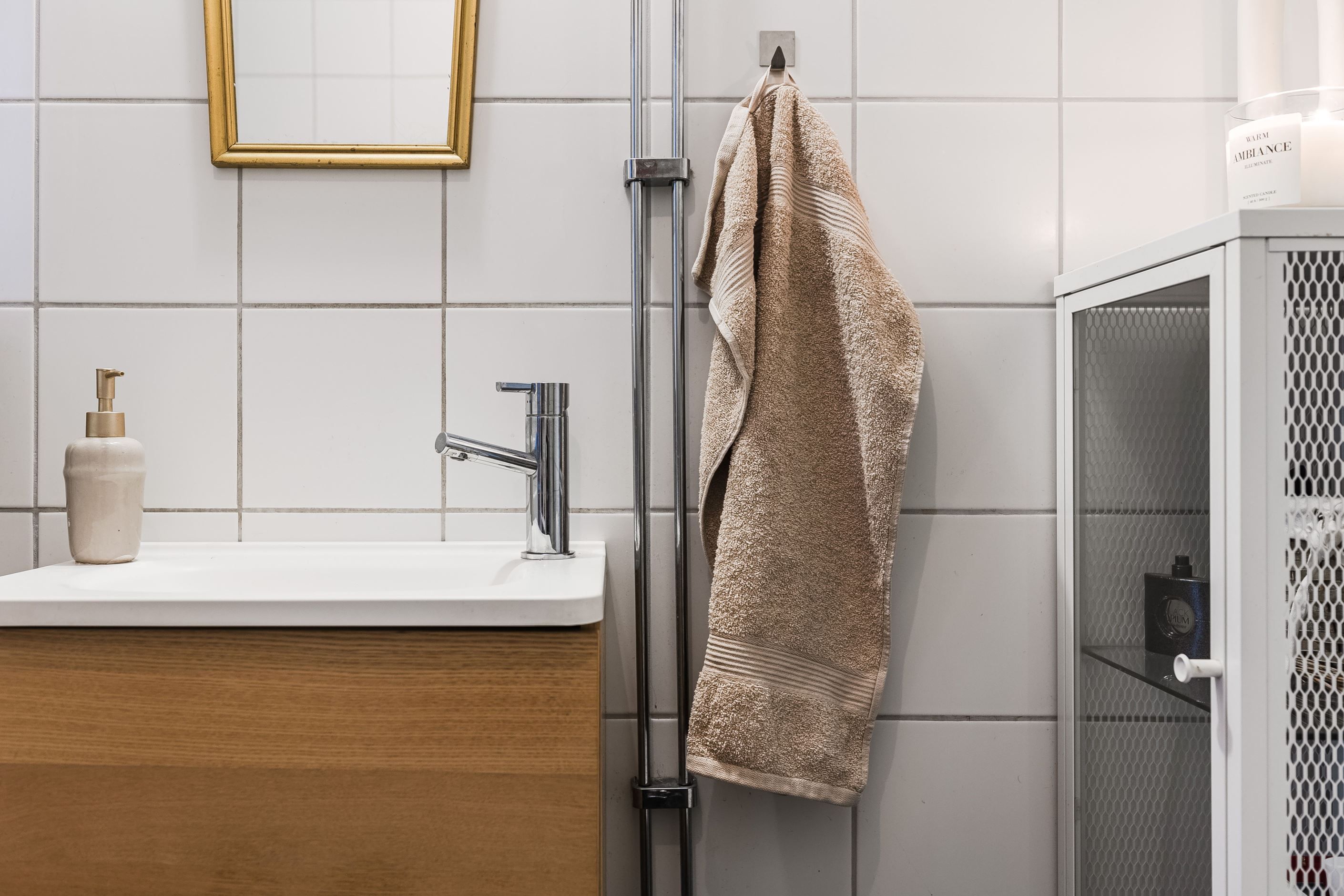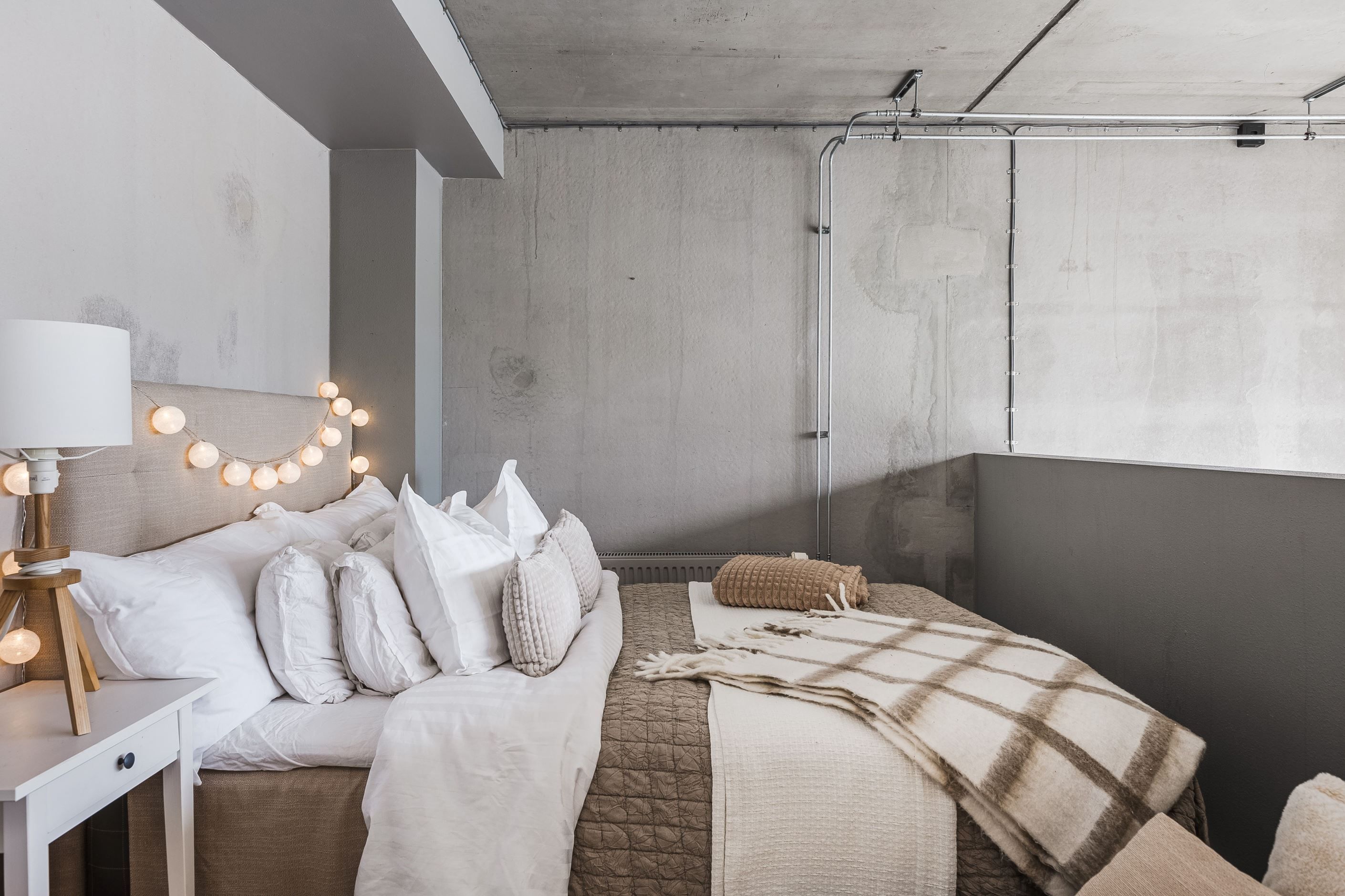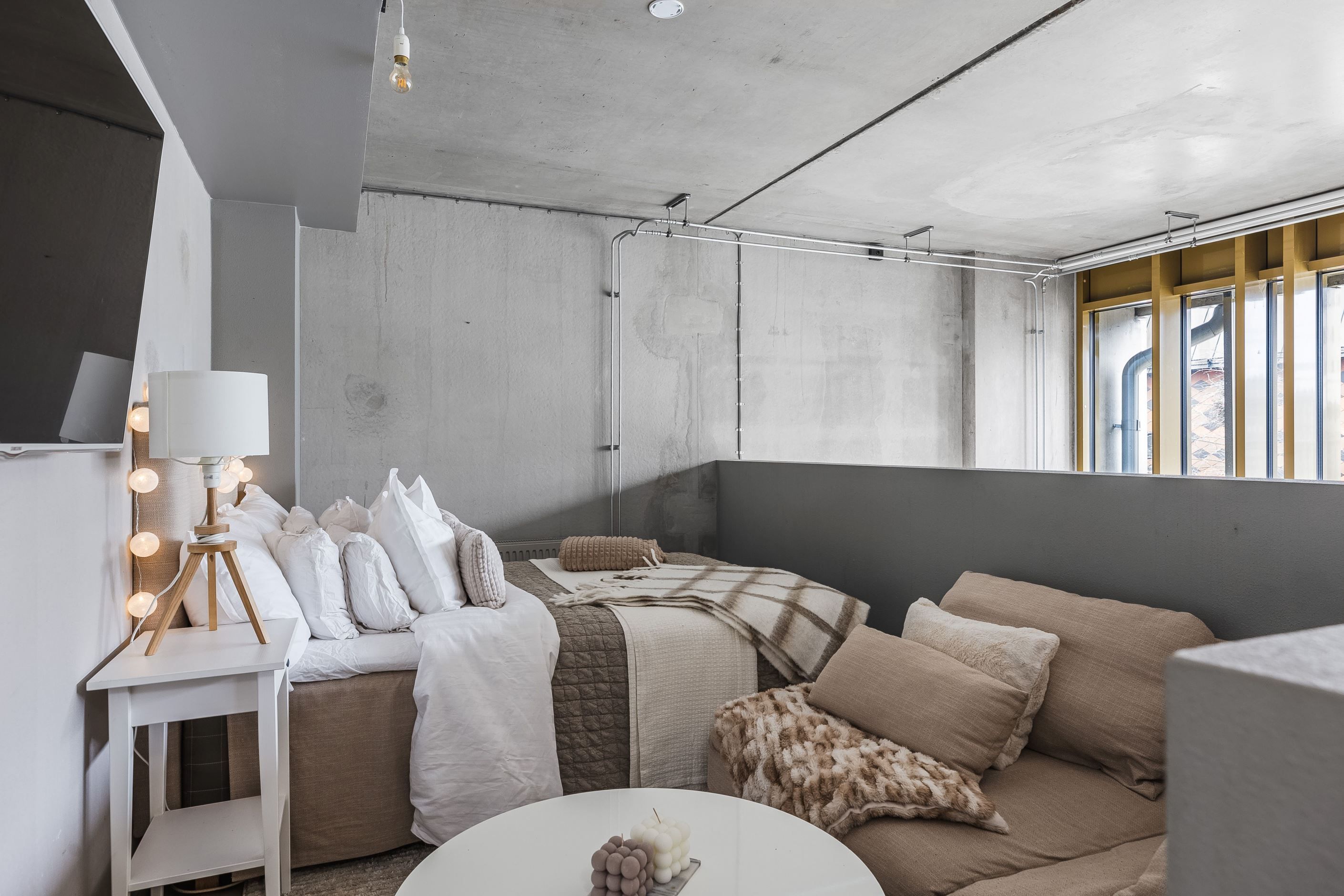 Det helkaklade badrummet är rymligt och stilrent, utrustat med dusch samt kombinerad tvättmaskin och torktumlare. Köket och vardagsrummet har en öppen planlösning, vilket gör ytan lätt att möblera och inreda efter behov. Loftet erbjuder plats för både säng och soffa och har gott om ljusinsläpp från fönsterpartiet. För extra komfort finns en eldriven mörkläggningsgardin som skapar en privat och rofylld sovmiljö.