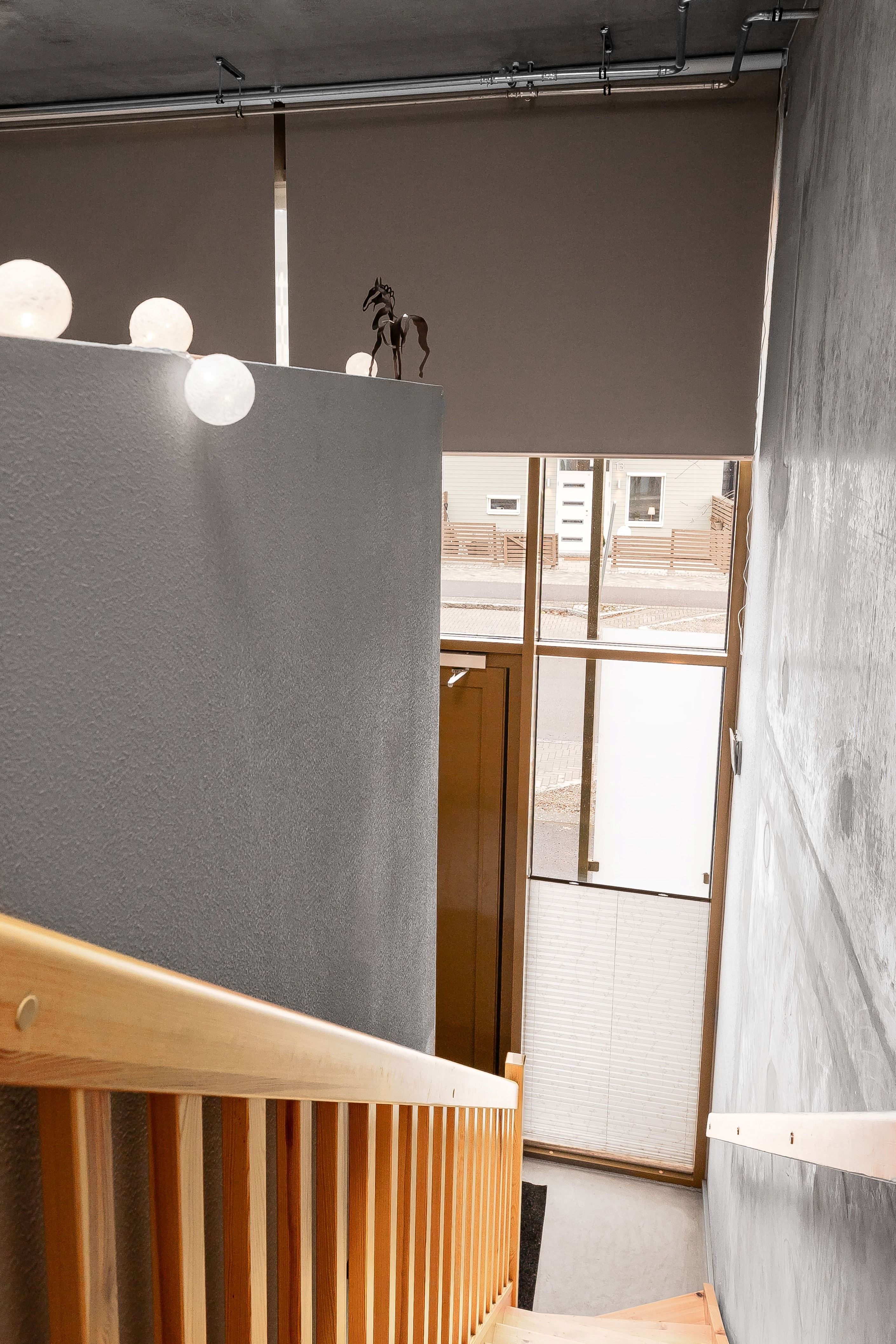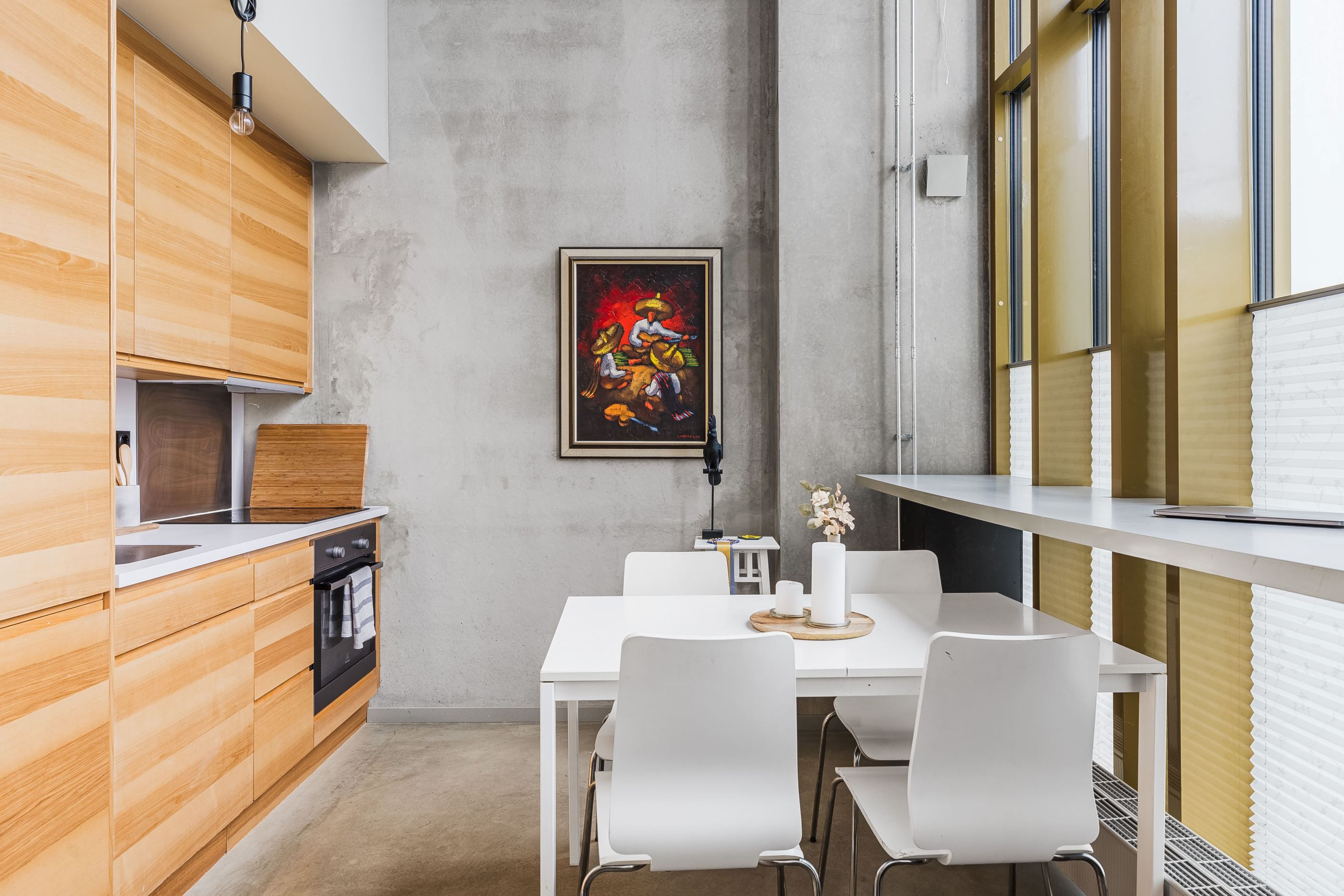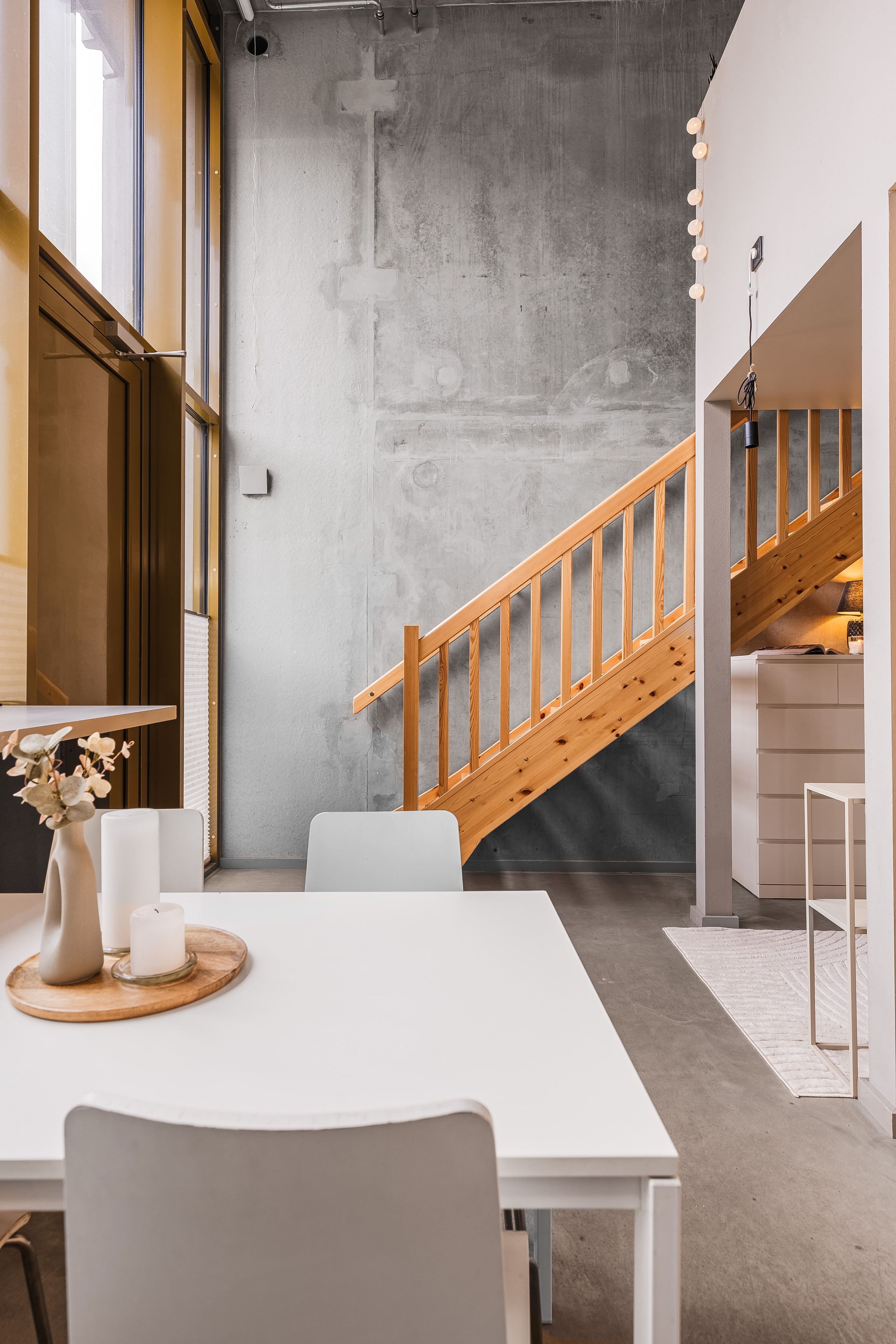 Lägenheten imponerar med en takhöjd på hela 5,6 meter och stora fönster från golv till tak, vilket skapar ett fantastiskt ljusflöde och en känsla av rymd. Entrén leder in till en hall med smart förvaring, där en vacker äldre, återvunnen dörr sätter en charmig kontrast till bostadens moderna uttryck.