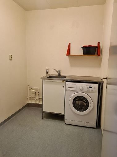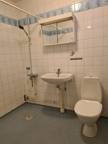 Dusch /Wc med kakel och plastmatta. Stensatt uteplats på baksidan och mindre "grästäppa"