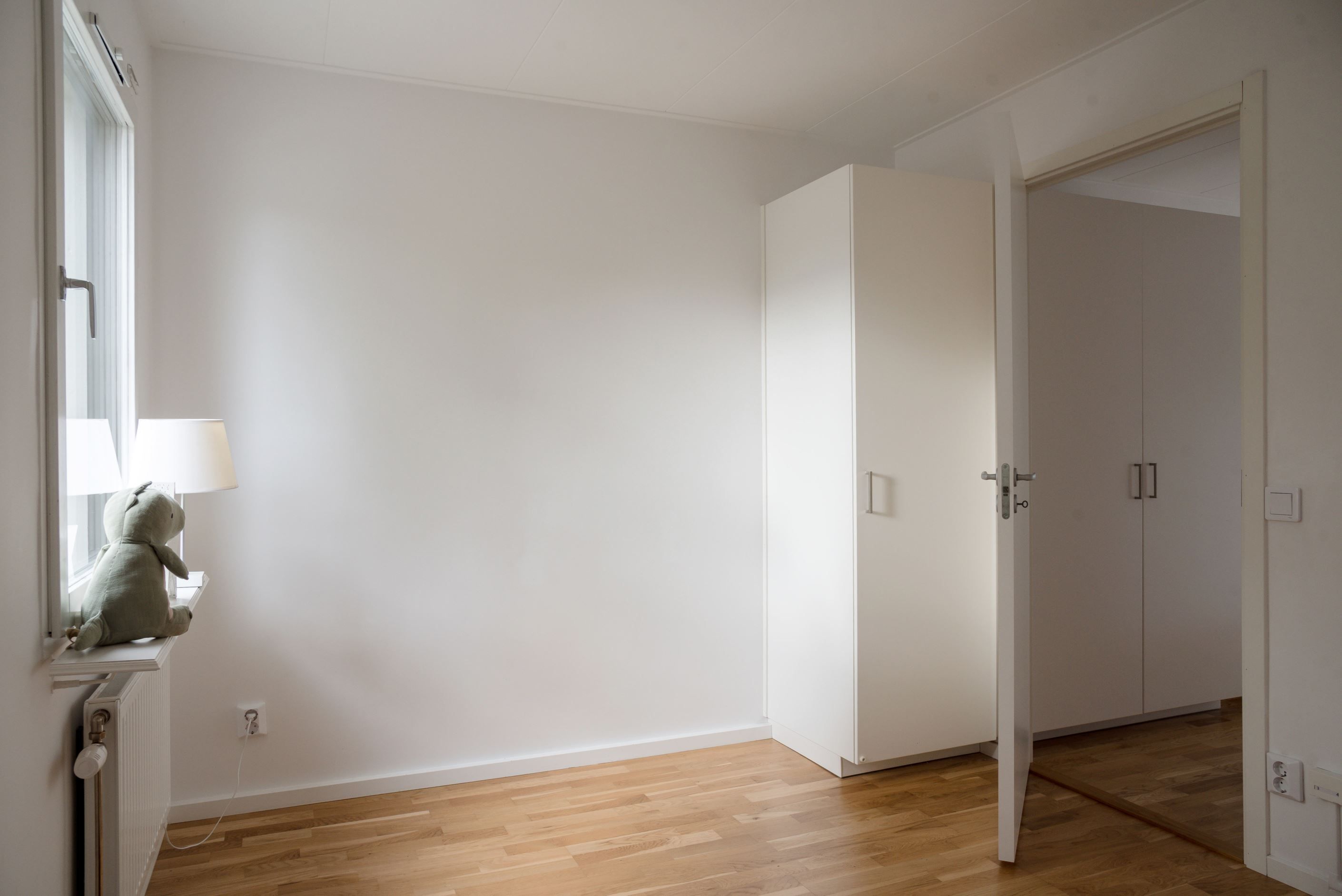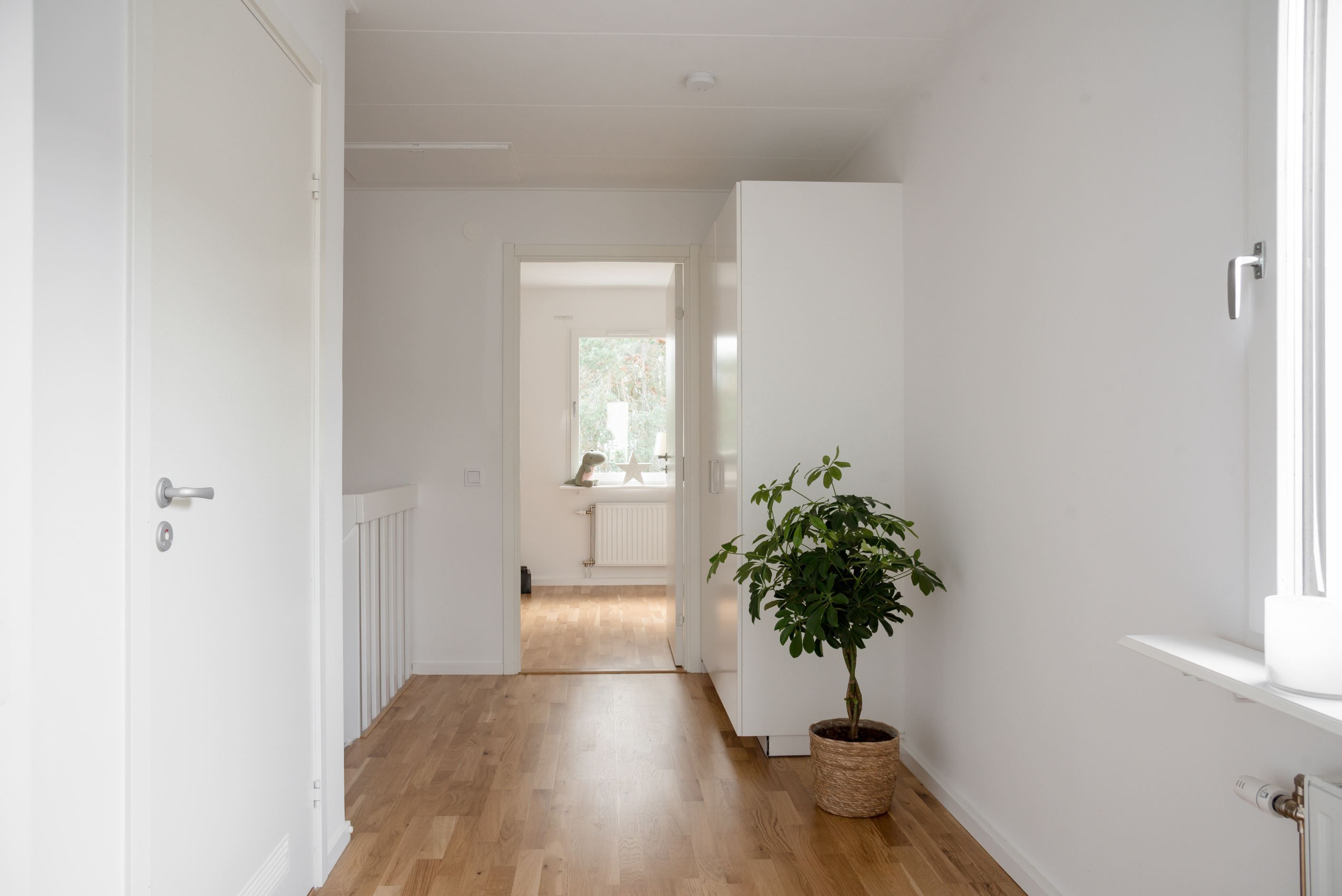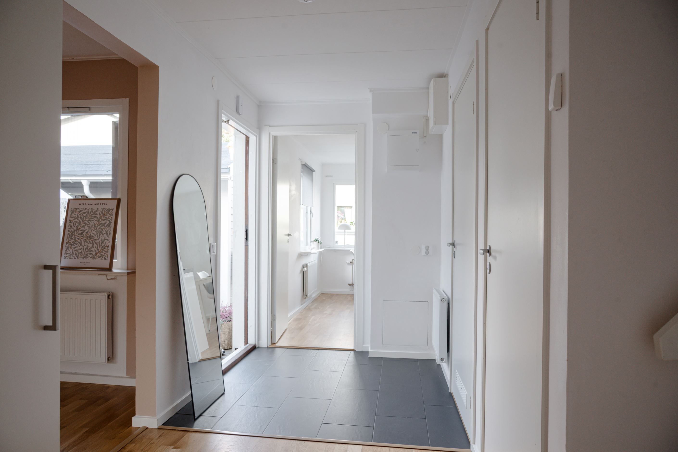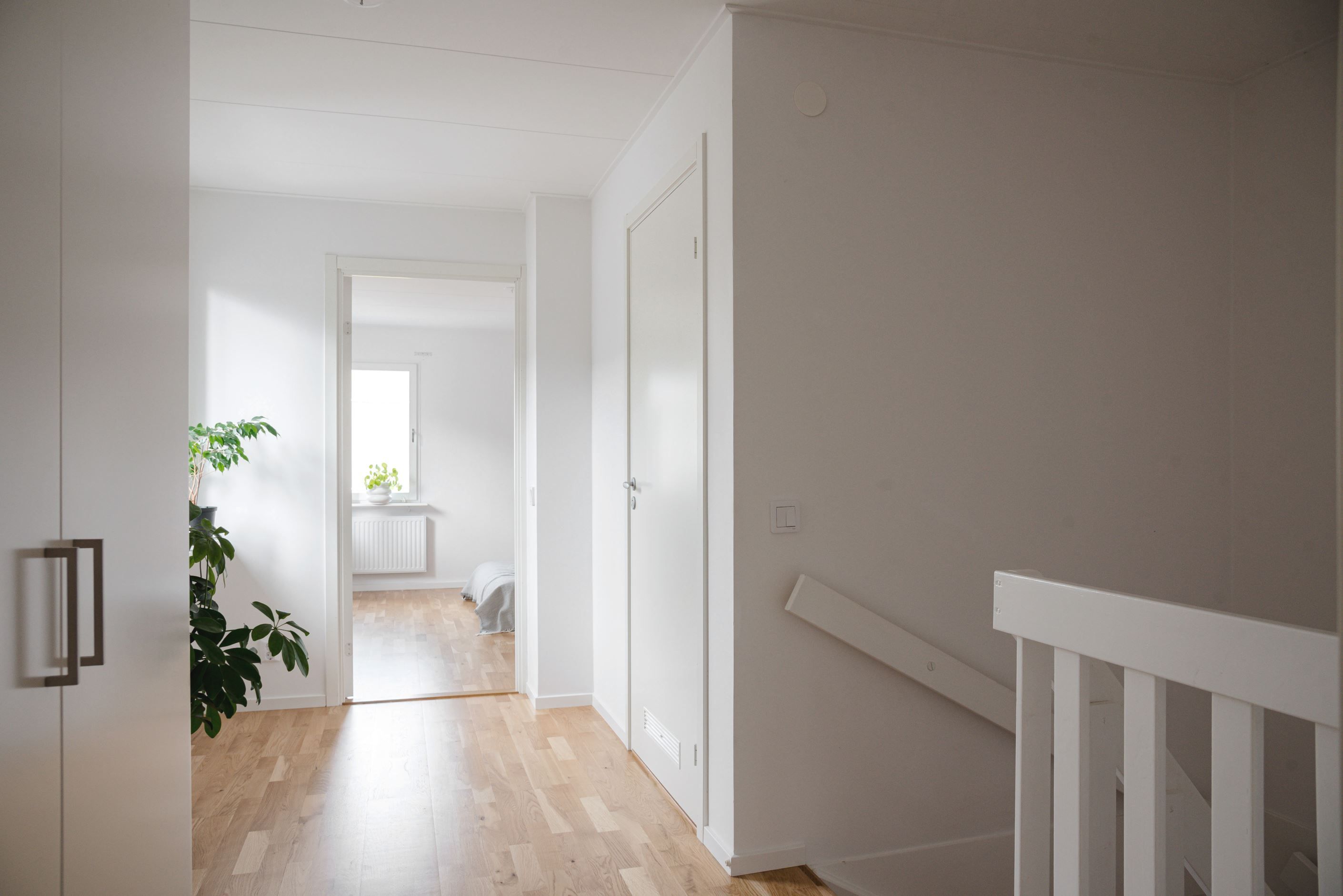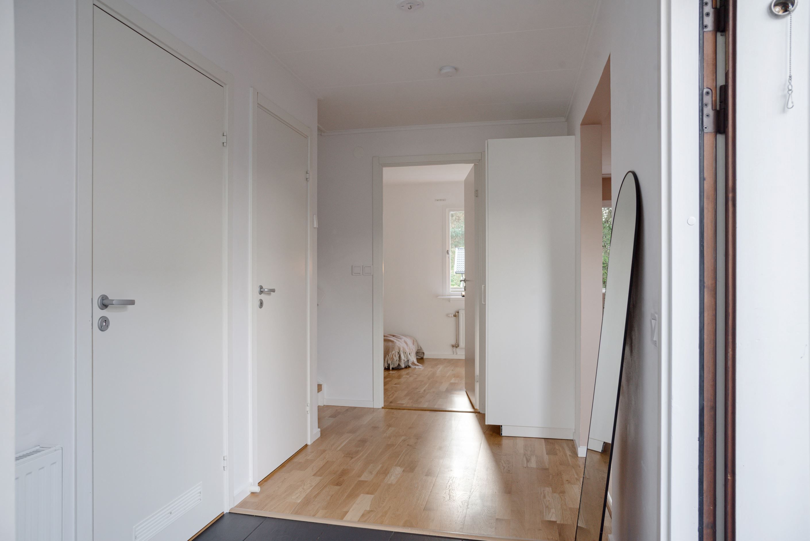 Här erbjuds en väl genomtänkt planlösning med sociala ytor och goda möjligheter för privatliv. Entréplanet erbjuder ett väl tilltaget vardagsrum med utgång till skyddad uteplats i soligt läge, modernt kök med plats för matbord, sovrum samt en rymligt hall med klinkergolv. Det övre planet disponeras över två stora sovrum, en passage med förvaringsmöjligheter samt badrum med kaklade väggar och badkar.