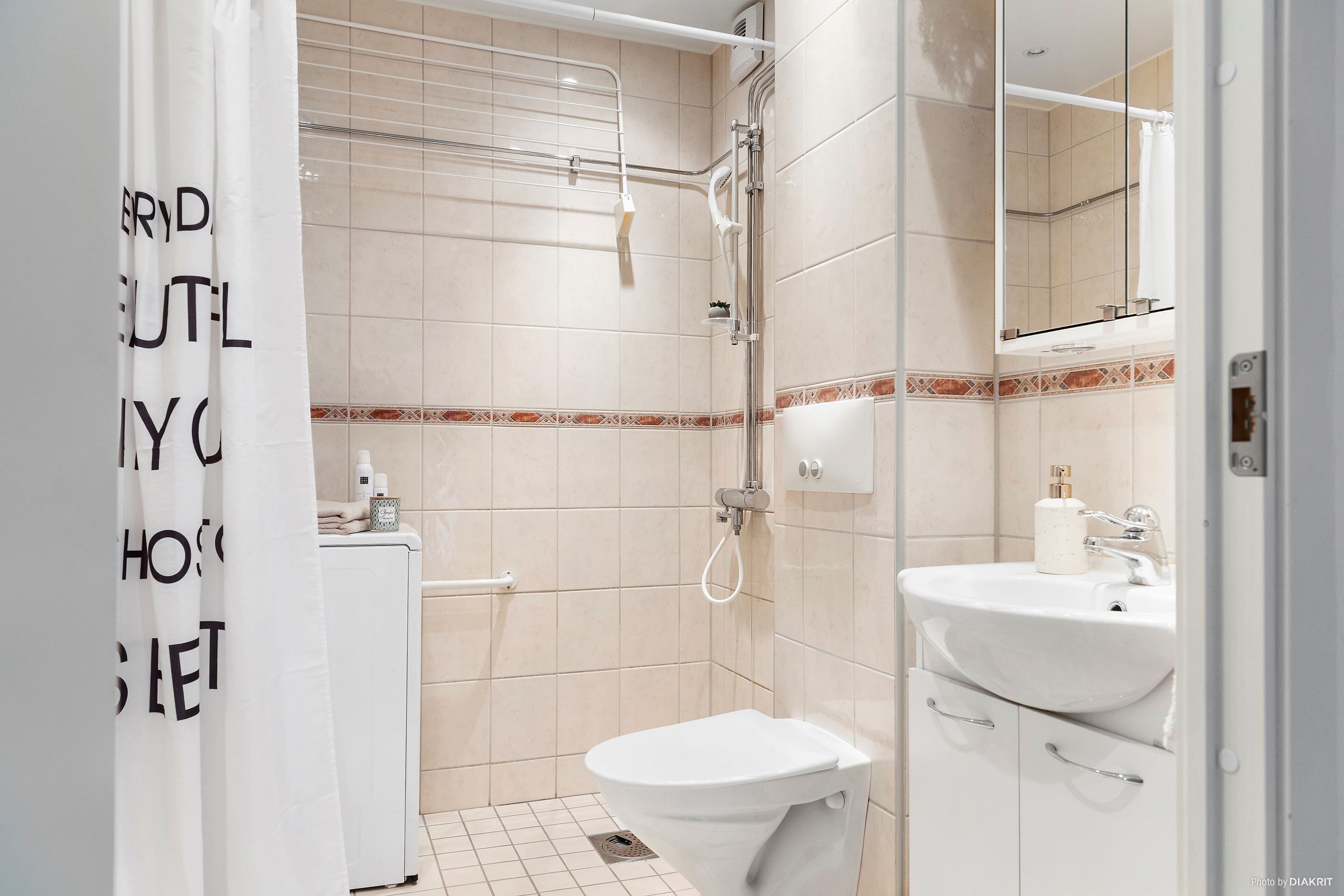 Badrummet, renoverat 2011, är helkaklat och utrustat med dusch, torkställ och tvättmaskin.