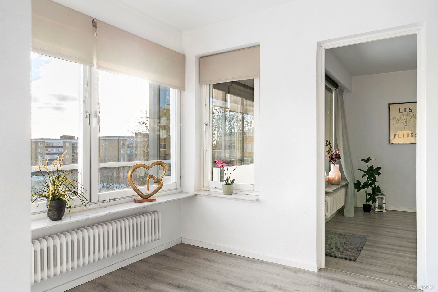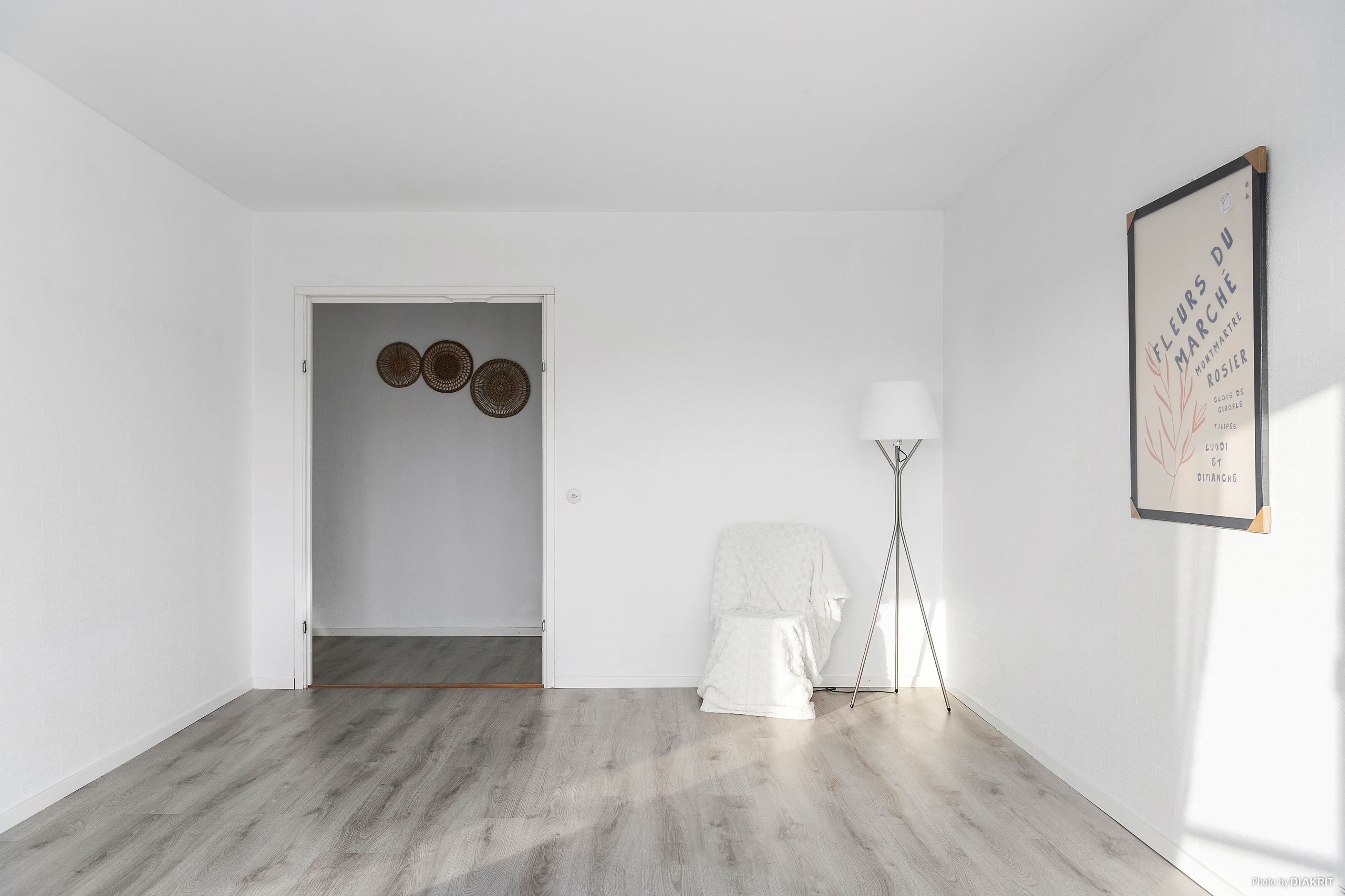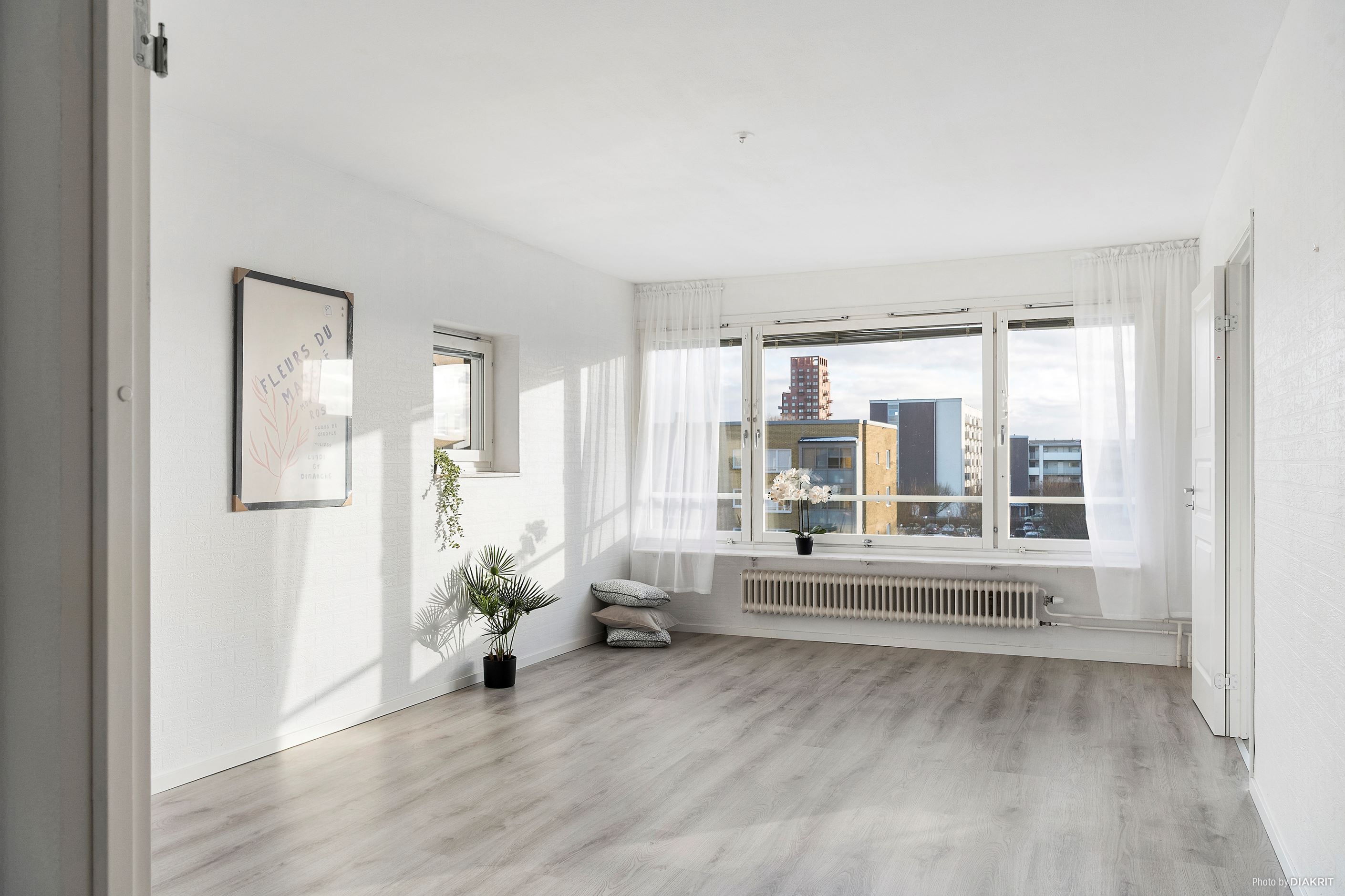 Vardagsrummet är ljust, luftigt och lättmöblerat med plats för både soffgrupp och övrigt möblemang.