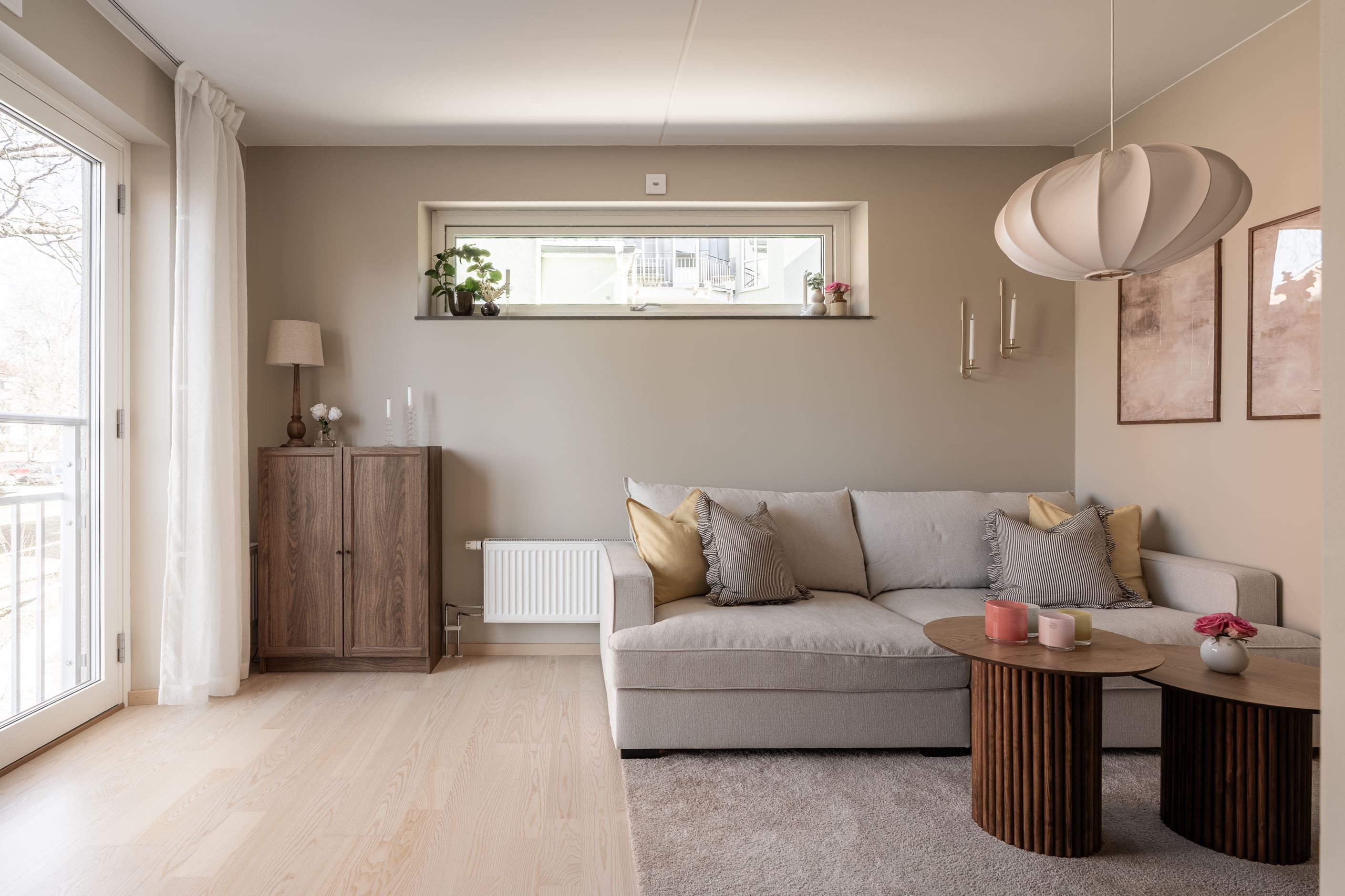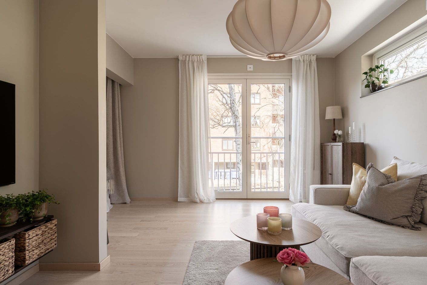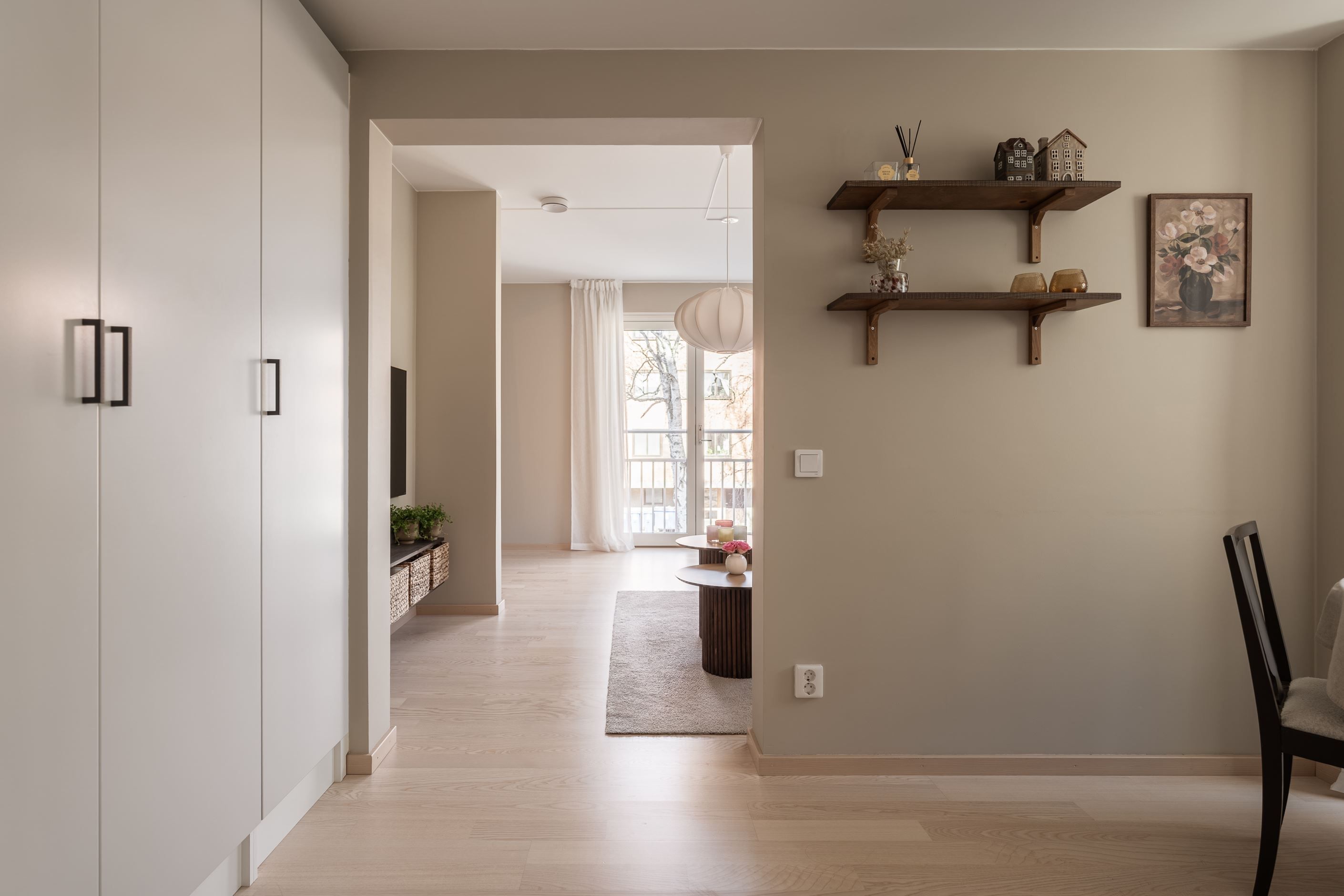 Bostaden erbjuder en luftig planlösning med fint ljusinsläpp från den franska balkongen, vilket skapar en öppen och inbjudande känsla. De sobra färgvalen ger ett harmoniskt helhetsintryck och gör det enkelt att inreda efter egen smak.