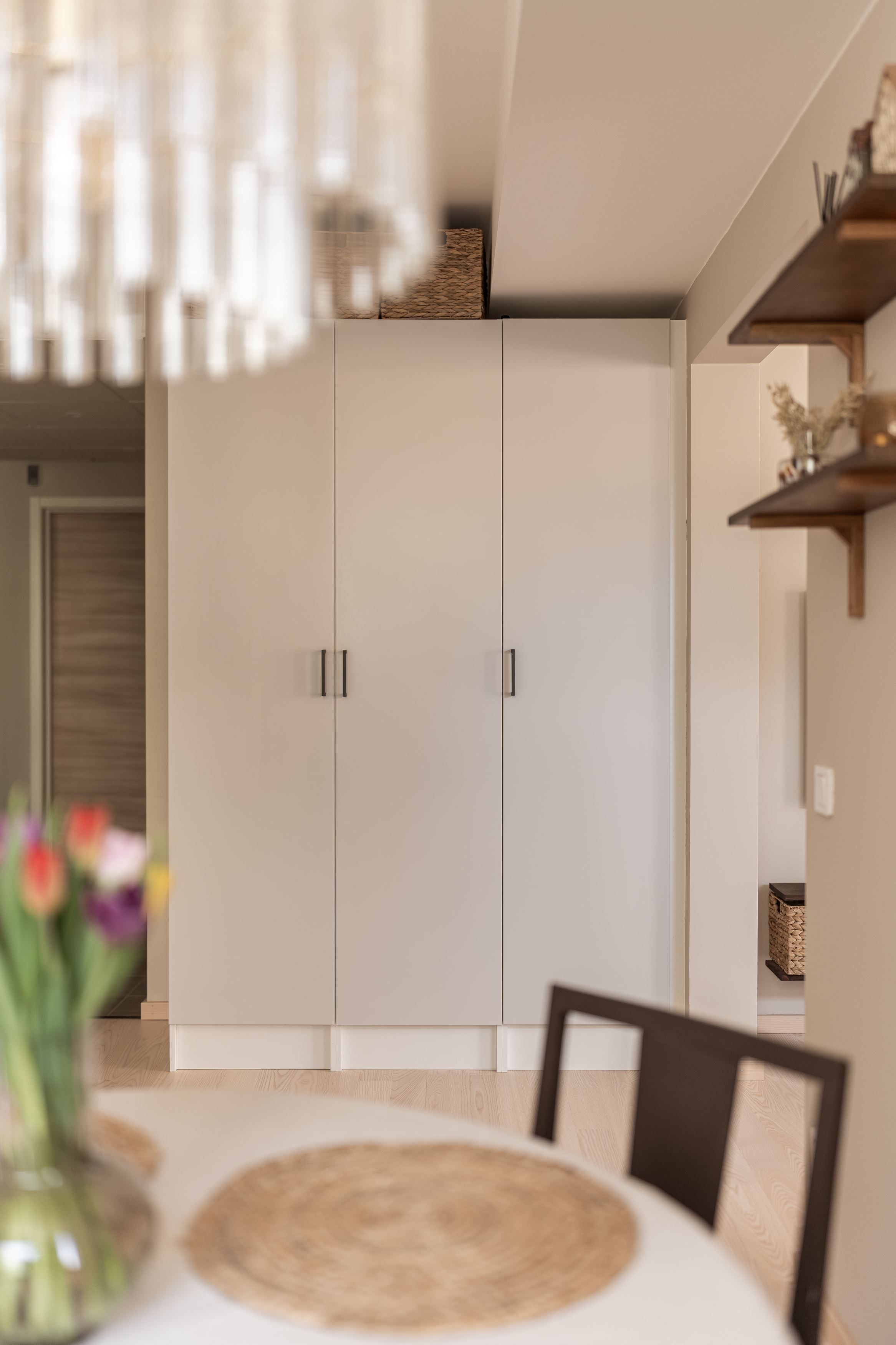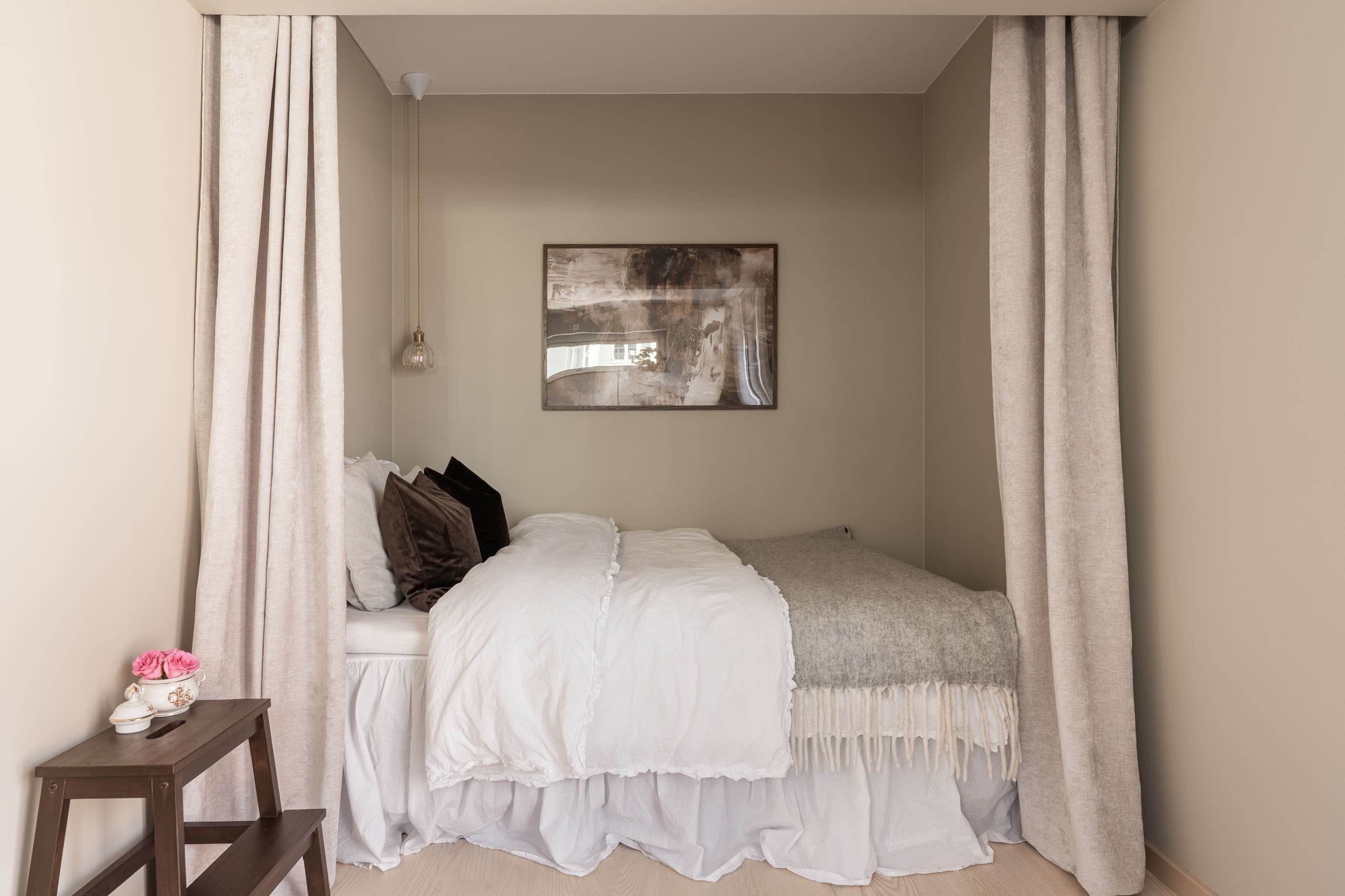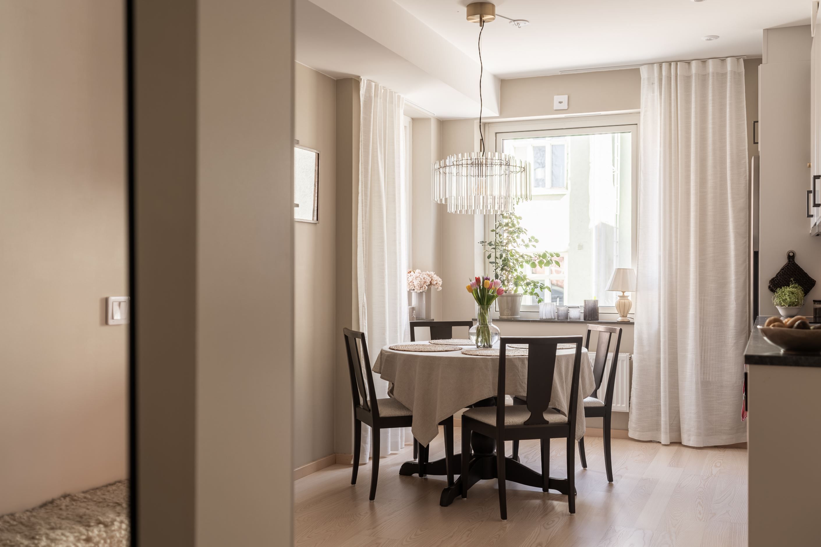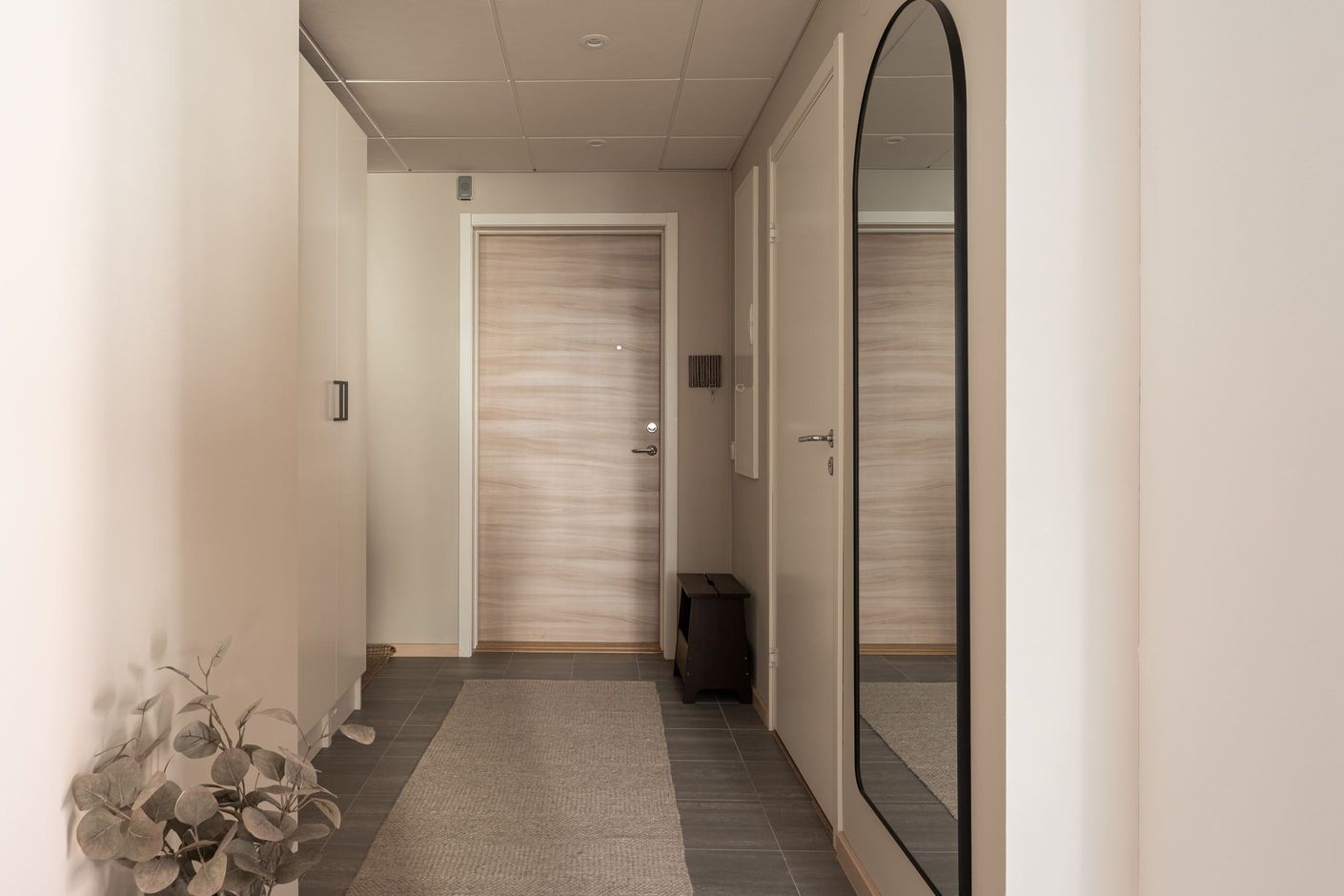Bostaden erbjuder en luftig planlösning med fint ljusinsläpp från den franska balkongen, vilket skapar en öppen och inbjudande känsla. De sobra färgvalen ger ett harmoniskt helhetsintryck och gör det enkelt att inreda efter egen smak.