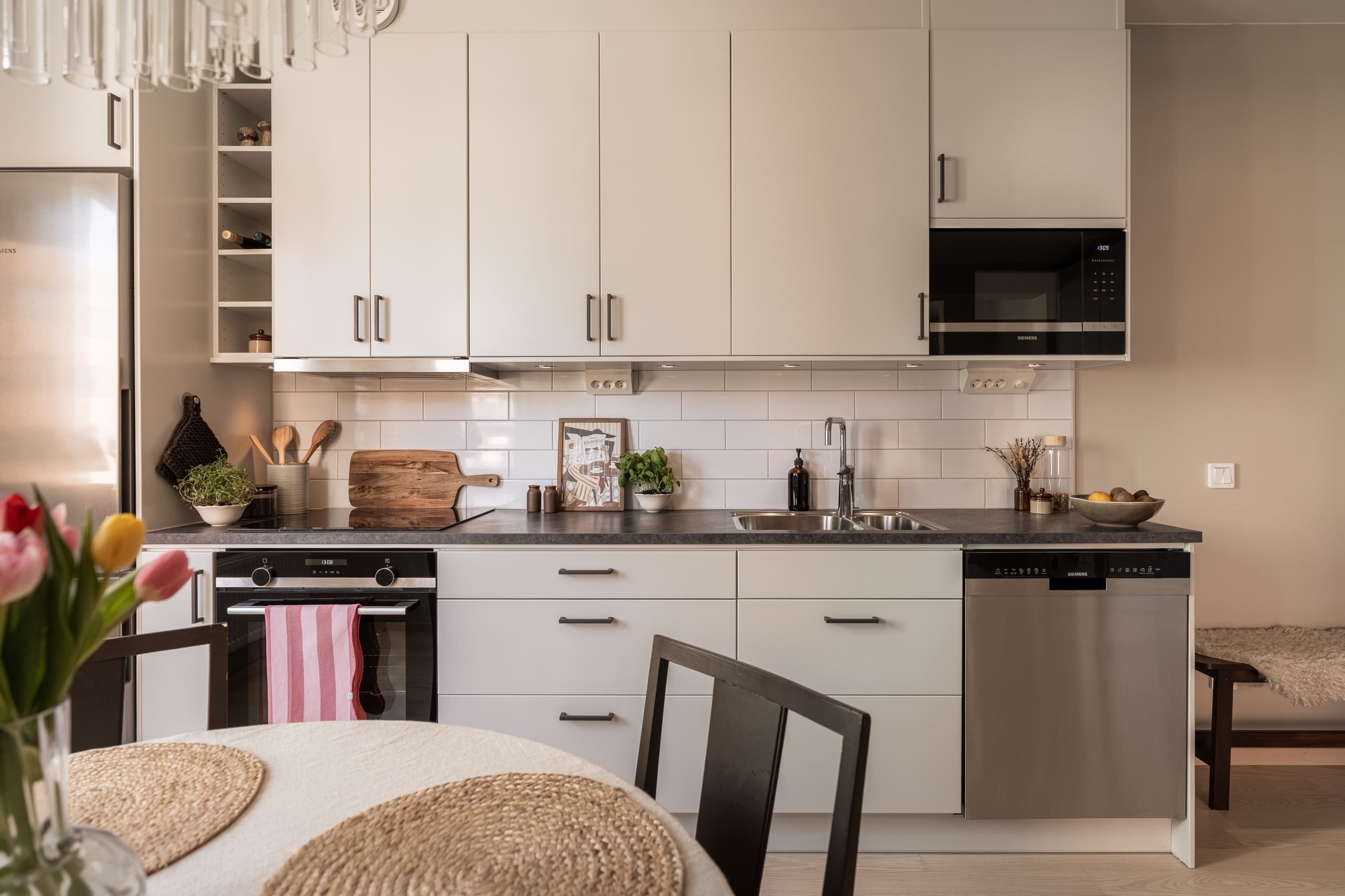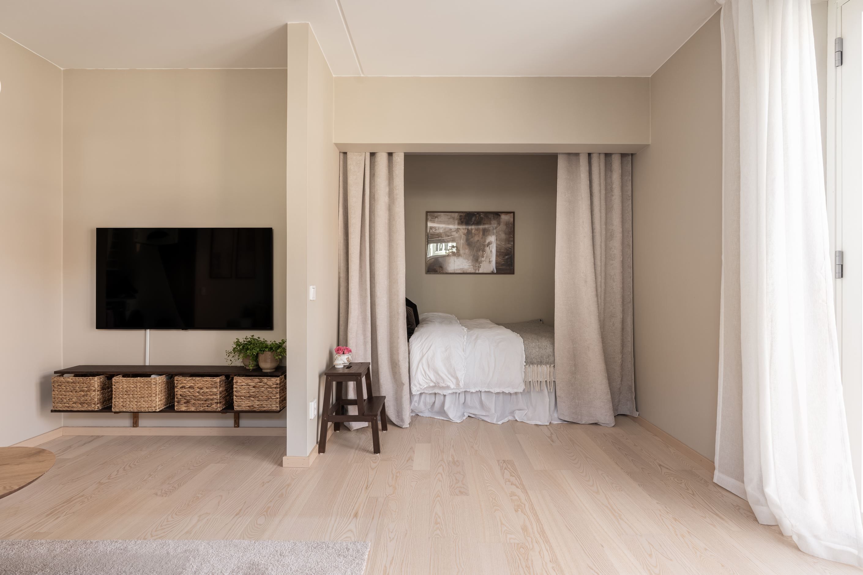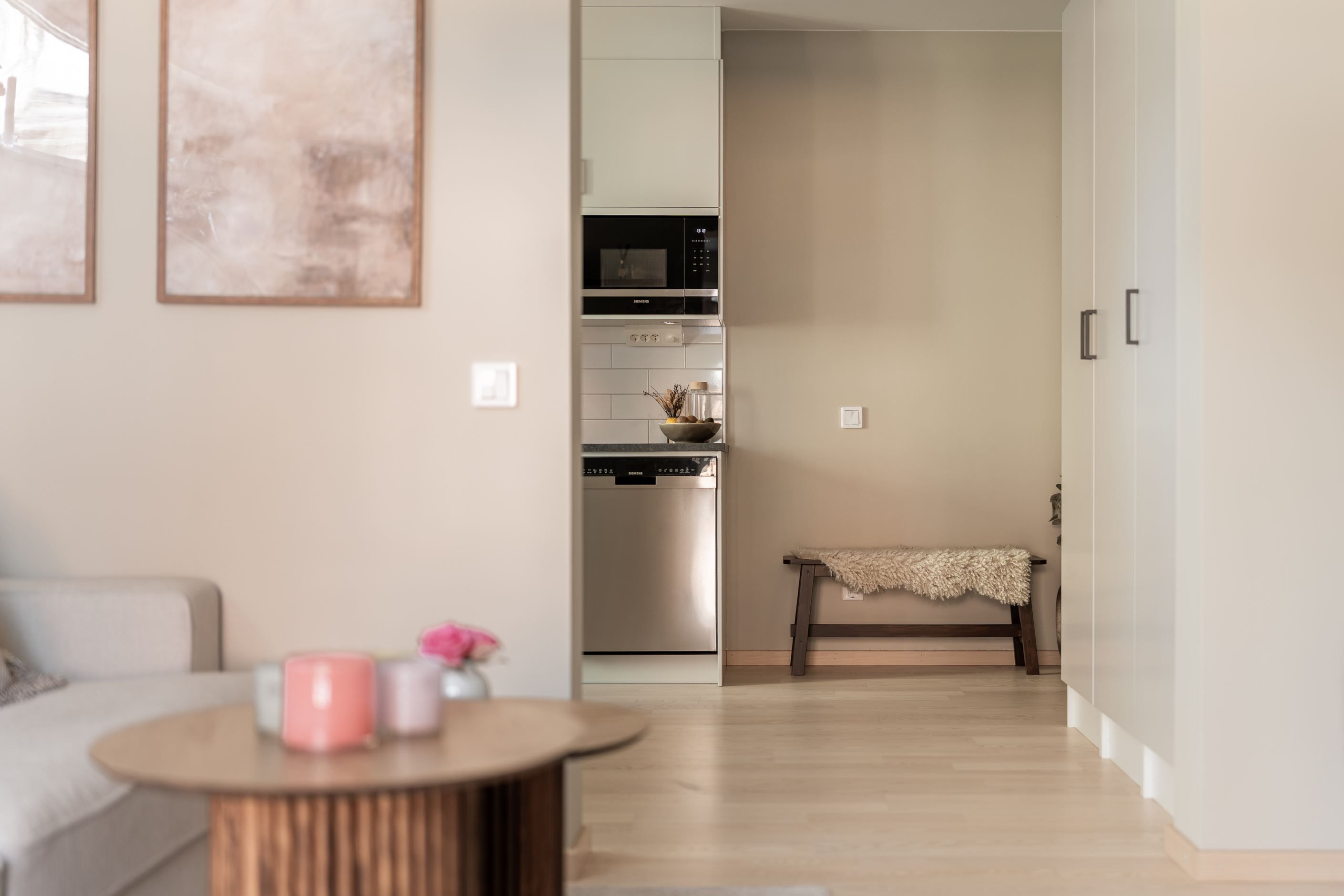 Det stilrena köket är utrustat med moderna vitvaror och har gott om plats för trivsamma middagar med familj och vänner. Vardagsrummet är rymligt och lättmöblerat med plats för både soffgrupp och arbetsyta. Den praktiska alkoven skapar en naturligt avskild sovplats.