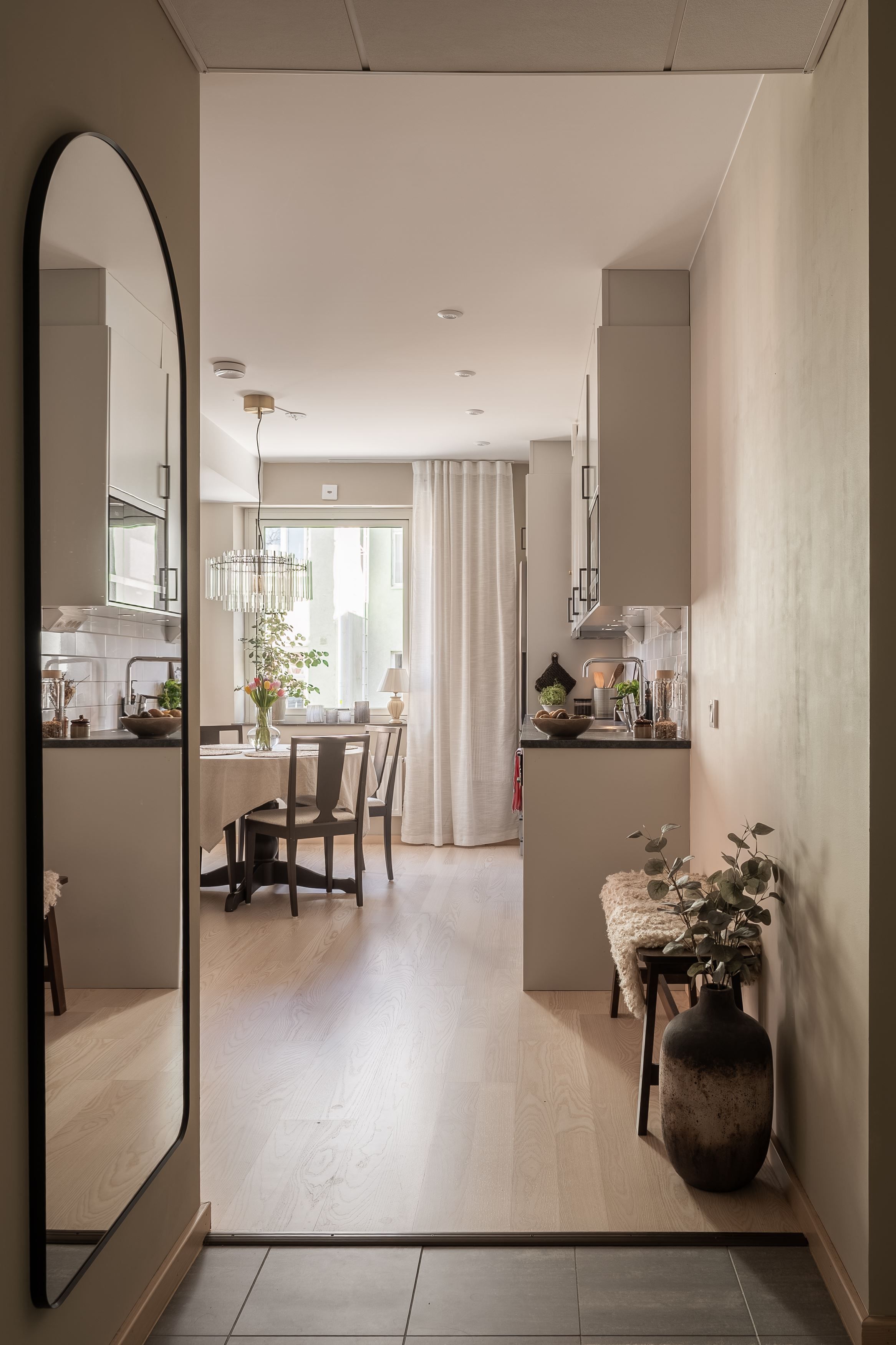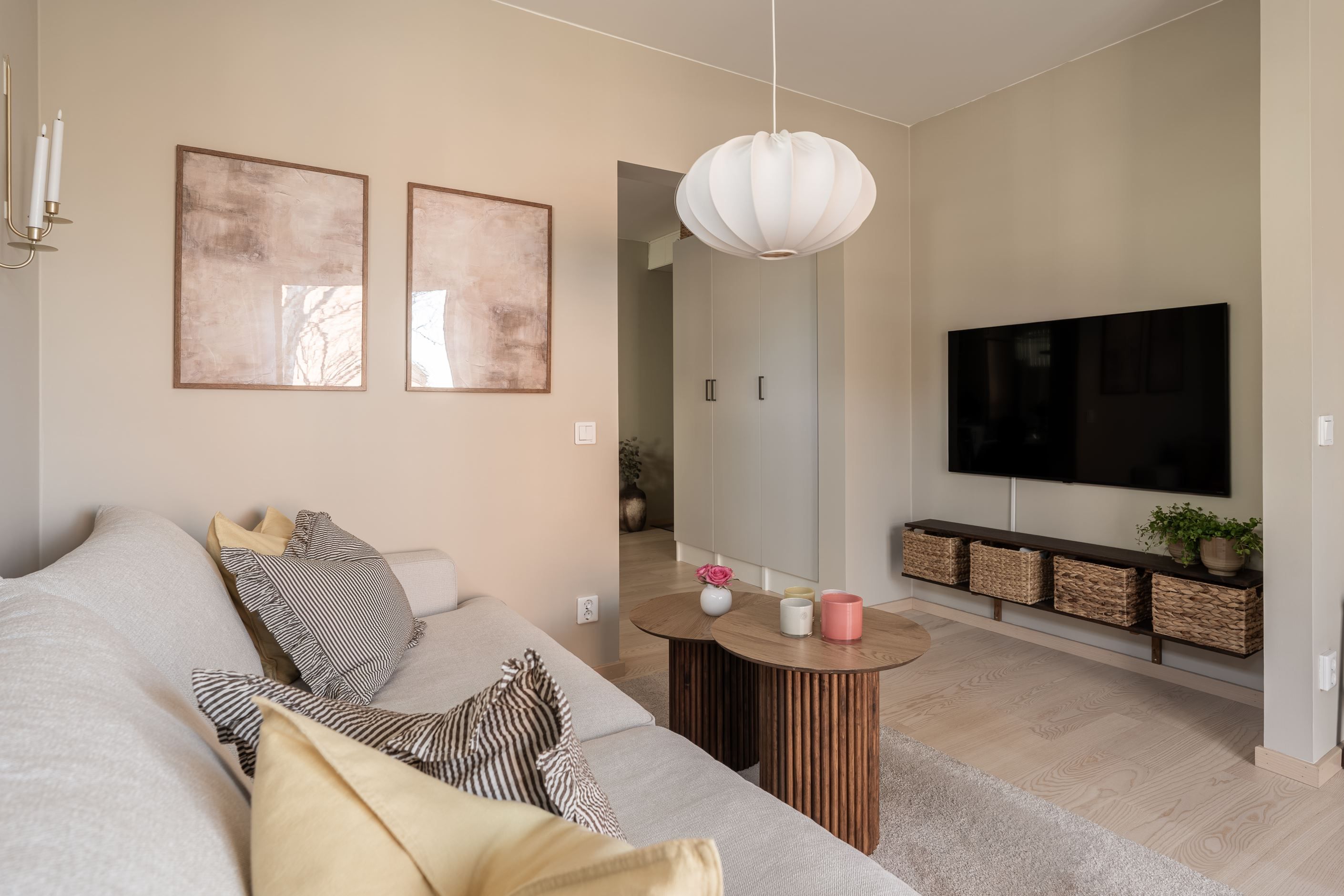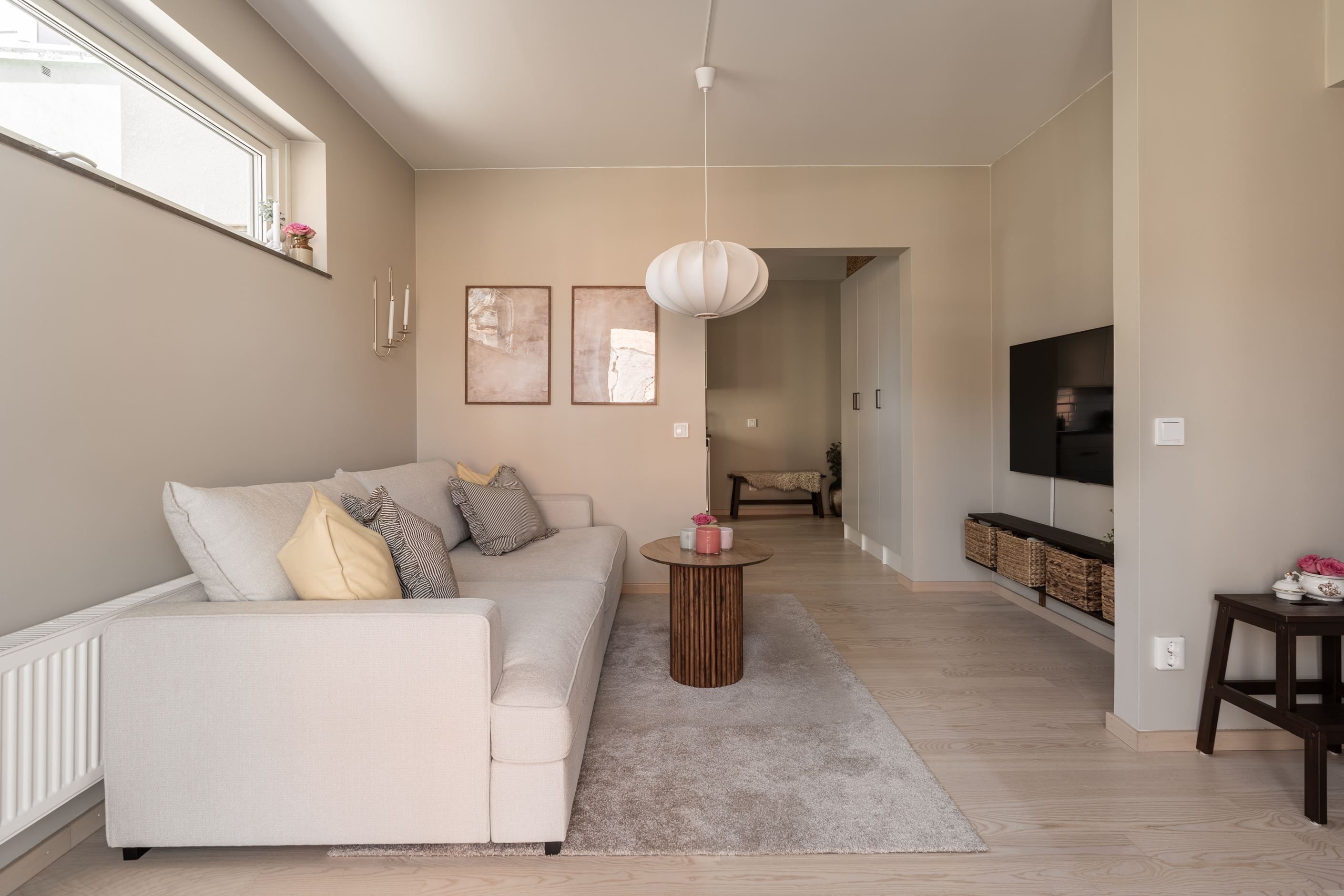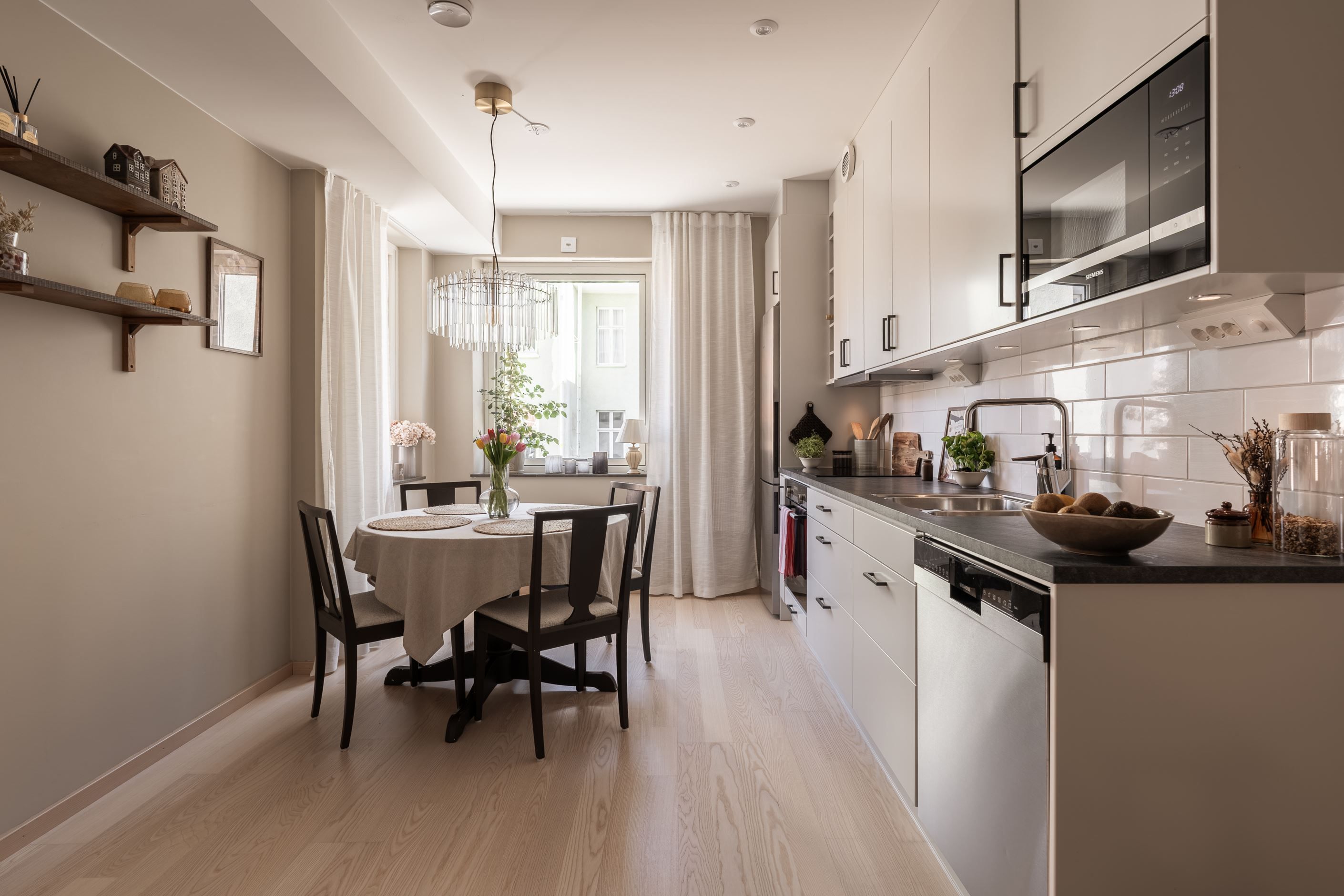 Det stilrena köket är utrustat med moderna vitvaror och har gott om plats för trivsamma middagar med familj och vänner. Vardagsrummet är rymligt och lättmöblerat med plats för både soffgrupp och arbetsyta. Den praktiska alkoven skapar en naturligt avskild sovplats.