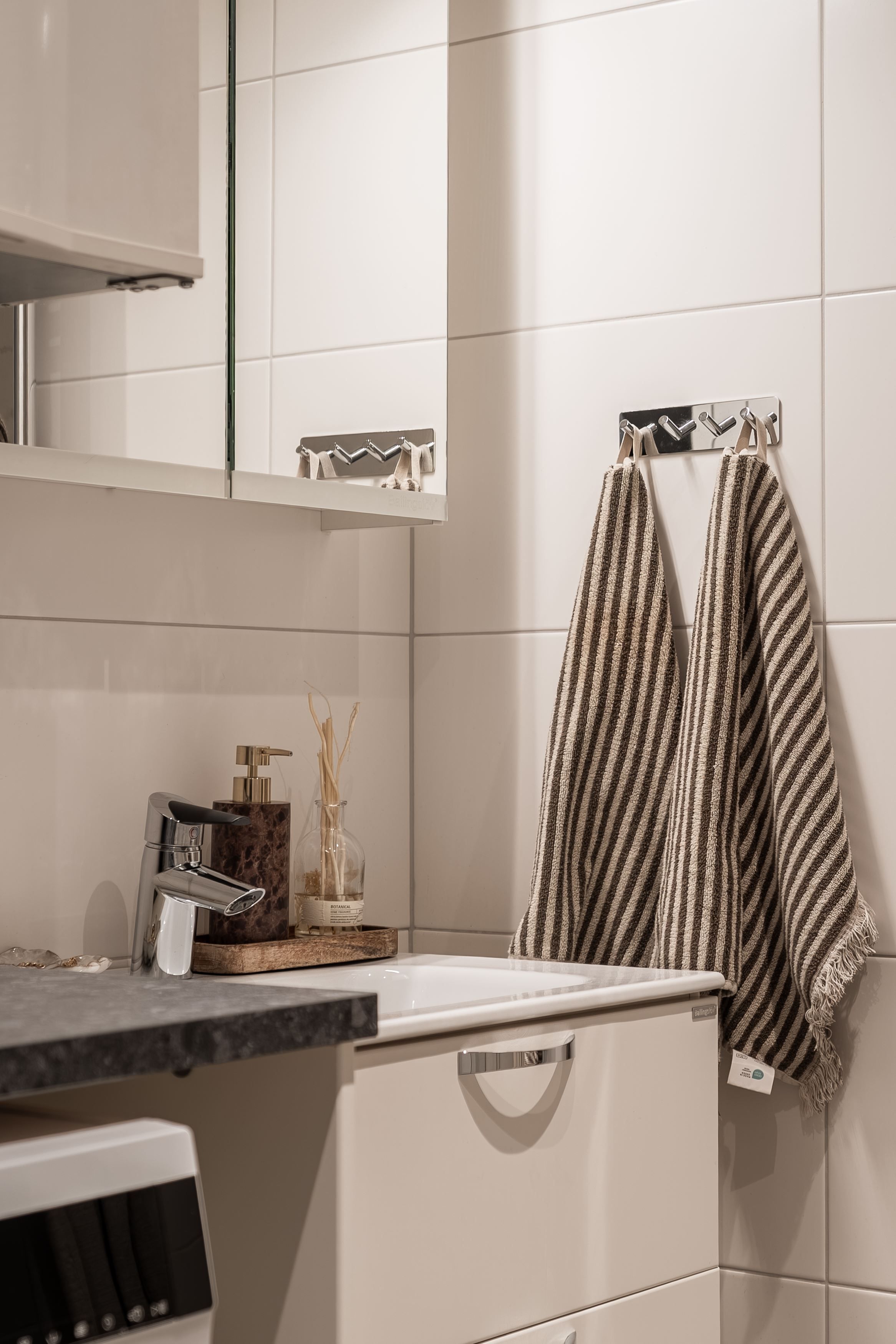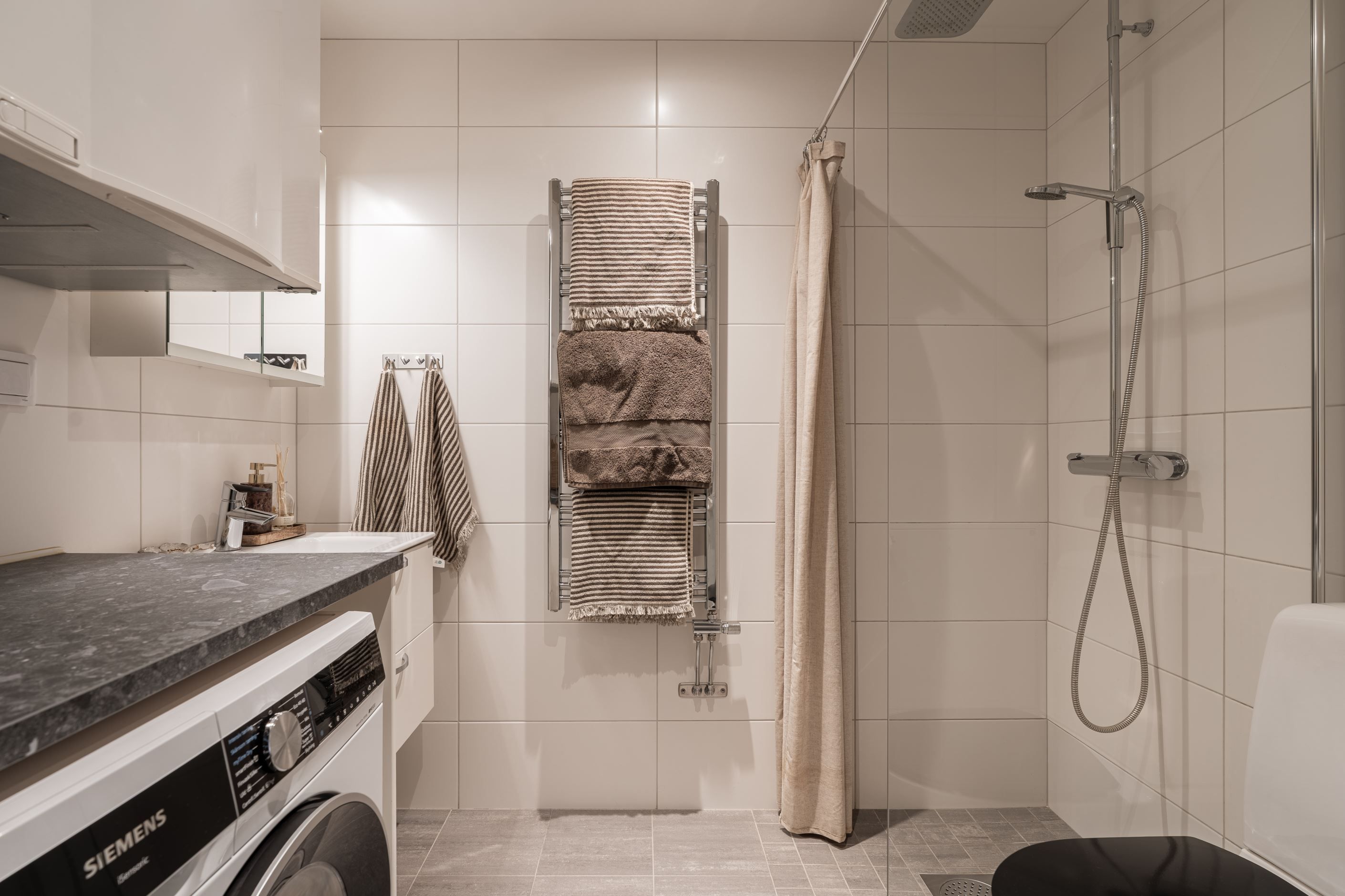 Badrummet är helkaklat och utrustat med kombinerad tvättmaskin och torktumlare för extra bekvämlighet i vardagen.