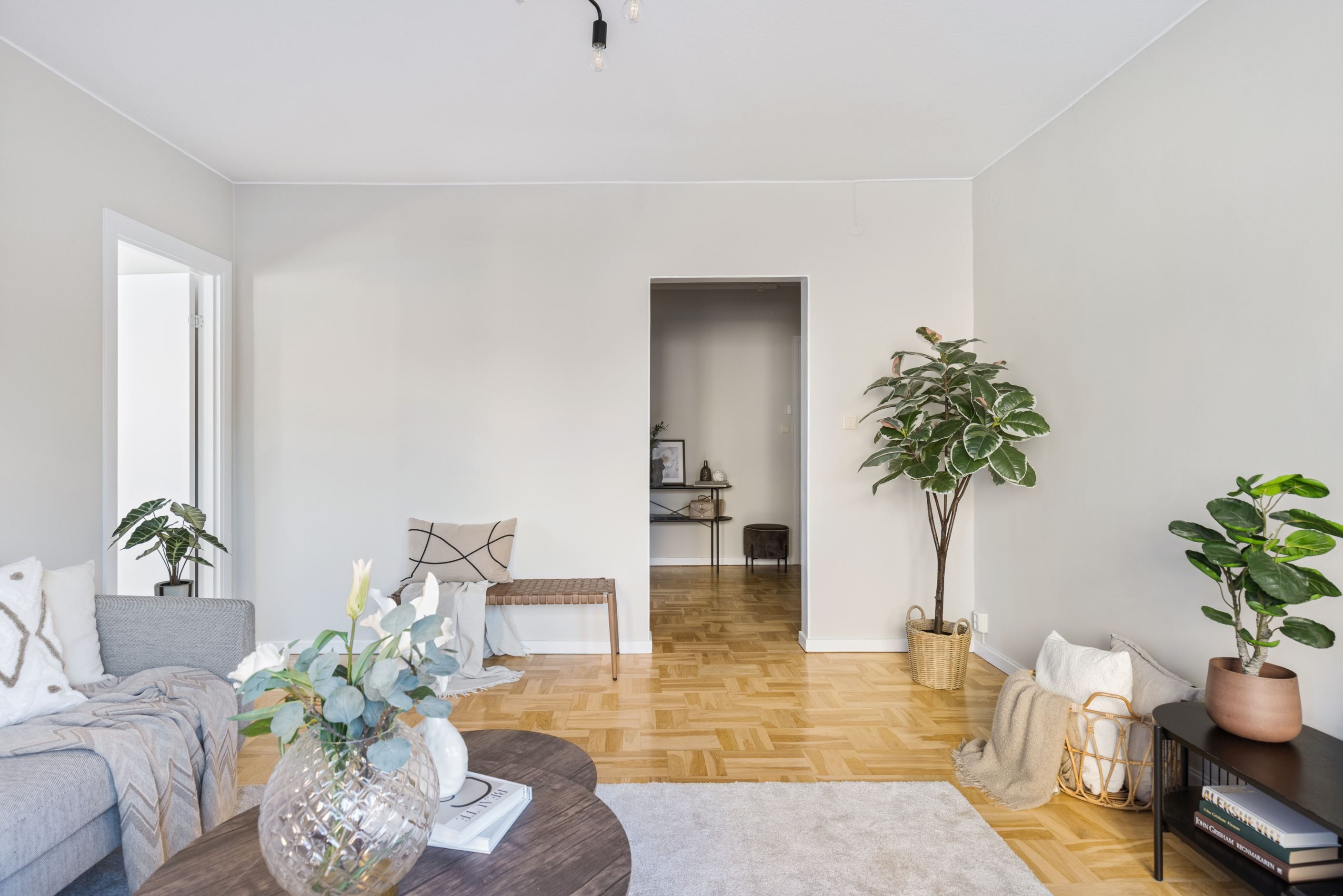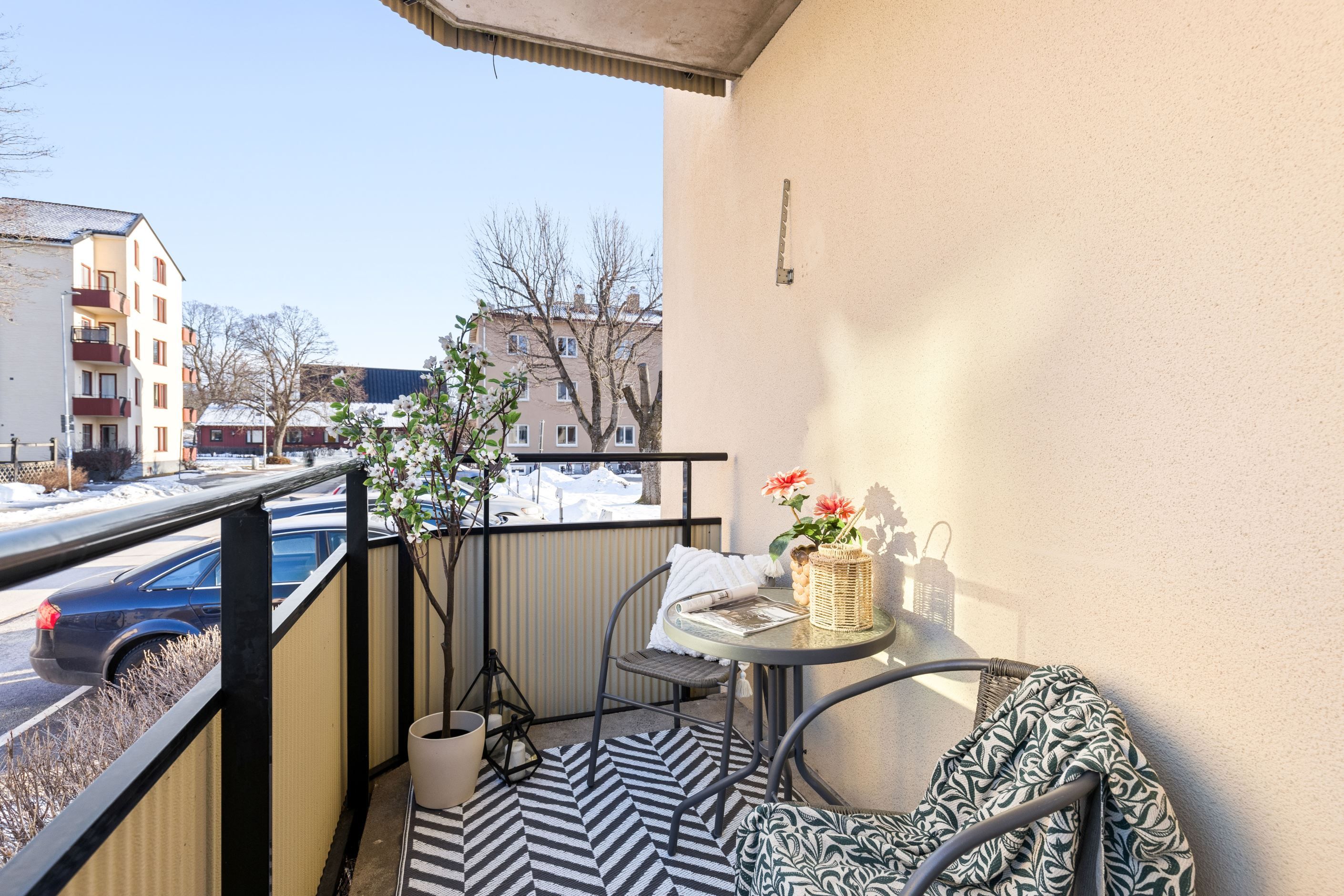 Bostaden är genomgående trevligt renoverad i ljusa moderna färger och vackra golv. Här finns ett nytt snyggt kök, vardagsrum med både burspråk och balkong.