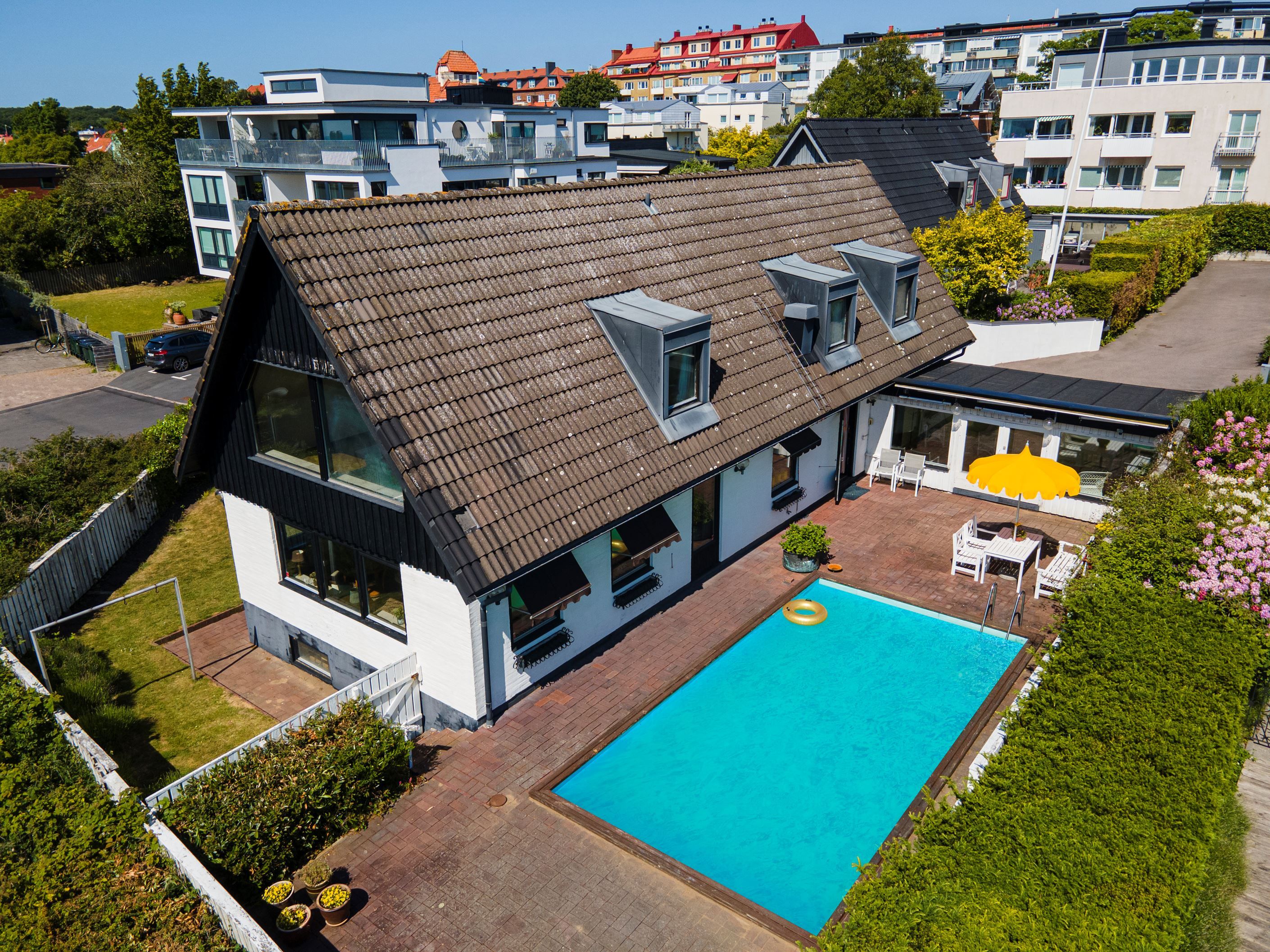 Renoveringsbehovet ger utrymme för egna idéer och potentialen är stor. Utemiljön erbjuder fantastisk havsutsikt, två privata uteplatser och en pool. Läget är perfekt med närhet till stadens puls, restauranger, skolor och mataffärer.