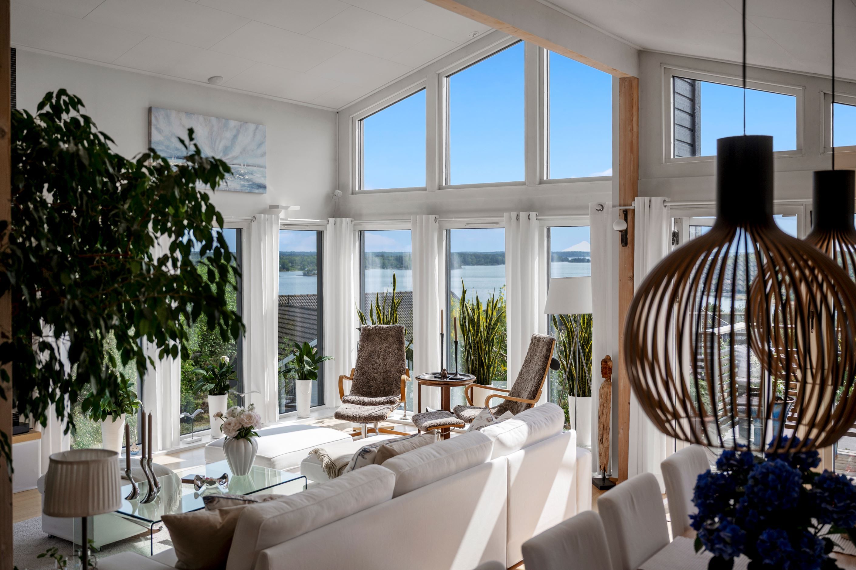 Det arkitektritade huset är en sällsynt kombination av funktion och design där varje linje och vinkel har sin tanke, varje fönster sin vy. Från nästan alla rum blickar du ut över vattnet där fjärden glittrar i morgonljuset, vinden rör vid trädtopparna, och himlen speglar sig i poolens yta.