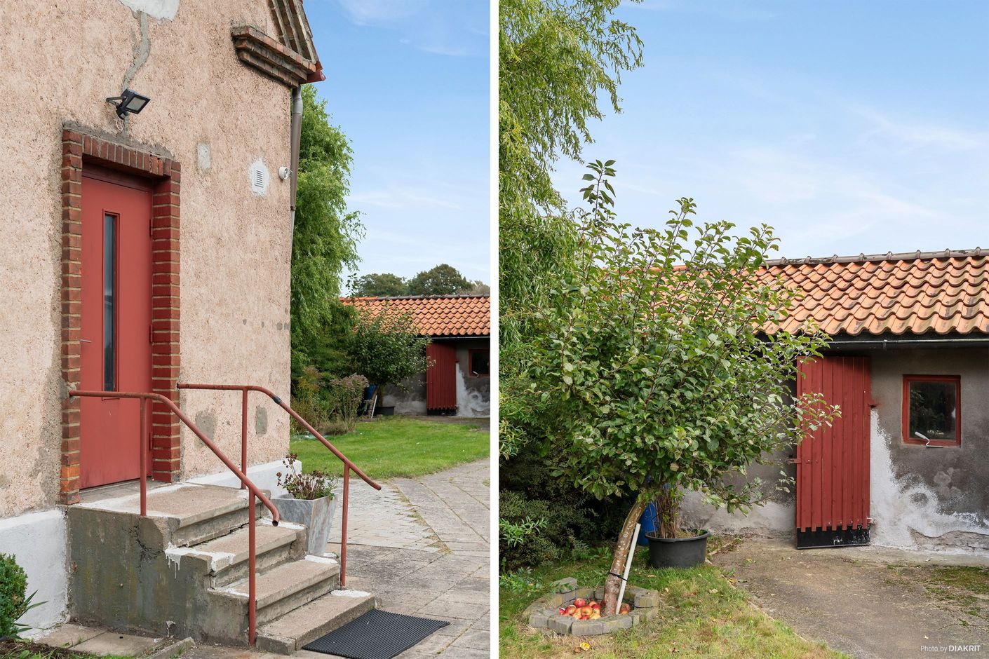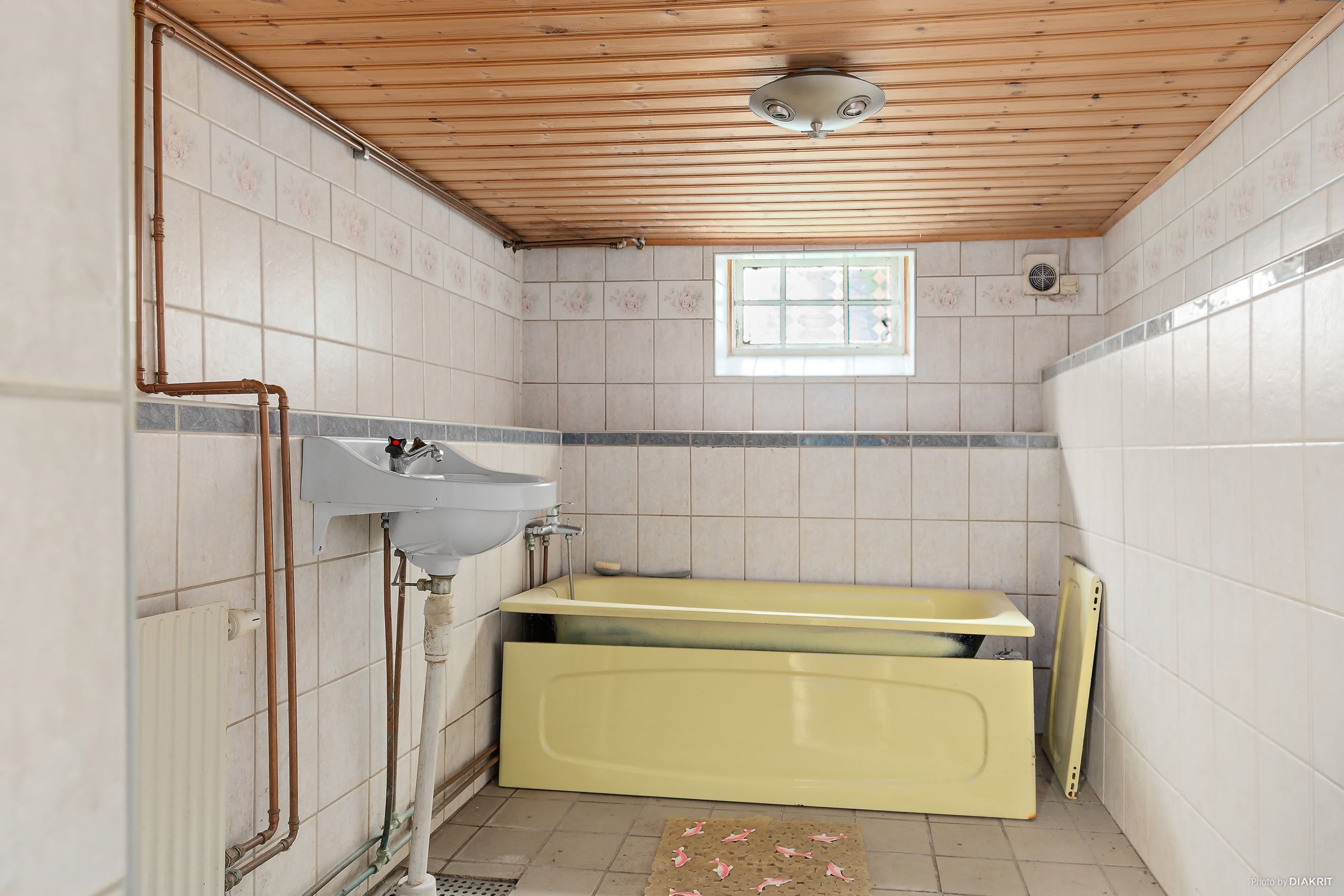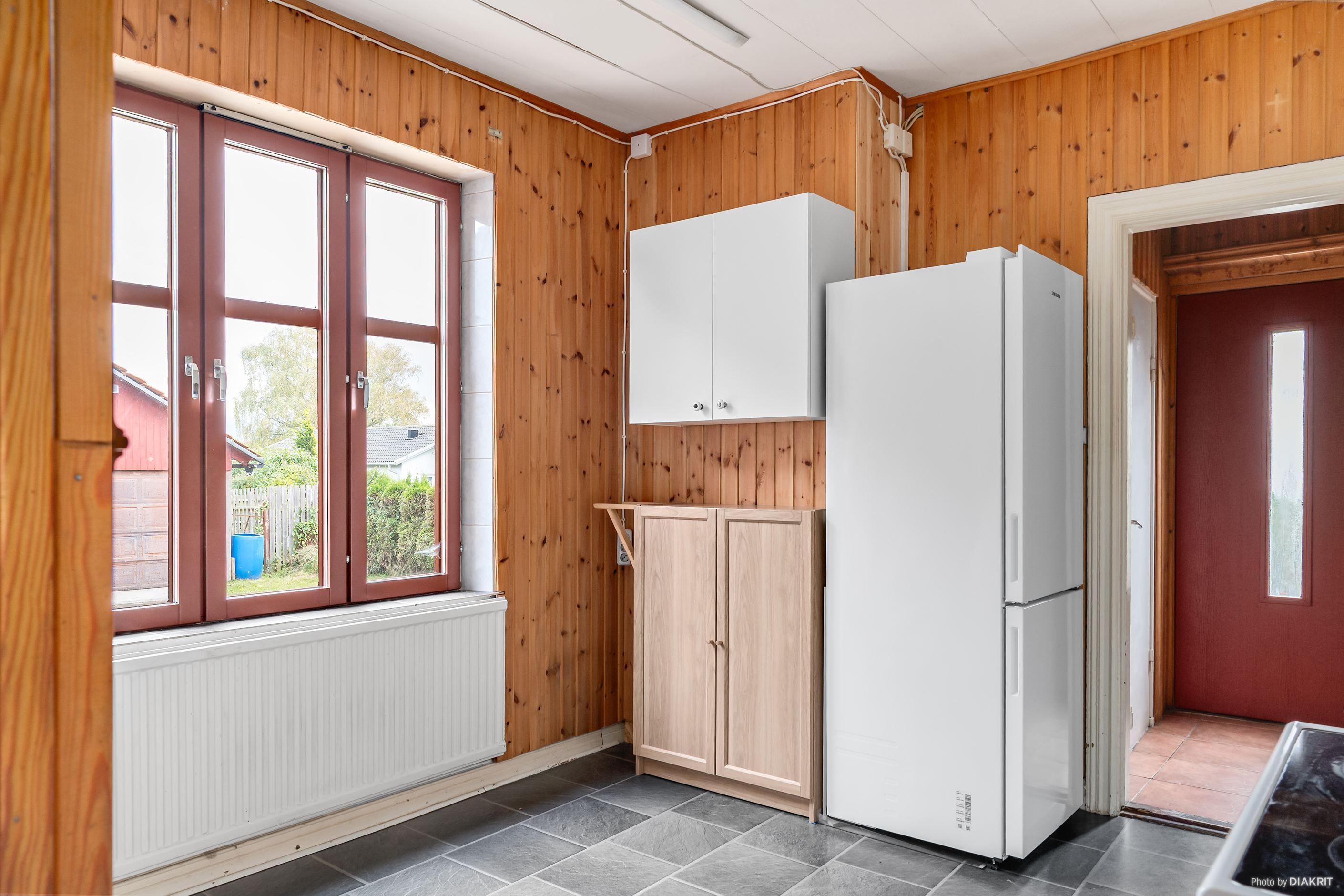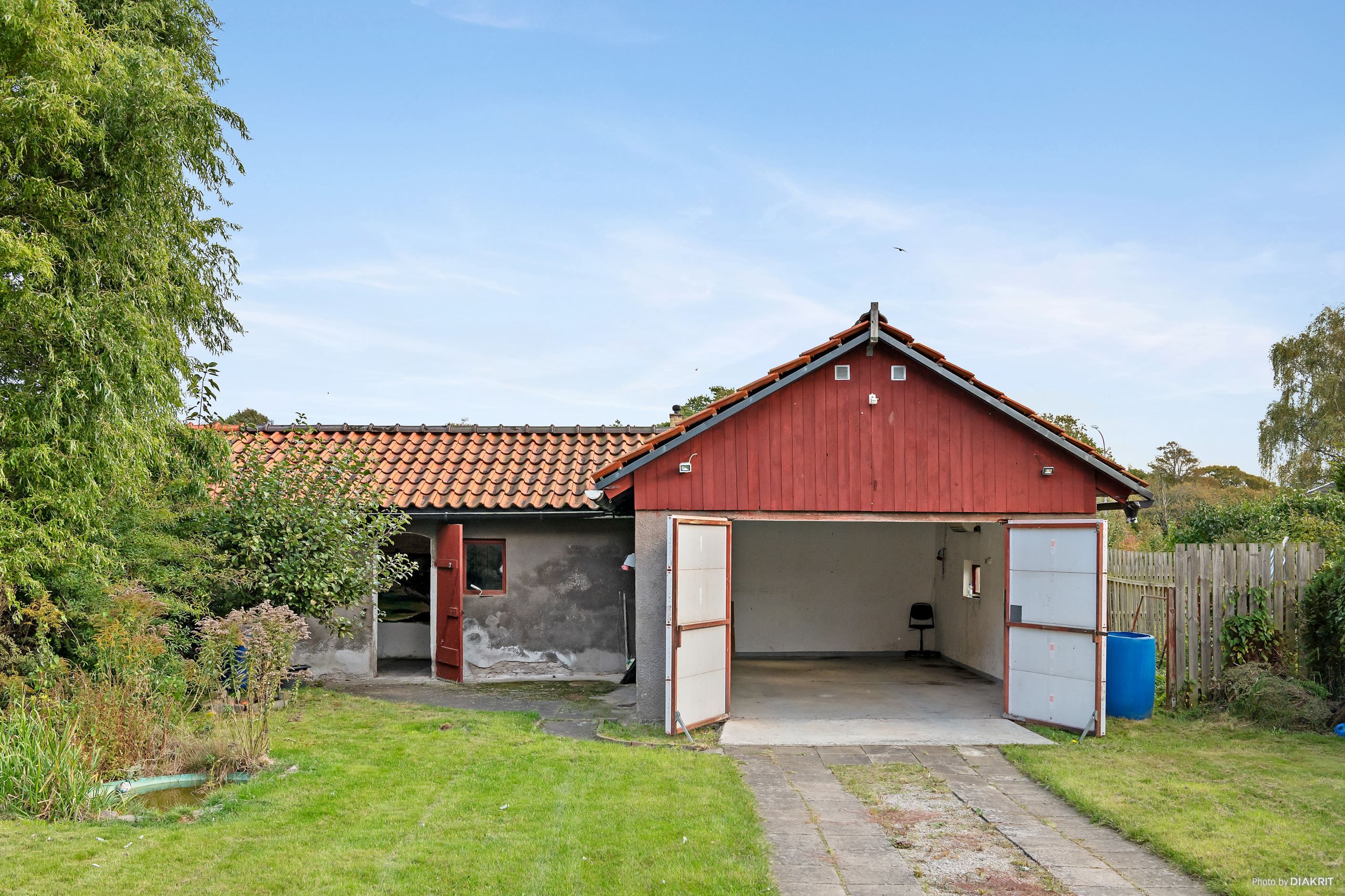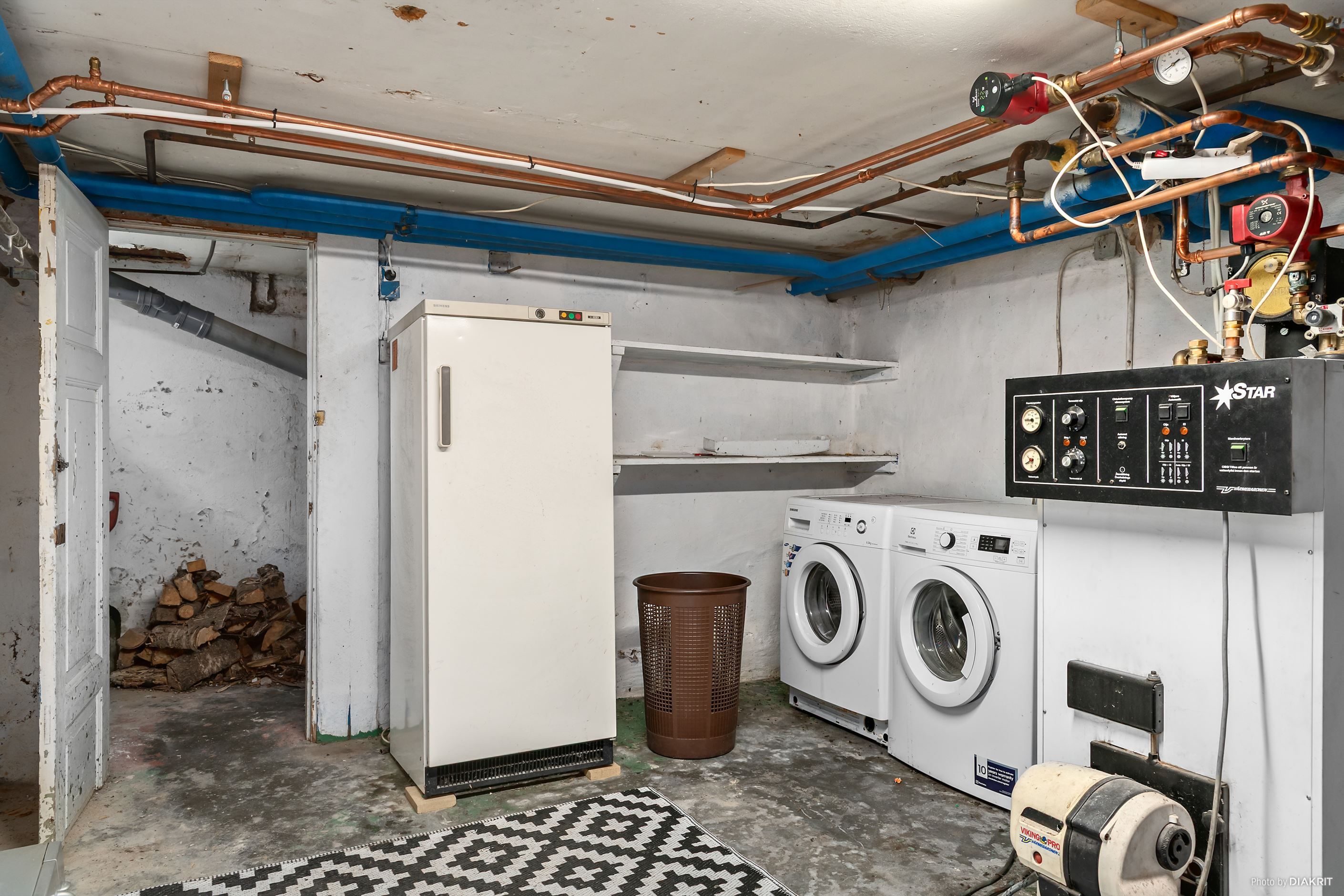 Källaren erbjuder extra ytor för förvaring, hobbyrum eller tvättmöjligheter, och på tomten finns även ett stort garage samt uthus med förvaringsmöjligheter.