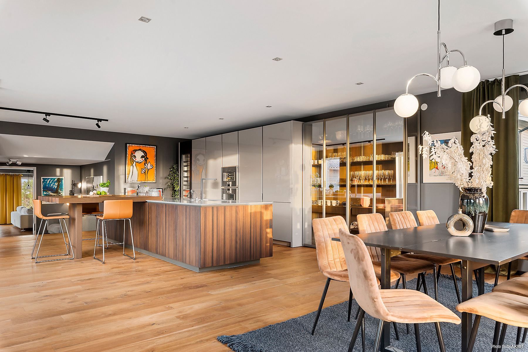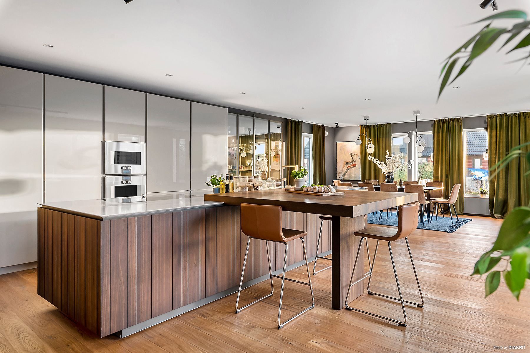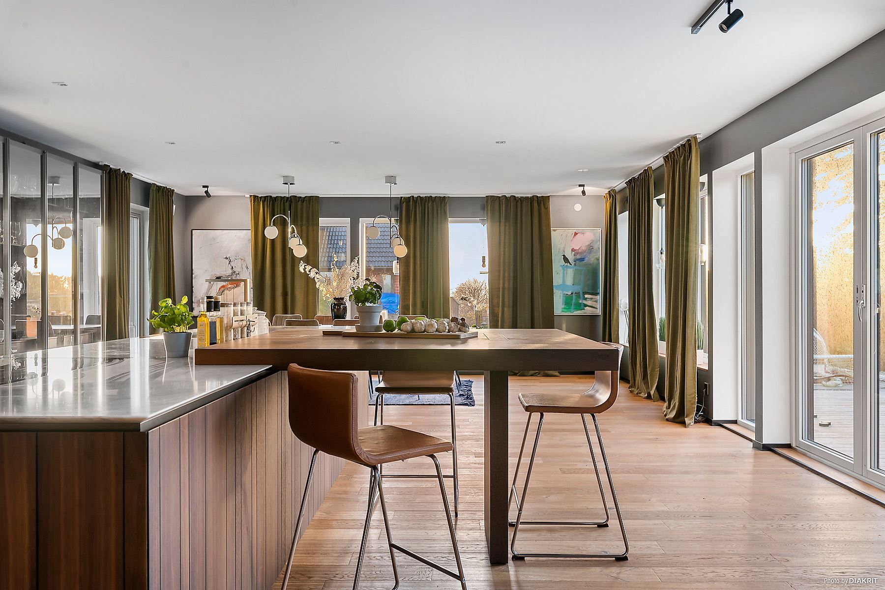 Husets östra del erbjuder gedigna sociala ytor där kök och vardagsrum integreras socialt med varandra och erbjuder en hisnande yta om ö +60kvm. Ett högklassigt italienskt kök från Poliform med generösa ytor för matlagning och socialt umgänge.