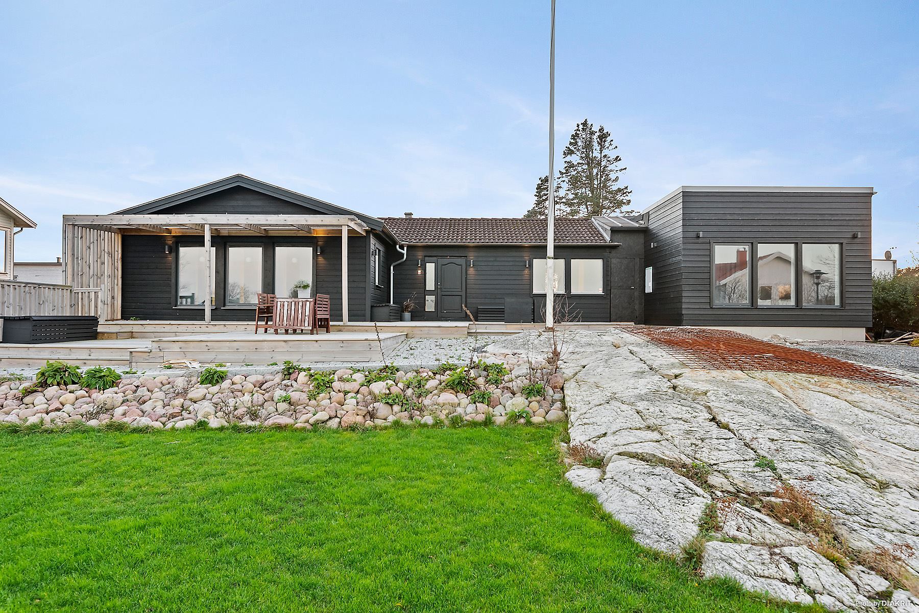Den U-formade formen på huset gör att ni bor praktiskt på ett plan med privata omslutande utemiljöer med oändliga möjligheter. Vill ni ni ha ännu närmre närhet till vatten så finns det bra möjligheter till att bygga in insynsskyddad pool.