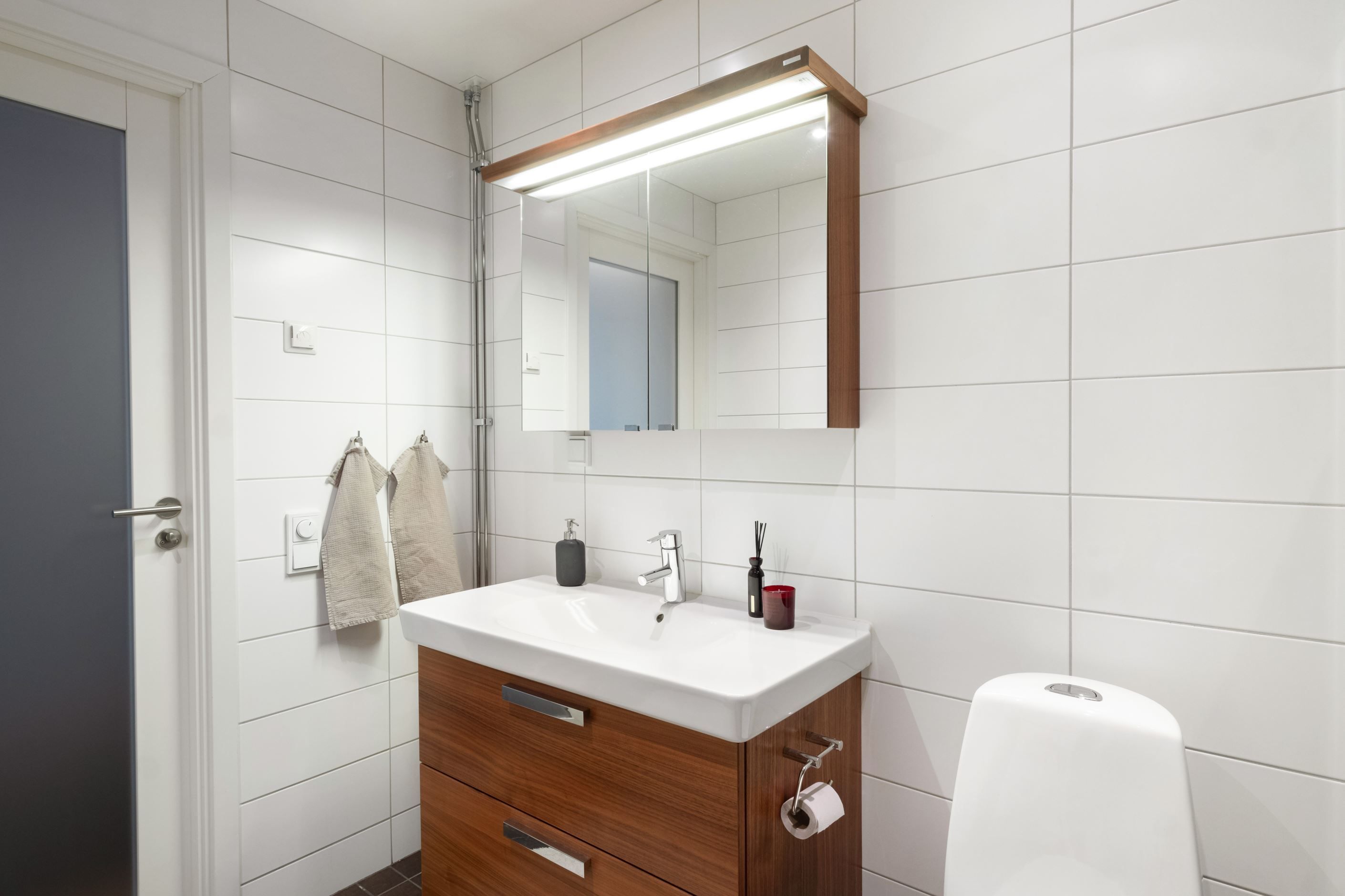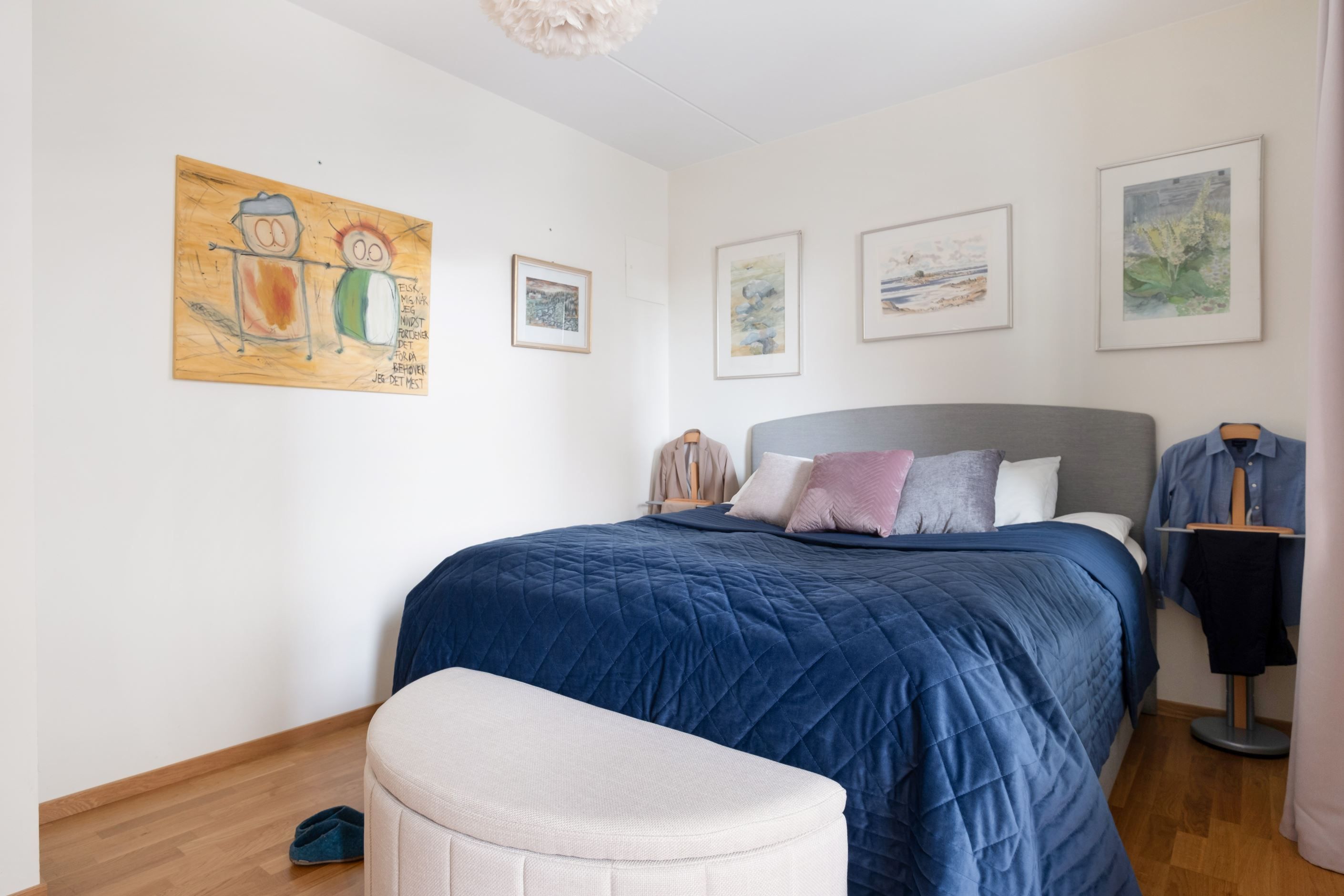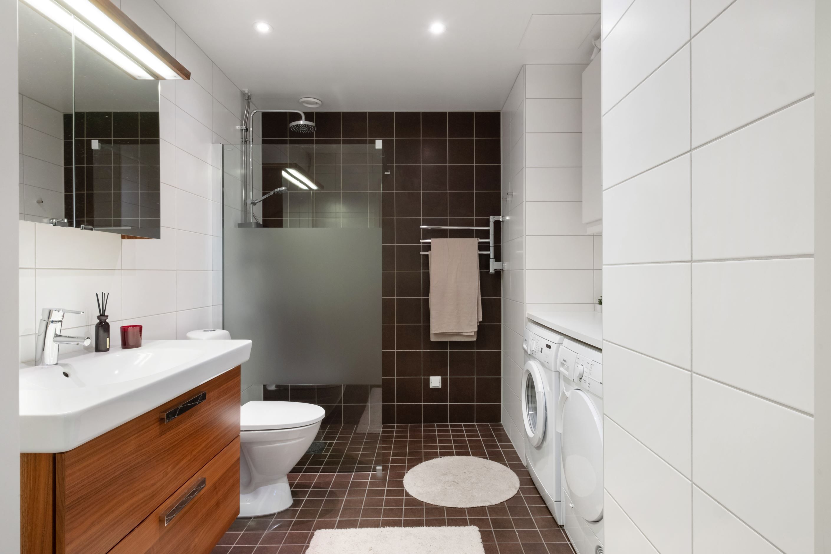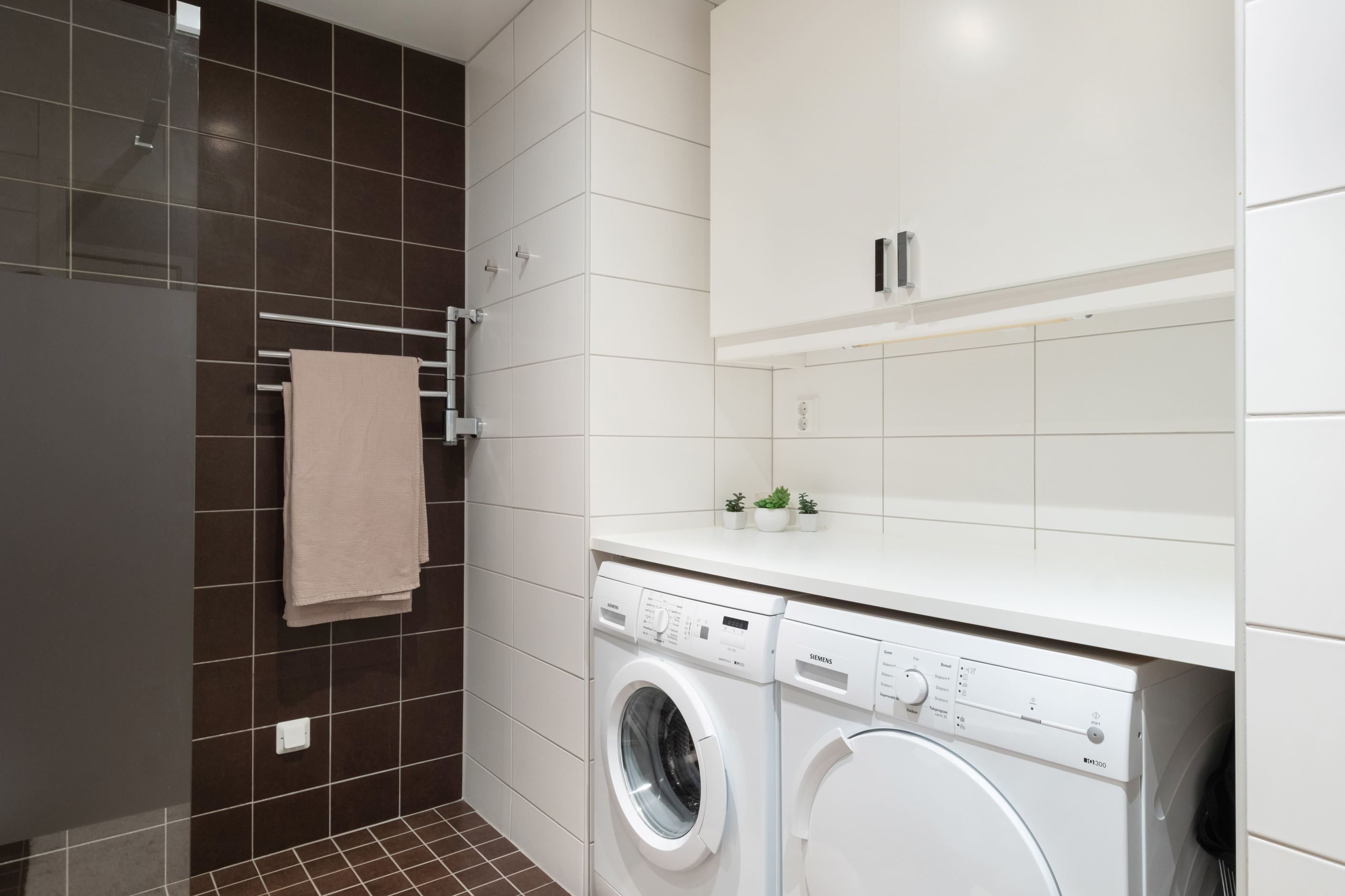 Badrummet är rymligt och smakfullt inrett med dusch bakom delvis frostat glas, tvättmaskin och torktumlare samt golvvärme som ger extra komfort. Förvaringsmöjligheterna är generösa med både en stor klädkammare och flera garderober.