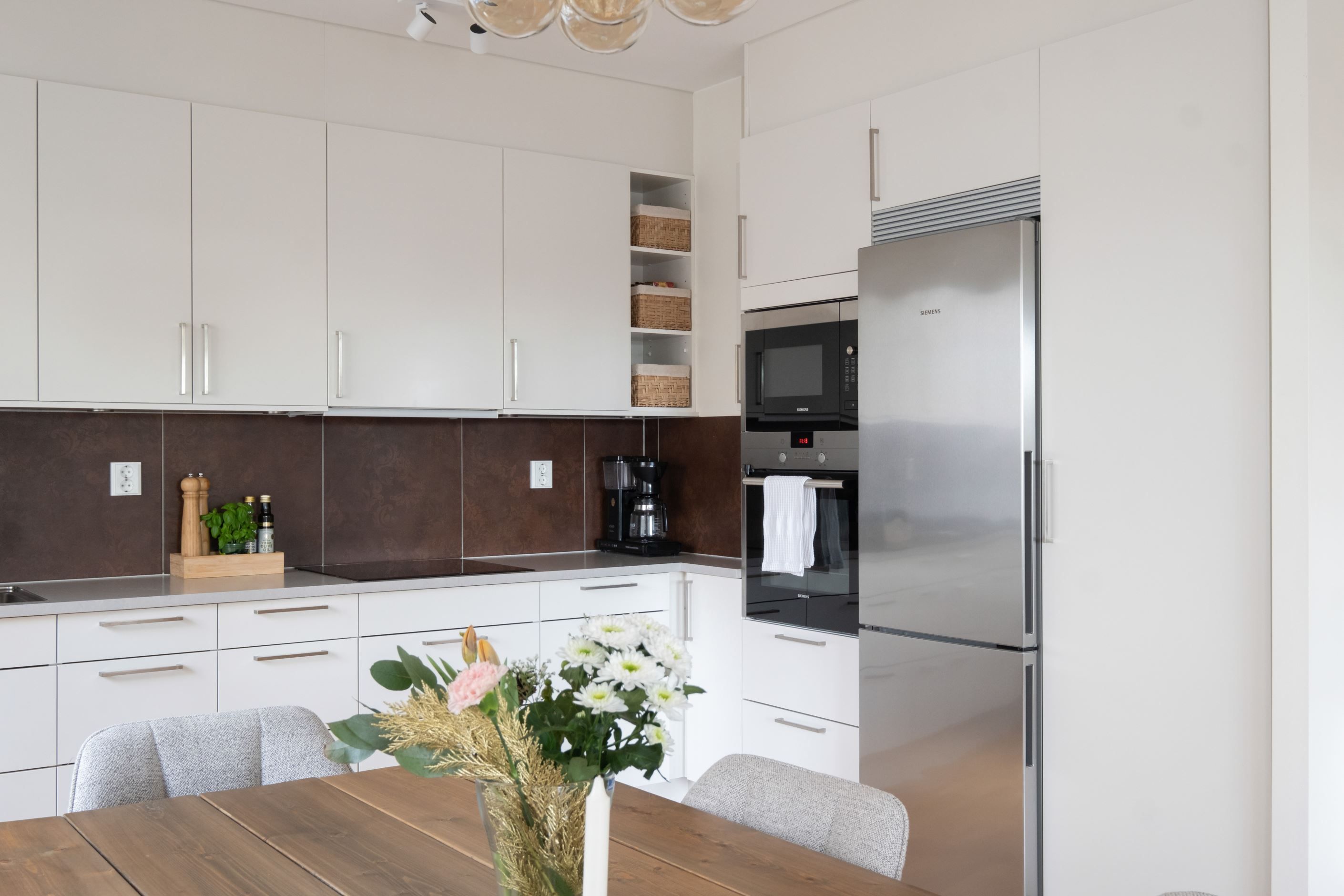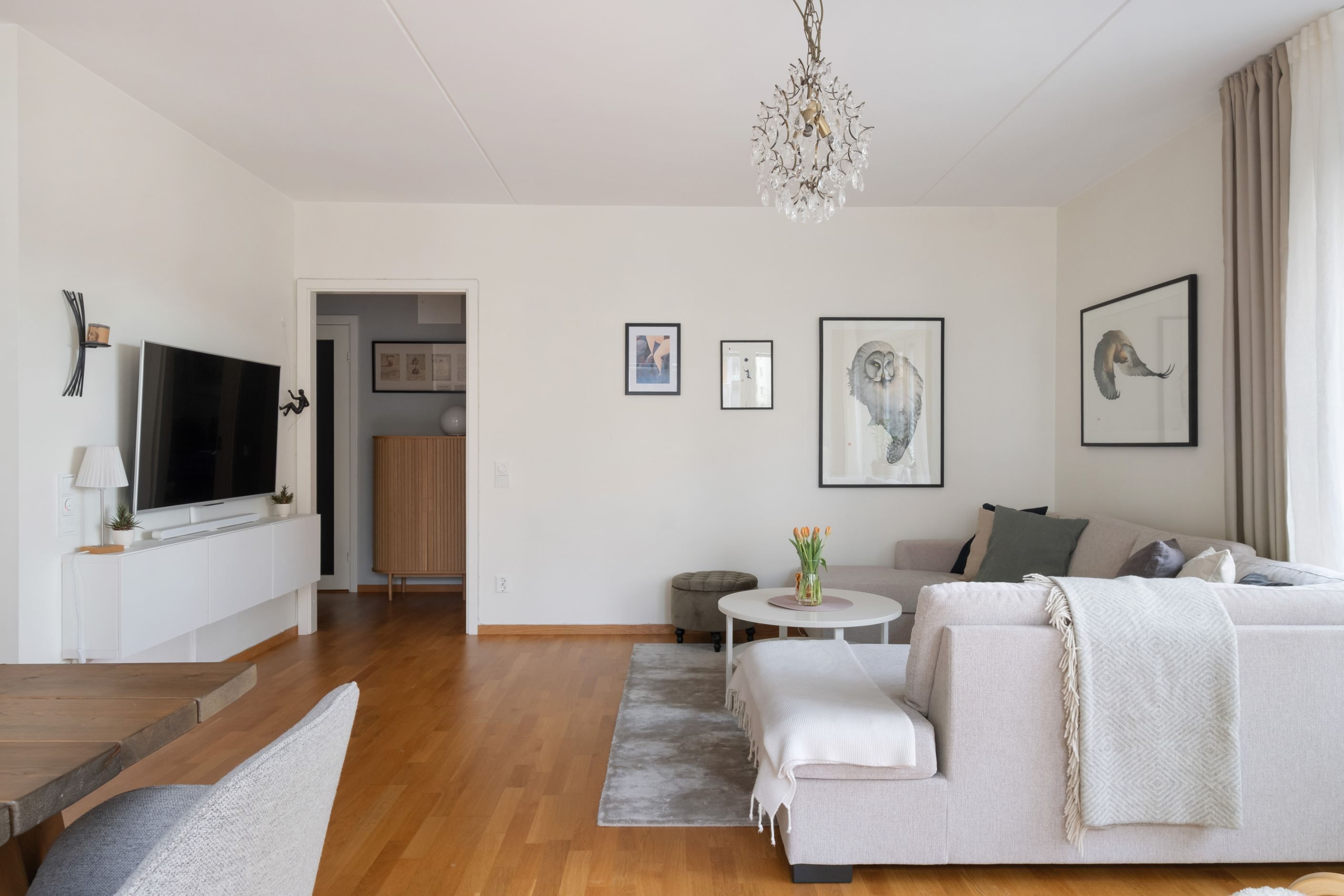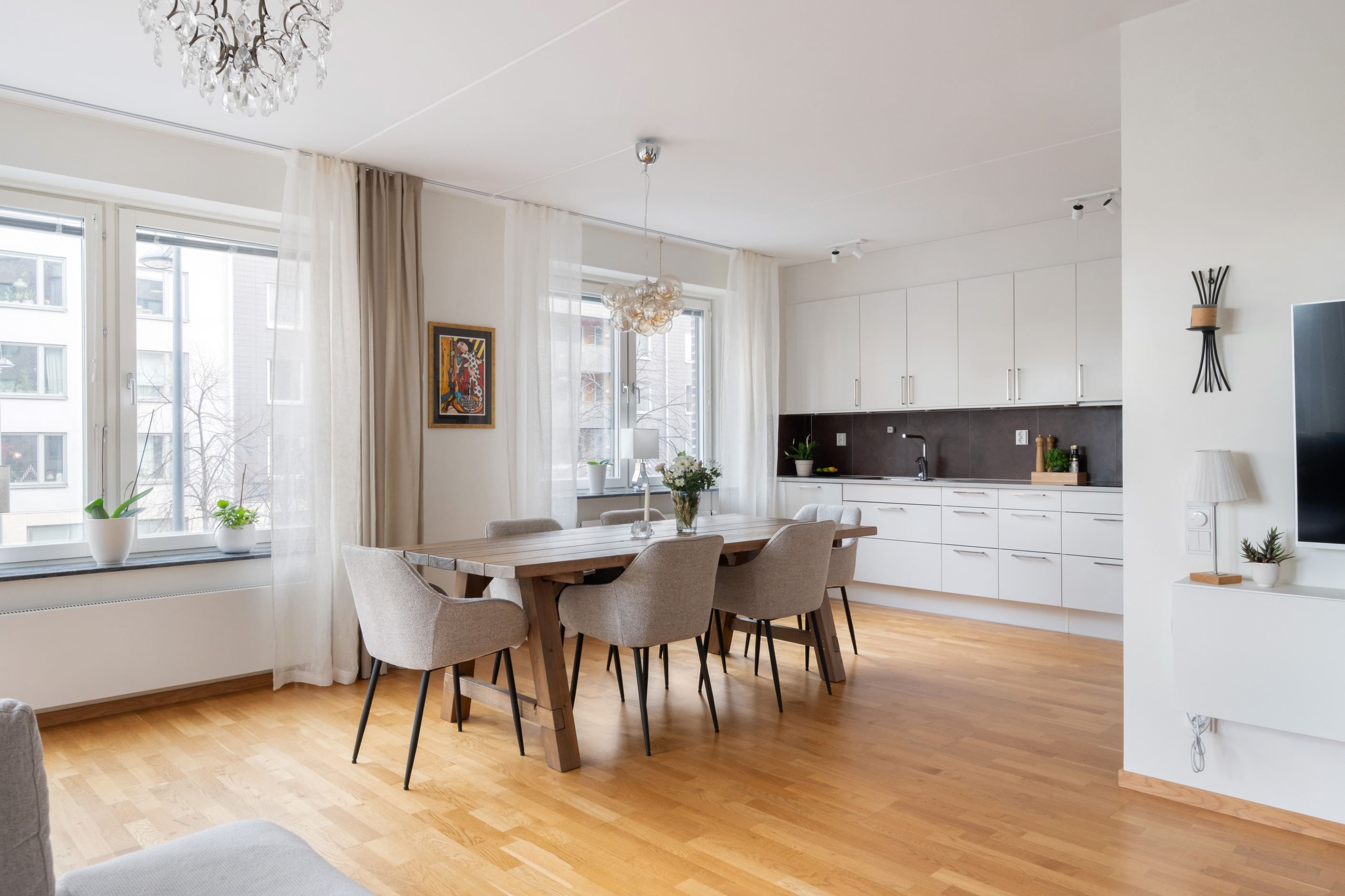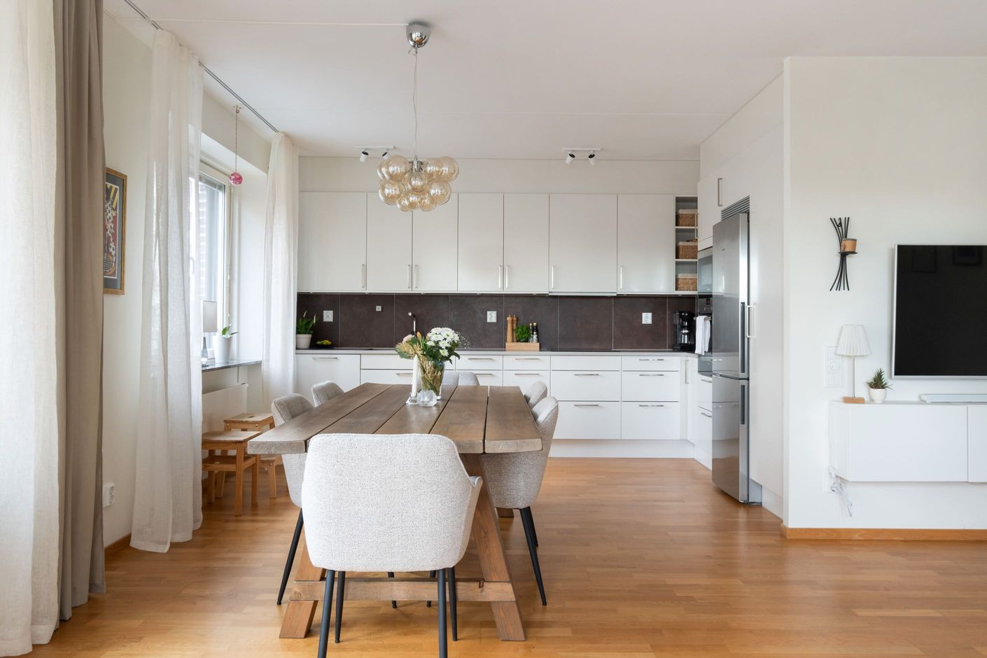 Planlösningen är genomtänkt och lätt att möblera. Det stilrena, fullutrustade köket ligger i öppen anslutning till vardagsrummet – en social yta som utan problem rymmer ett stort matbord och en rejäl soffgrupp. Perfekt för middagar och umgänge.