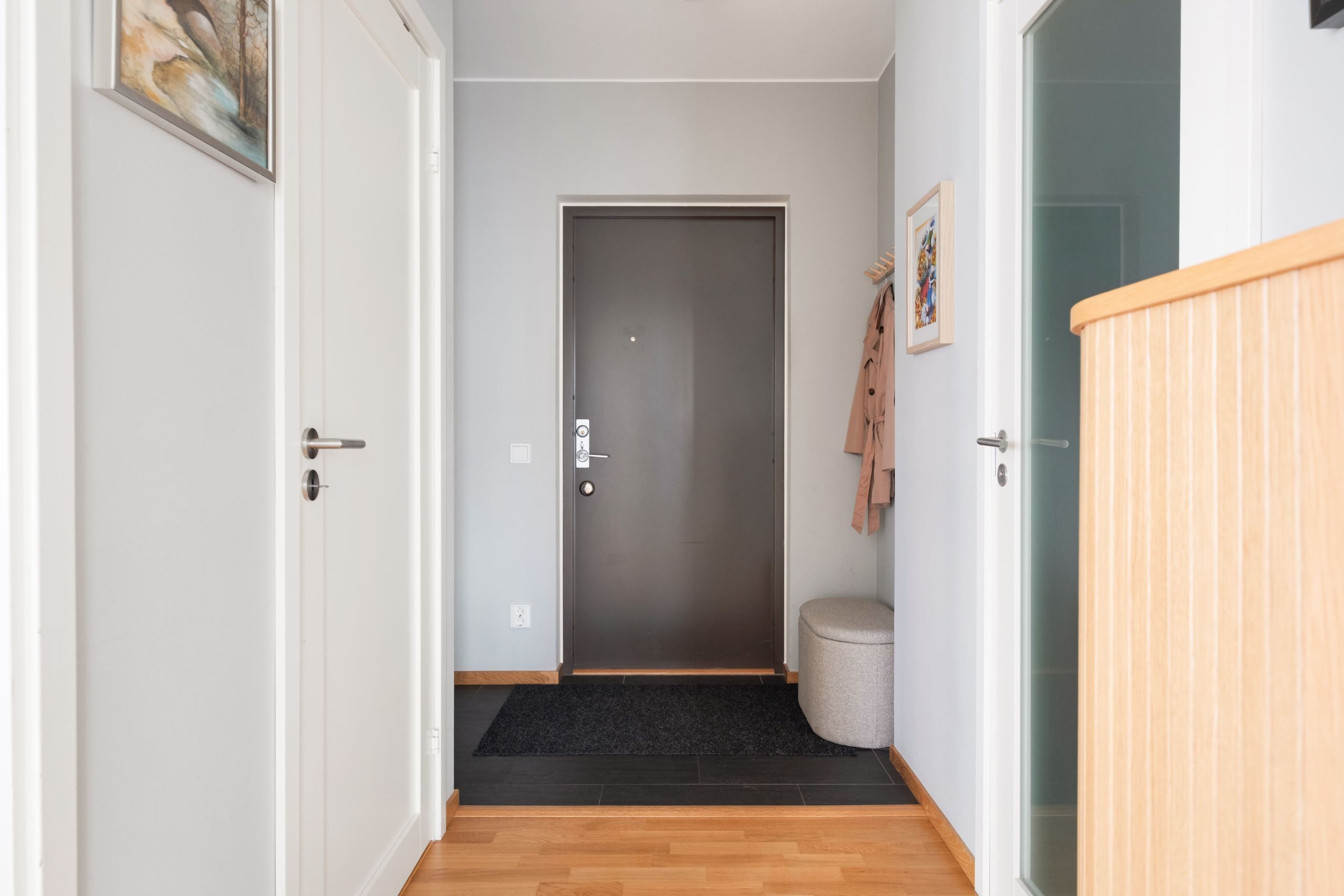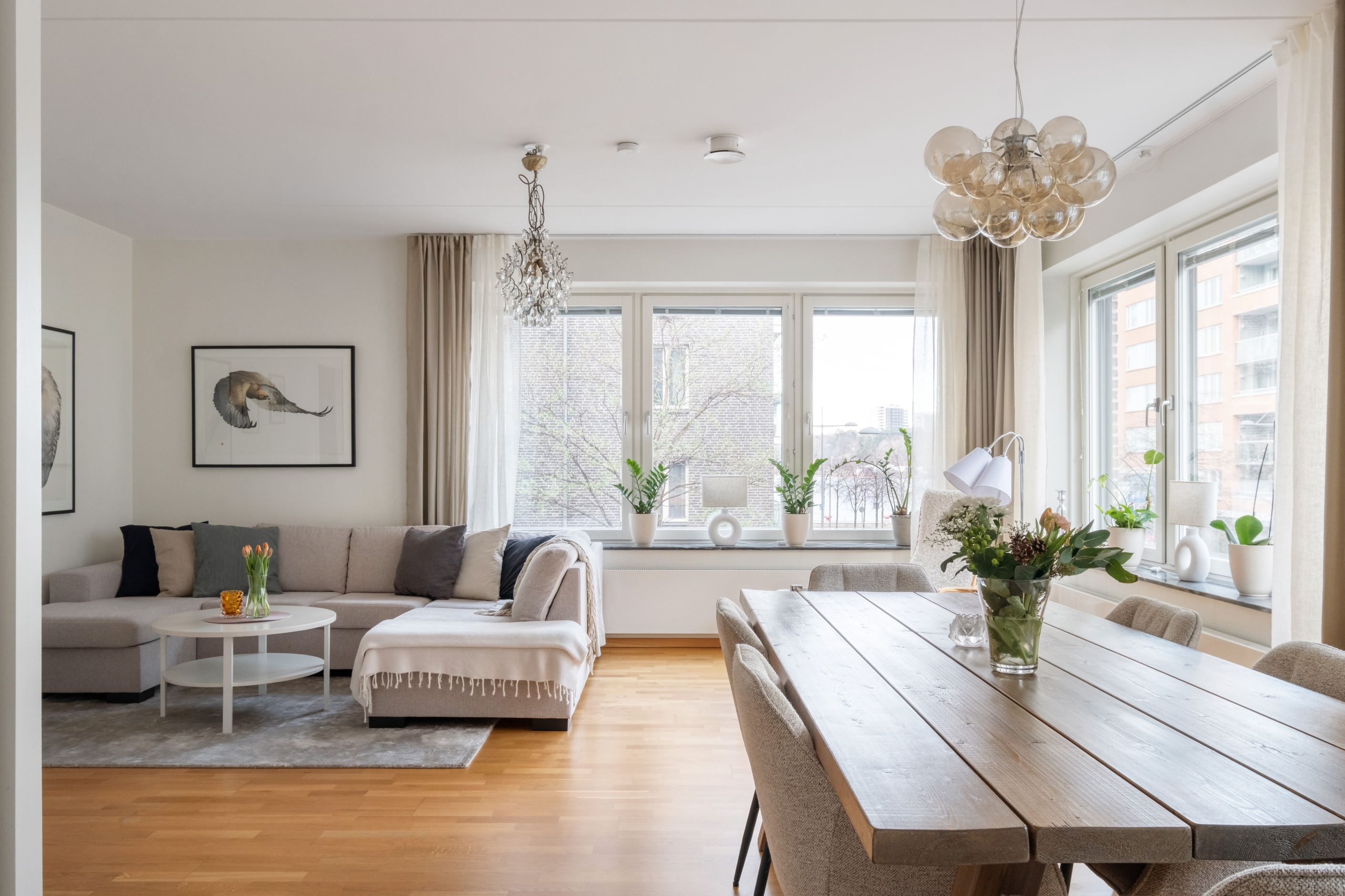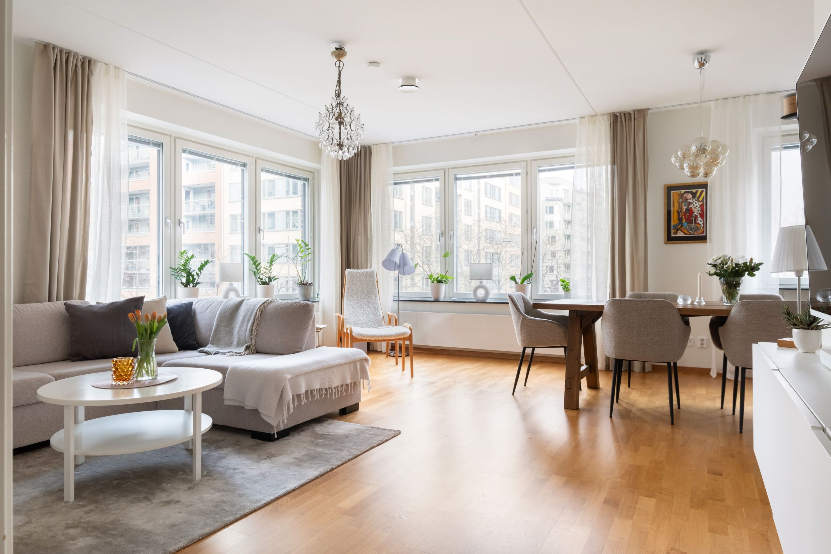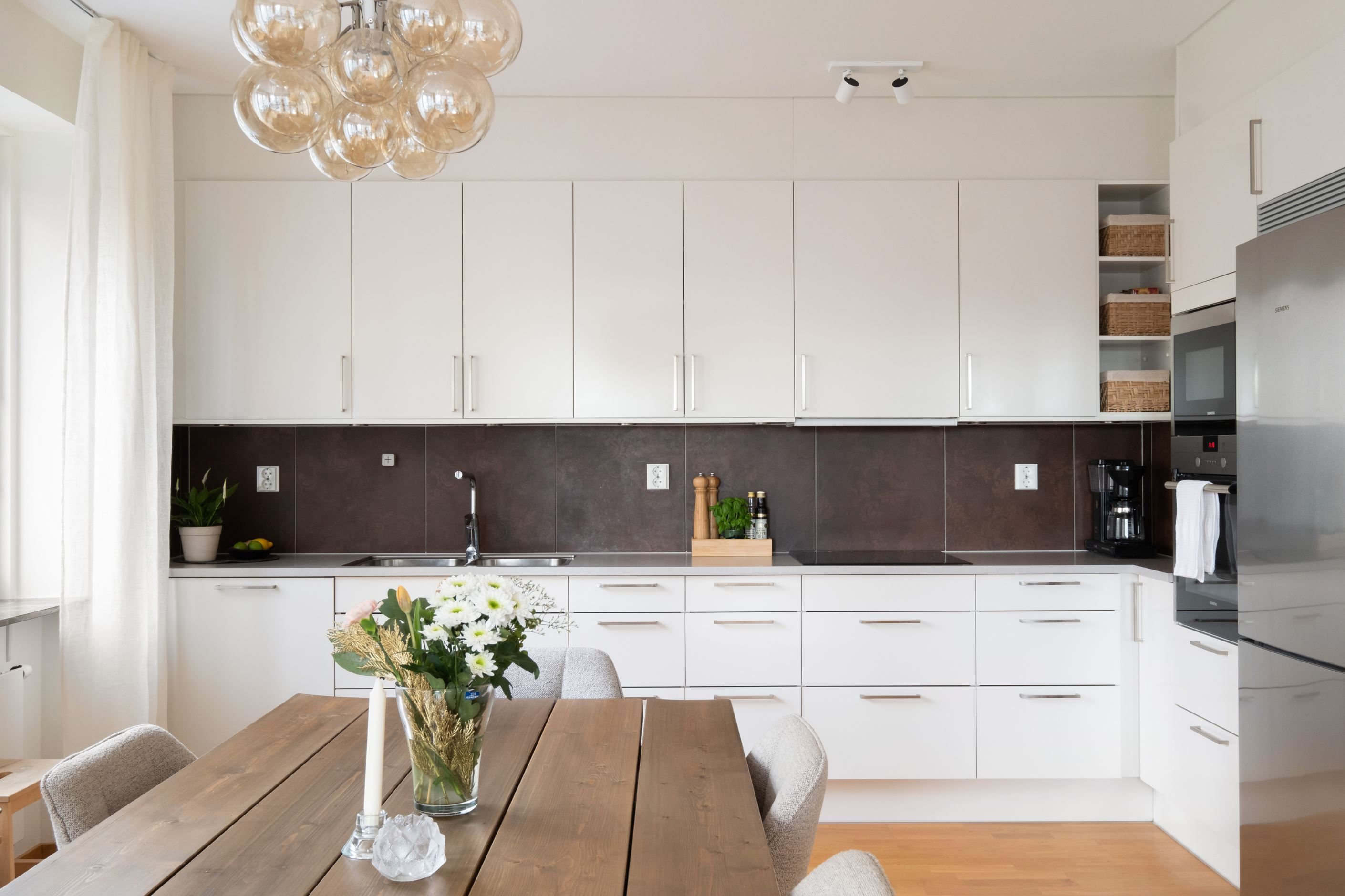 Planlösningen är genomtänkt och lätt att möblera. Det stilrena, fullutrustade köket ligger i öppen anslutning till vardagsrummet – en social yta som utan problem rymmer ett stort matbord och en rejäl soffgrupp. Perfekt för middagar och umgänge.