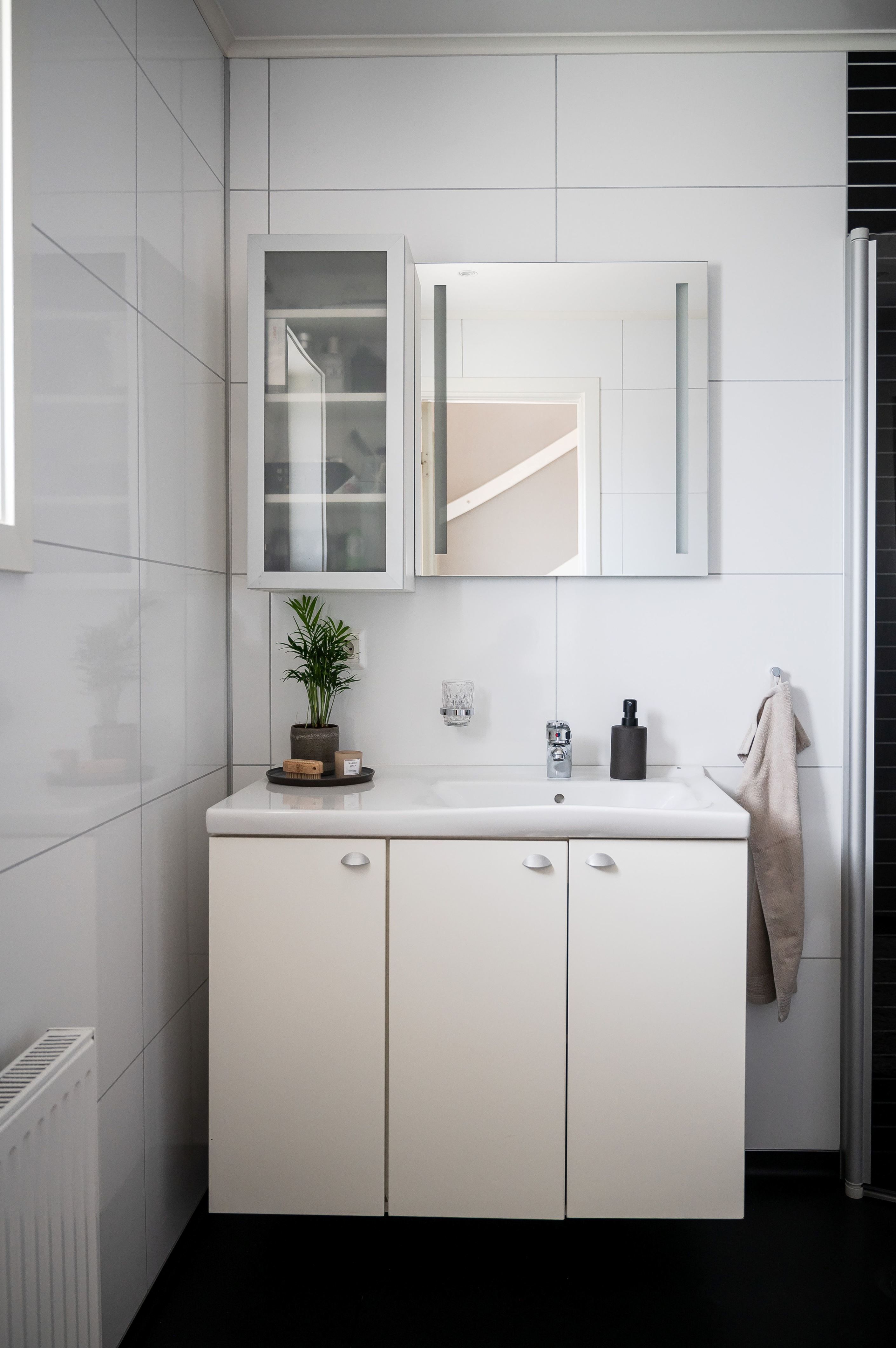 Entréplan med genomgående fräscha och välbevarade ytskikt, renoverad dusch/wc i klassiskt vitt/svart.