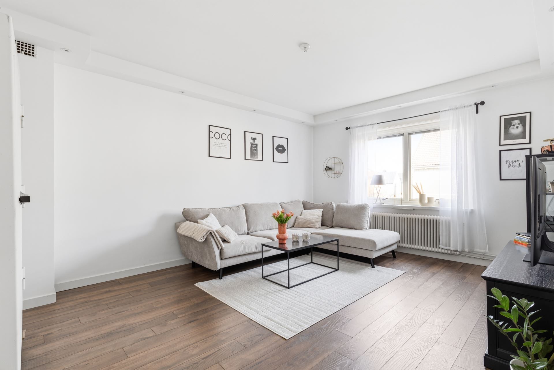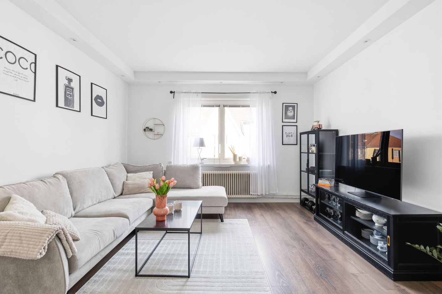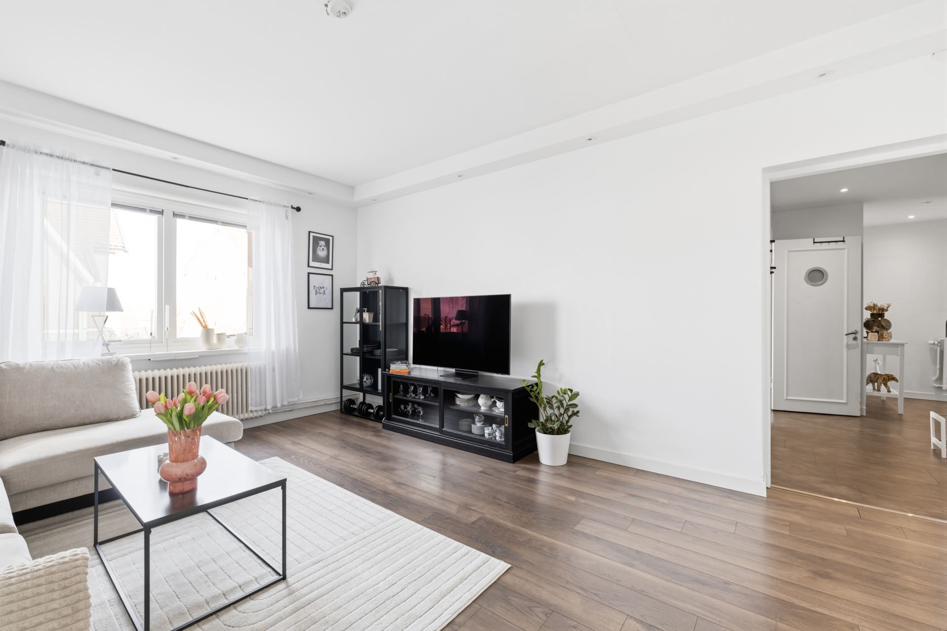 Planlösningen är stilrent genomtänkt med fönster i två väderstreck som ger ett generöst ljusflöde och en luftig, harmonisk atmosfär. Den imponerande takhöjden förstärker känslan av rymd och skapar ett hem som upplevs både elegant och inbjudande. Här möts klassiska detaljer och moderna materialval i en smakfull helhet.