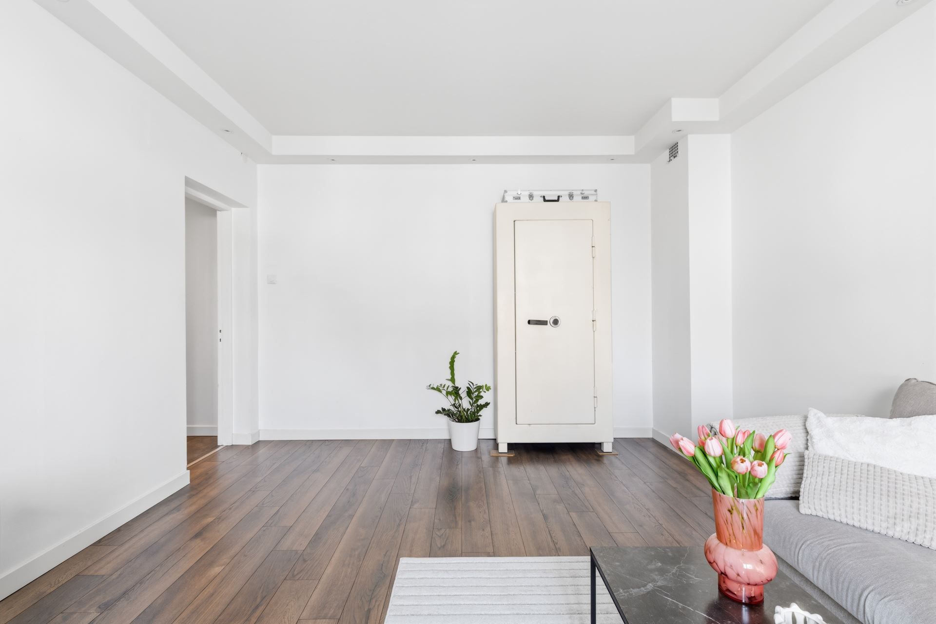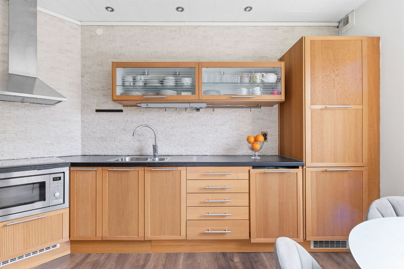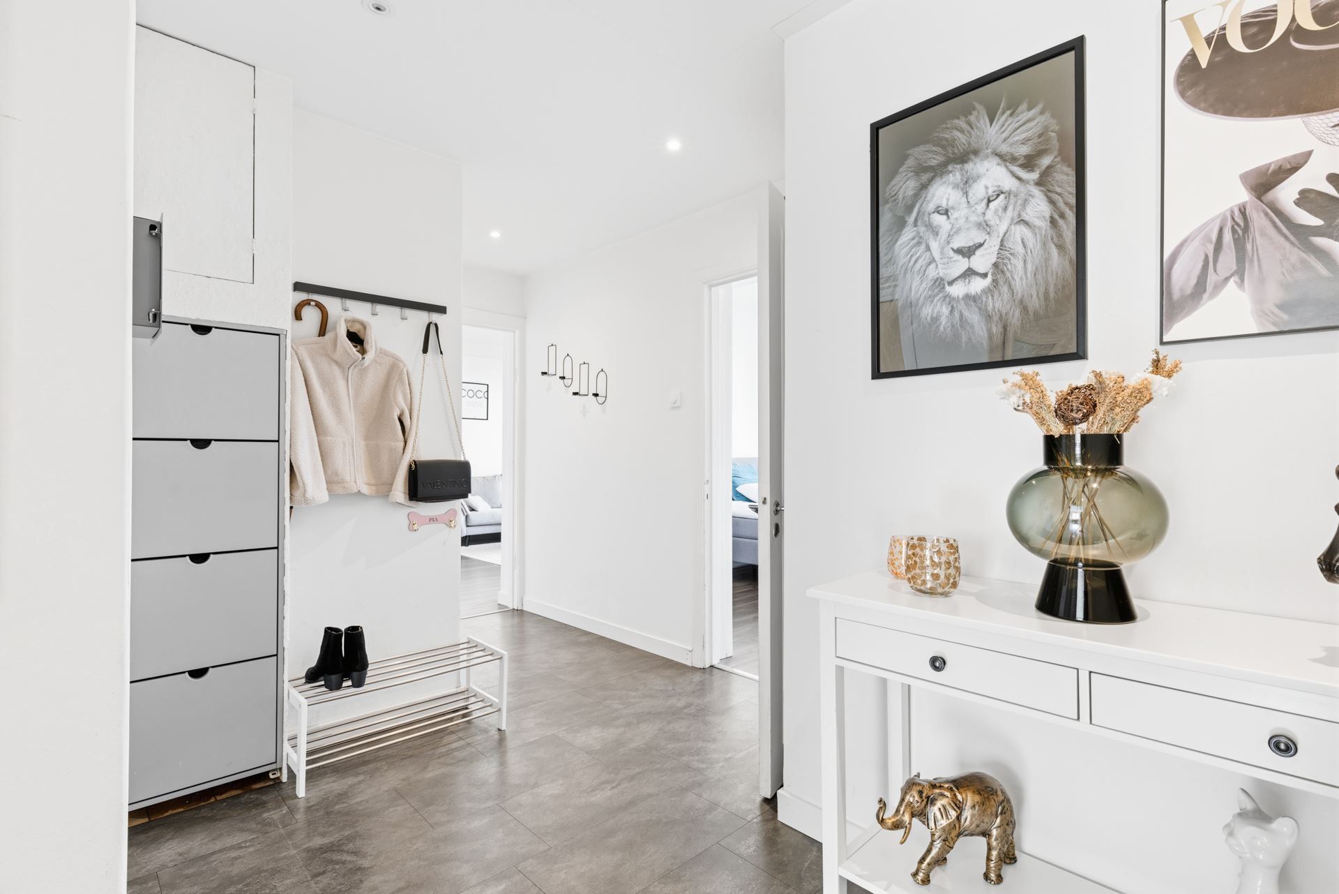 Planlösningen är stilrent genomtänkt med fönster i två väderstreck som ger ett generöst ljusflöde och en luftig, harmonisk atmosfär. Den imponerande takhöjden förstärker känslan av rymd och skapar ett hem som upplevs både elegant och inbjudande. Här möts klassiska detaljer och moderna materialval i en smakfull helhet.