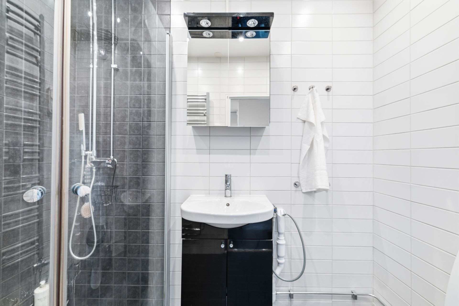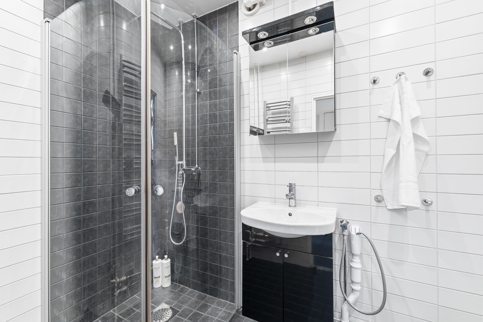 Bostaden erbjuder ett modernt badrum med kakel och klinker samt förberedd installation för tvättmaskin. Köket är fullt utrustat med goda arbetsytor och rikligt med förvaring – perfekt för såväl vardag som sociala middagar. Vardagsrummet rymmer enkelt större möblemang och blir en naturlig samlingspunkt, medan sovrummet är rofyllt och generöst tilltaget.