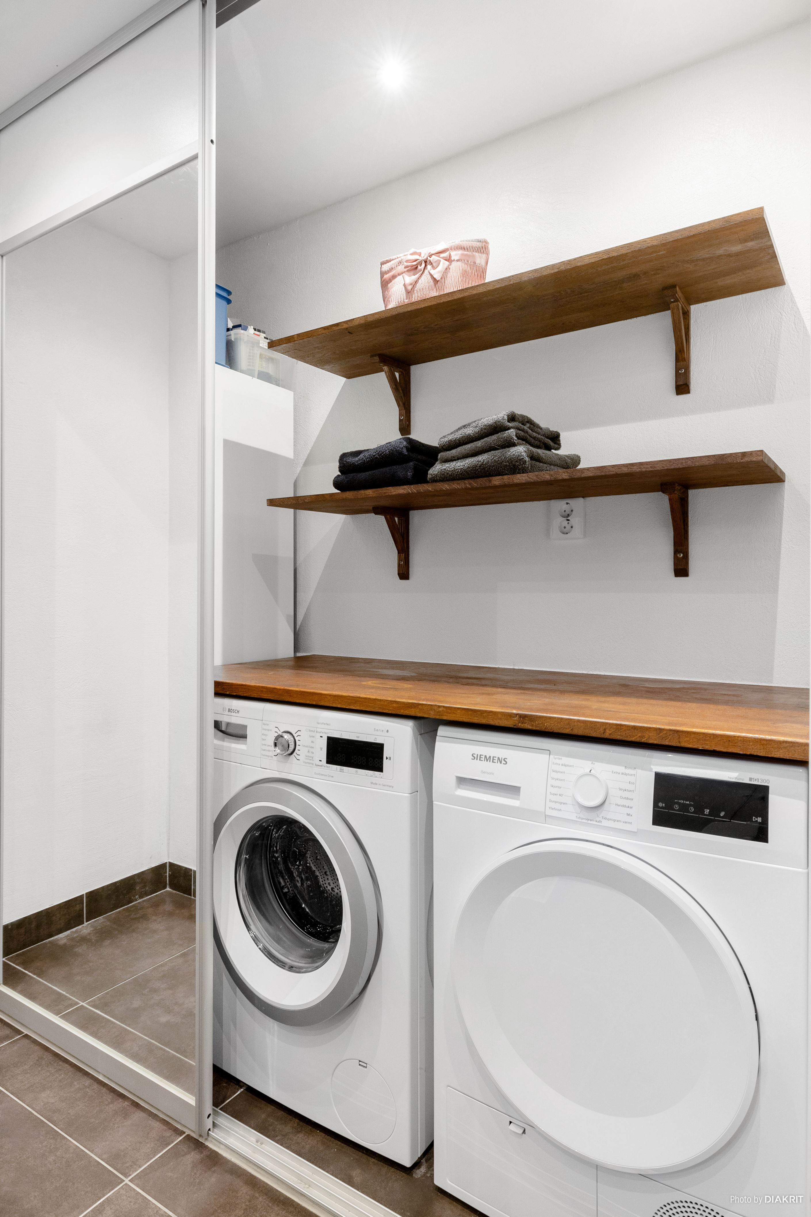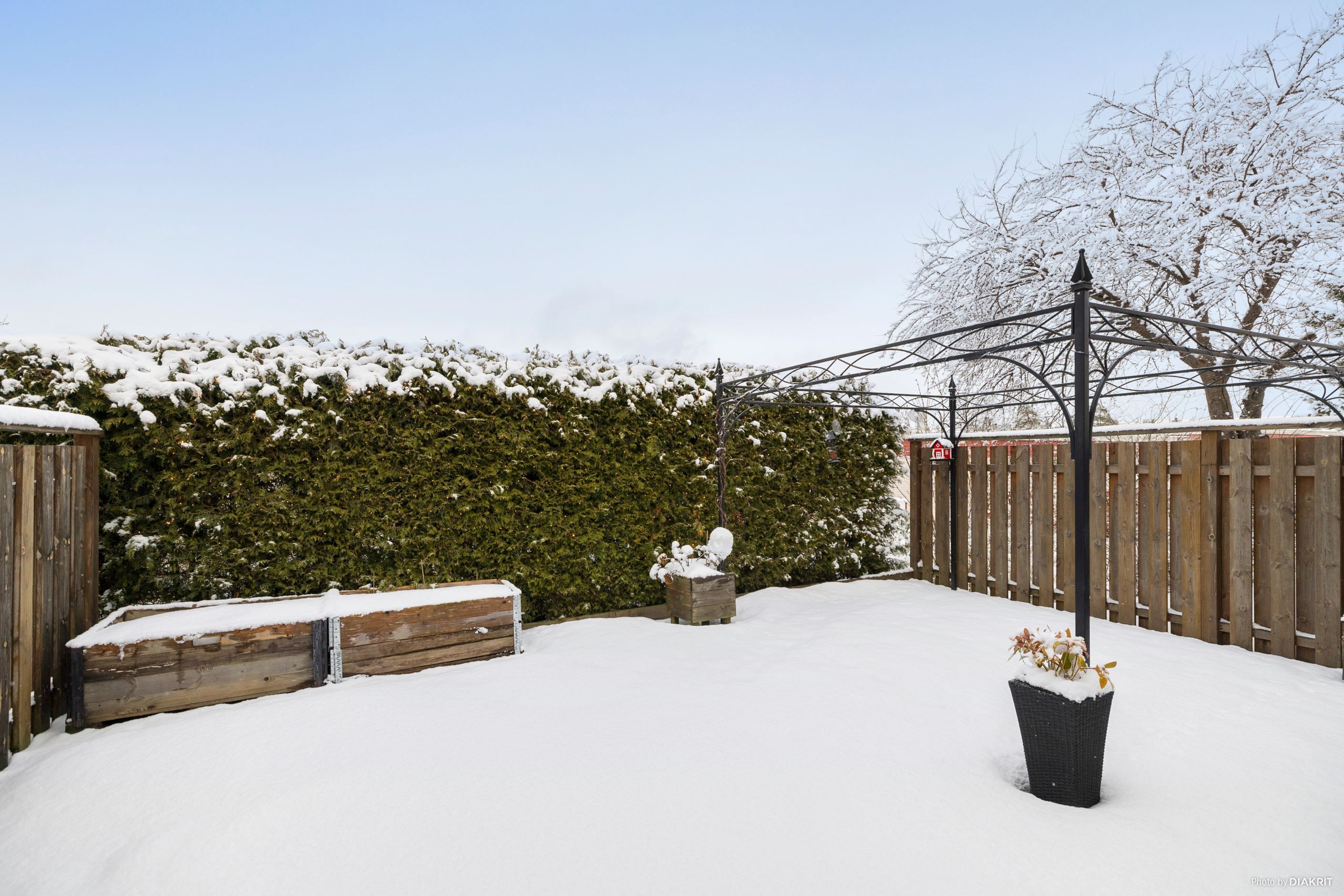 Vid entrén finns även en trevlig uteplats under tak, perfekt för morgonkaffet eller middagar under sommarhalvåret. Hela uteplatsen är belagd med trädäck, vilket ger ett stilrent och lättskött intryck. Här finns även ett rymligt utvändigt förråd, plats för parkering för två bilar samt elbilsladdare.