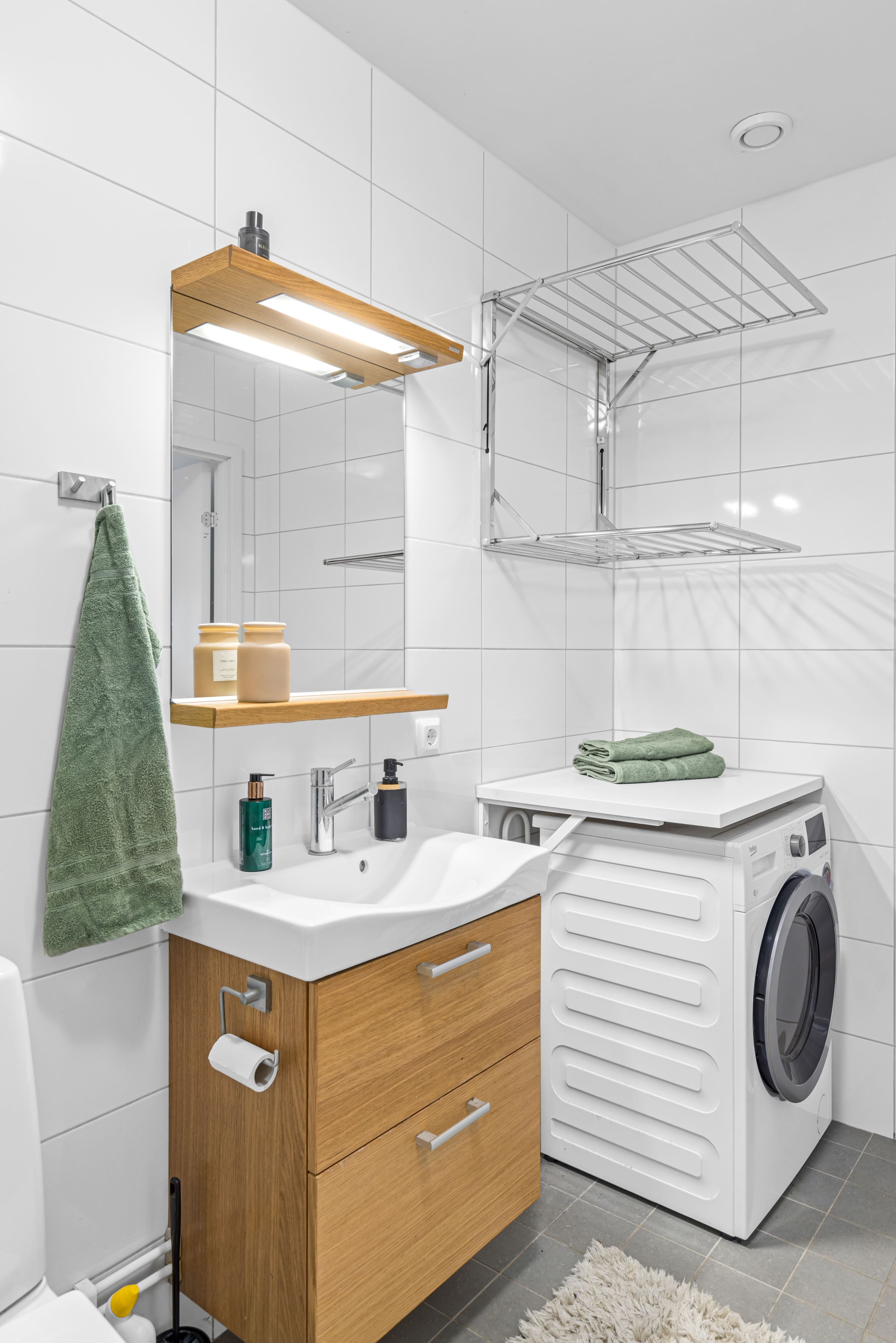 Sovrummet är avskilt och smart avdelat med skjutdörr som frigör yta och gör rummet lätt att möblera. Här finns plats för dubbelsäng och gott om förvaring. Badrummet håller hög standard och är utrustat med kombimaskin som gör vardagen smidig och frigör utrymme.