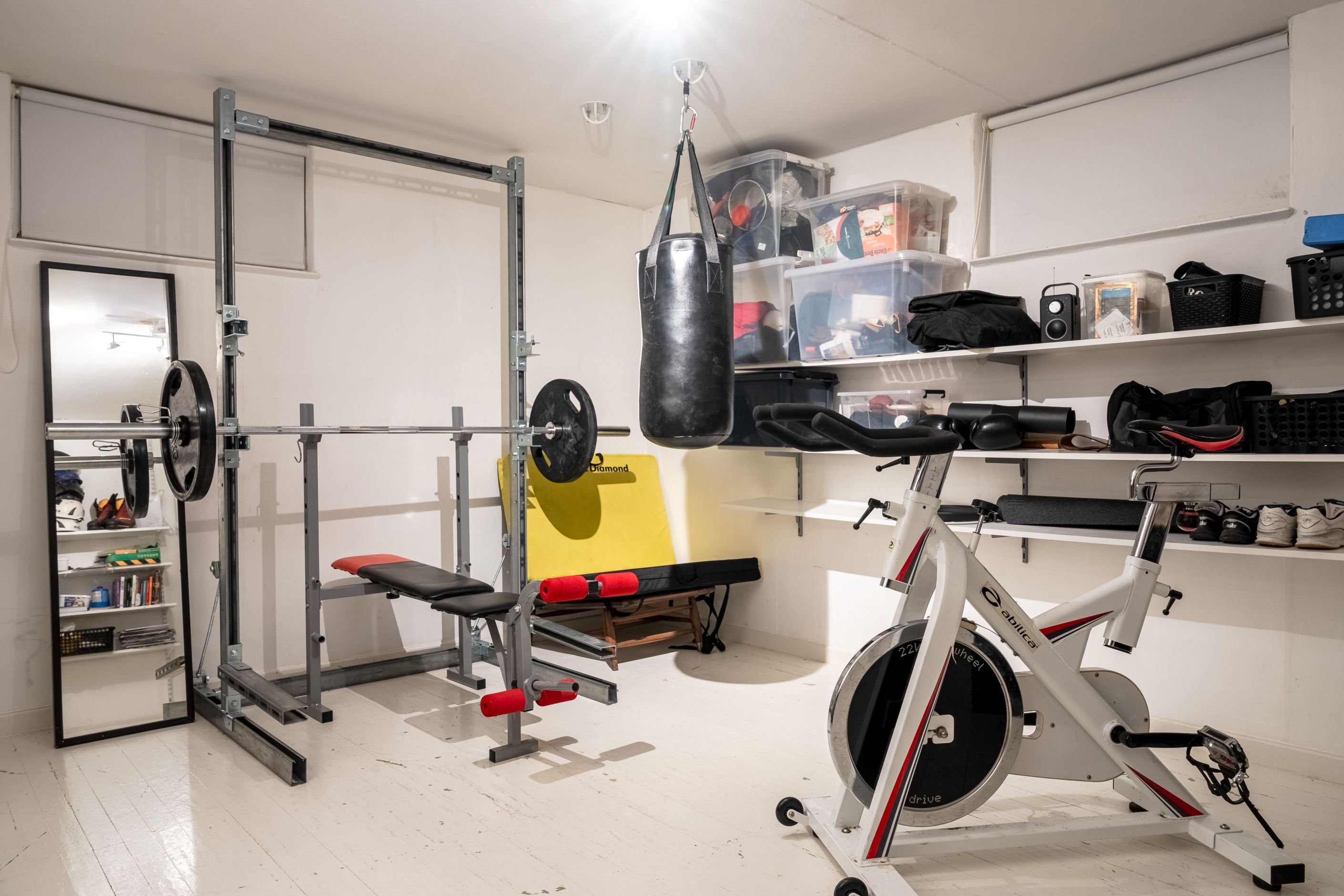 Husets källarplan är både generöst och välplanerat. Här finns en badrumsdel med bastu och relax utrustat med en öppen spis, perfekt för avkoppling efter en lång dag samt tvättstuga och pannrum. Vidare finns matkällare, förrådsutrymmen samt ett eget gym. För den händige eller den som gillar projekt finns dessutom verkstad och matkällare, och huset har även garage i källarplan med direkt ingång – en stor fördel under vintertid.