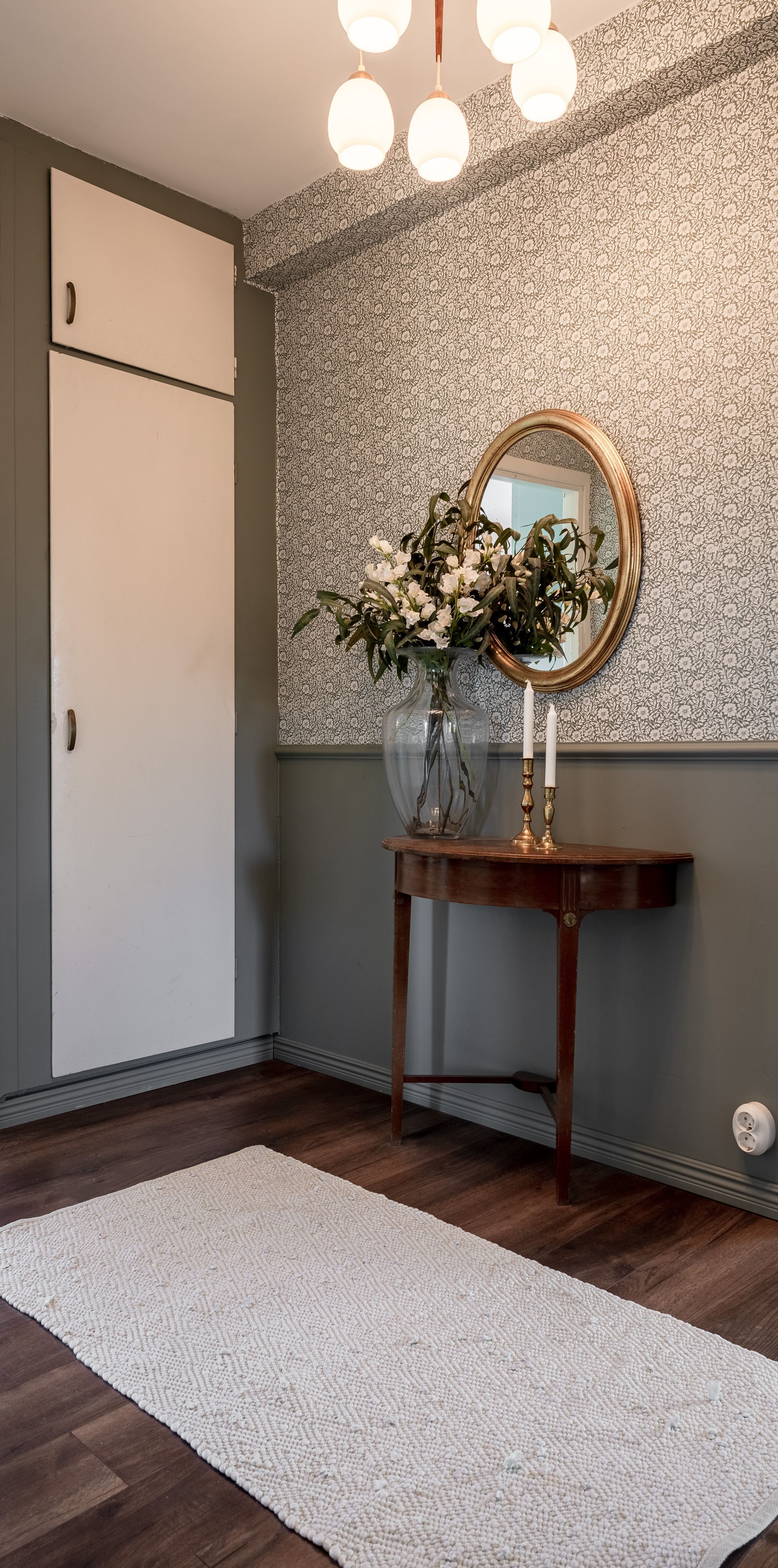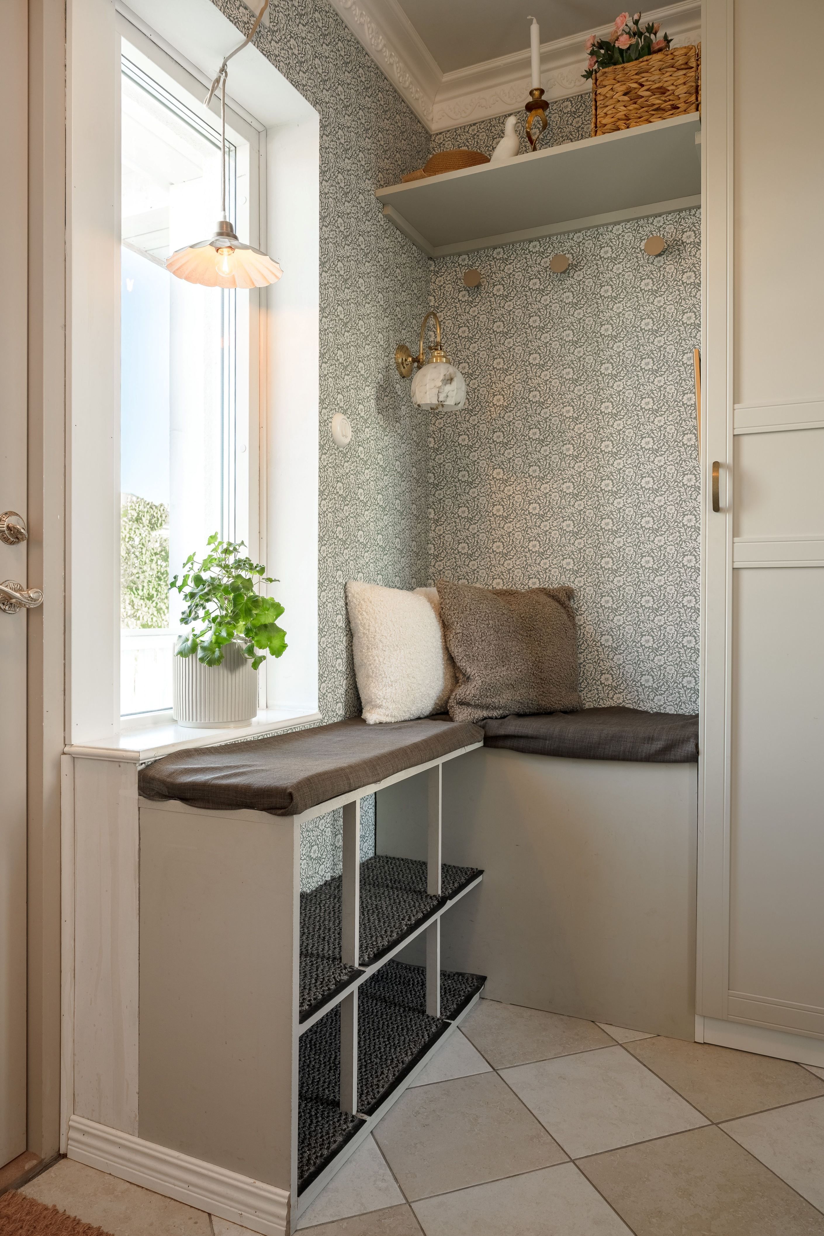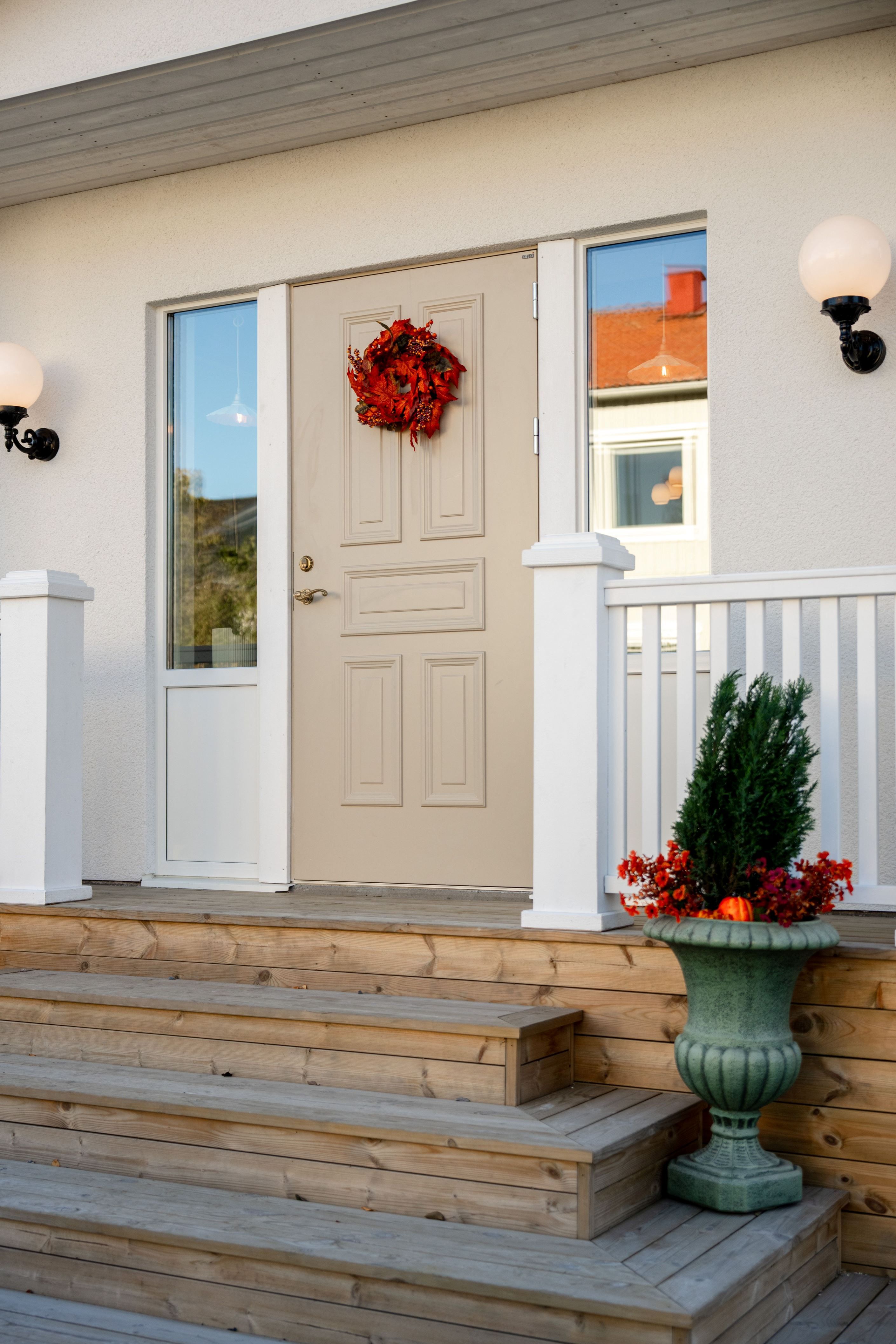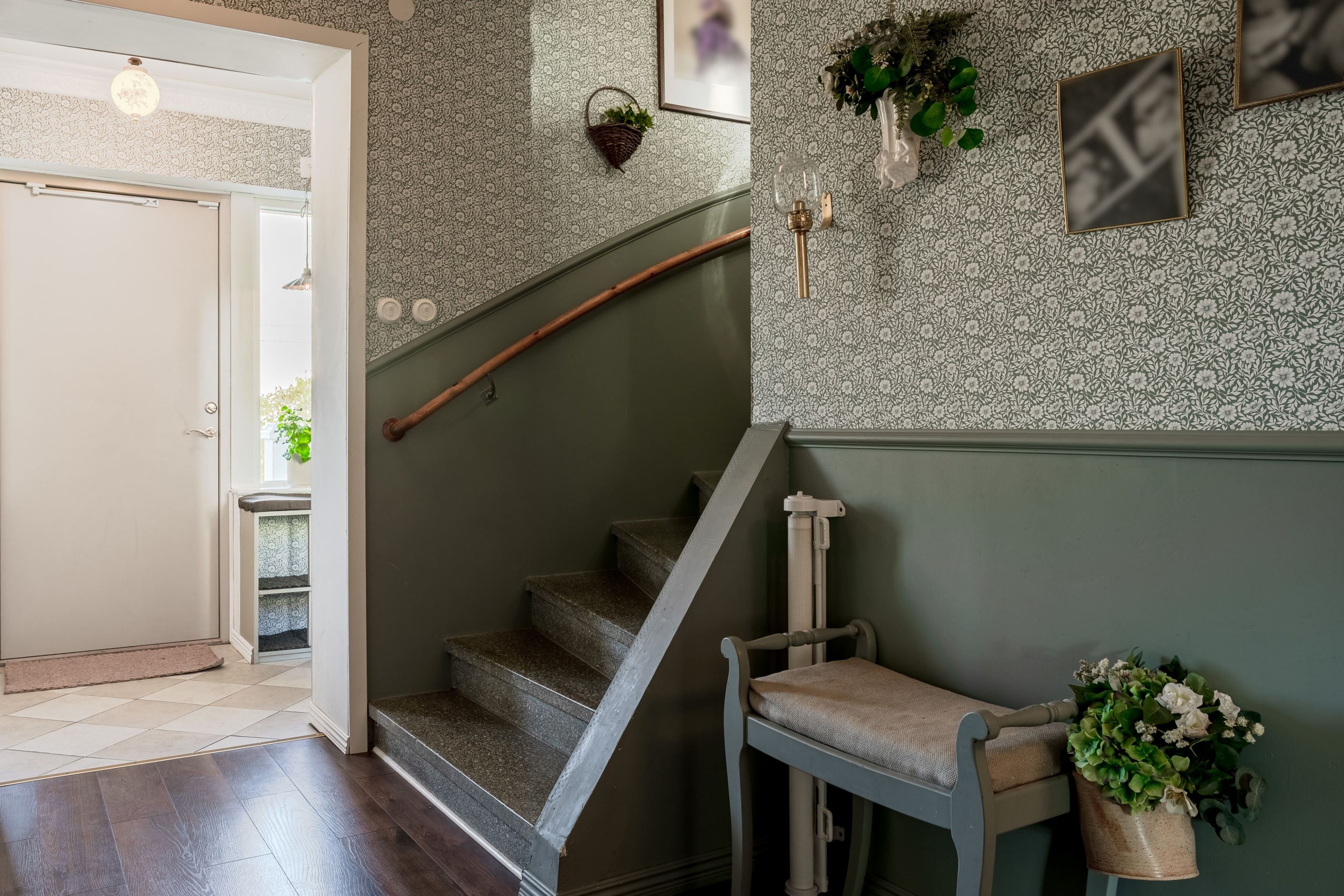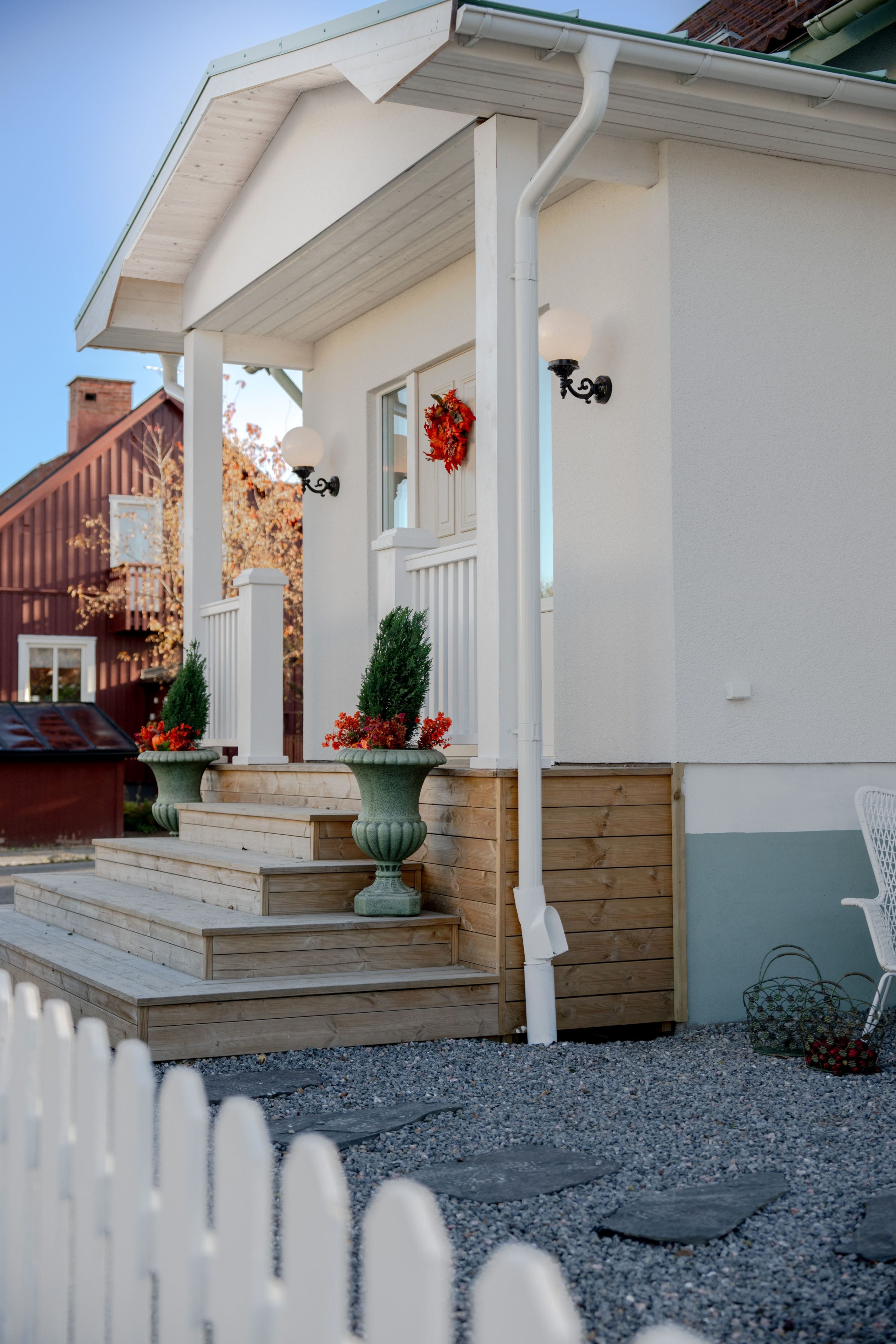 Redan vid ankomst möts du av den nybyggda farstukvisten med golvvärme – en välkomnande detalj som gör entrén både inbjudande och praktisk under årets kallare månader. På entréplanet väntar en ljus hall som öppnar upp mot husets hjärta – köket, matplatsen och vardagsrummet i en fantasiskt öppen planlösning.