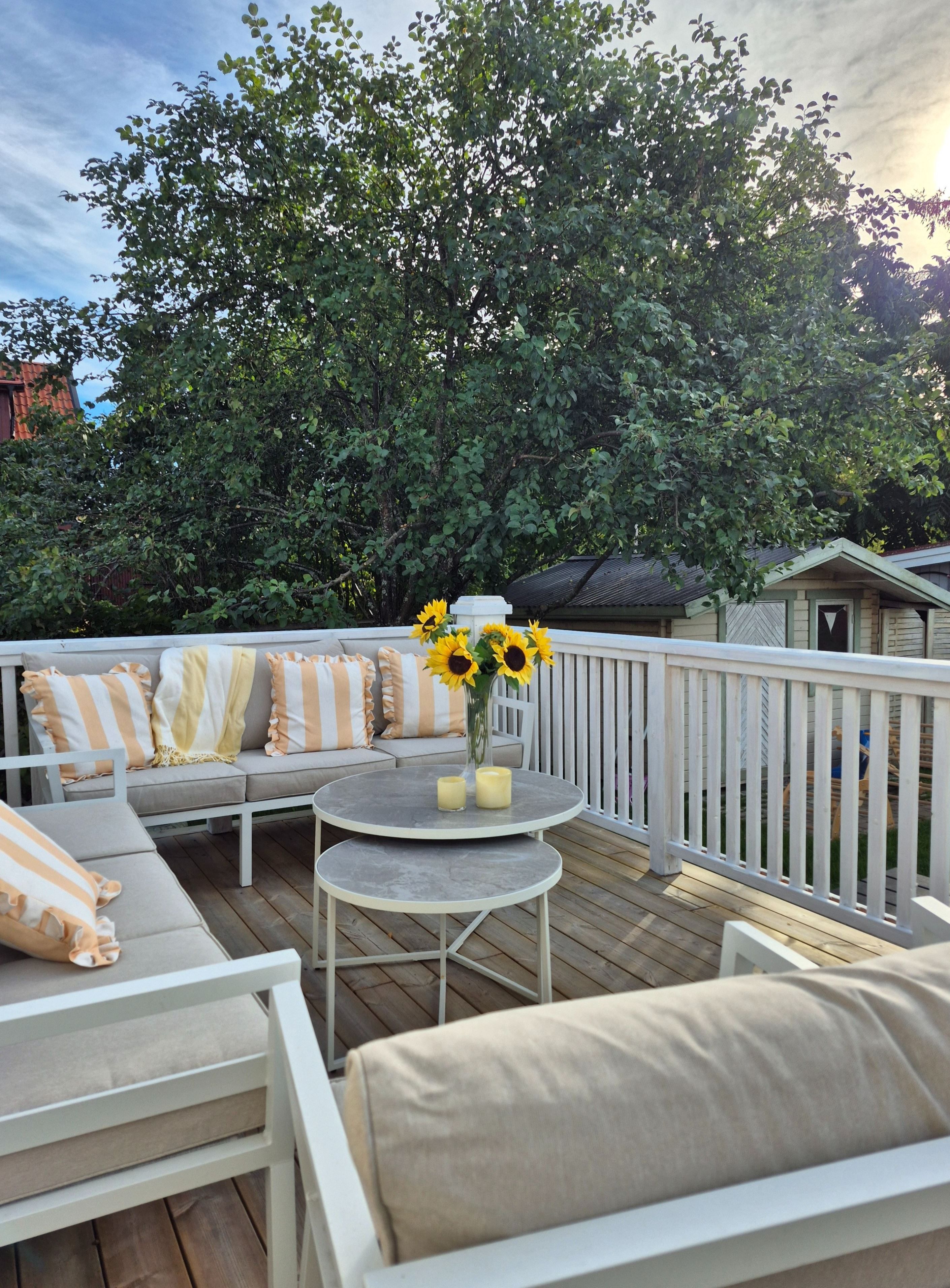 Här finner du en nybyggd altan i direkt söderläge och med utsikt över älven som nu löper längst hela husets baksida. Detta medför stora ytor där både matbord och lounge-grupp ryms utan problem. Här kan du bjuda in till härliga grillmiddagar med nära och kära de varmare sommarmånaderna och unna dig lyxen av att inta dina måltider ute i det fria med en fantastisk vy ut mot älven.