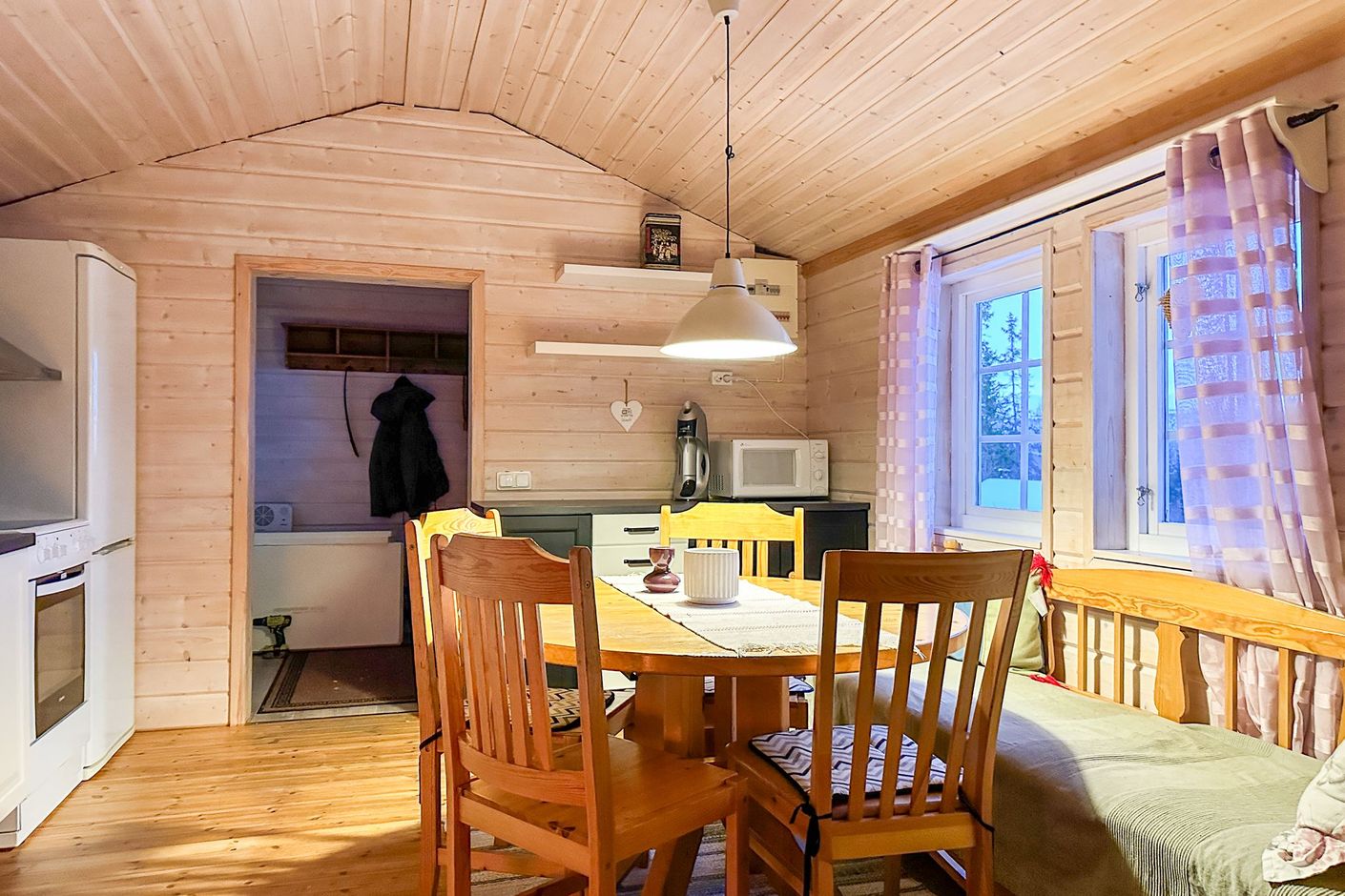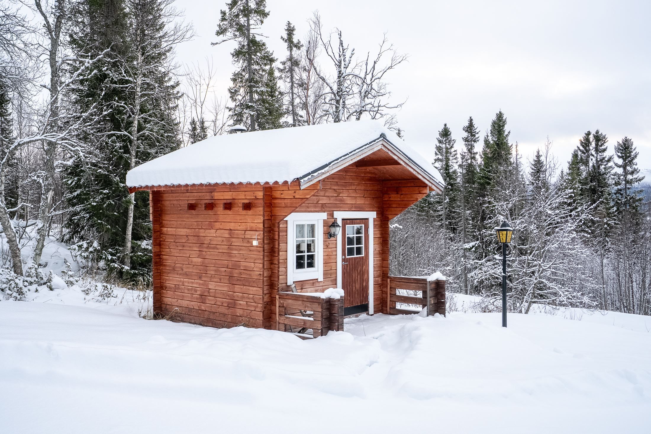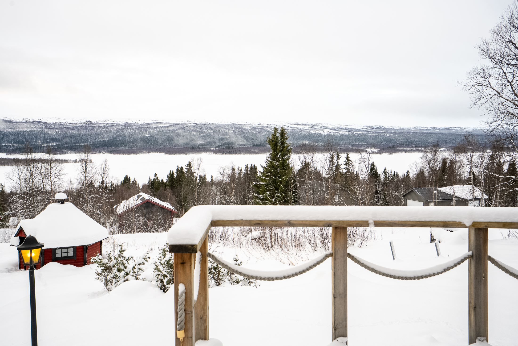 Själva huset har en varm och inbjudande karaktär med genomtänkta ytor. Allrummet med sin fönstervägg ner mot sjön skapar ett naturligt hjärta i huset där utsikten ständigt är närvarande, oavsett om man sitter med en kopp kaffe, eller samlas efter en dag på fjället. Altandörren leder vidare ut till den trevliga altanen som blir en självklar plats under årets varmare månader. Här finns utrymme för både matgrupp, med en utsikt som gör varje stund utomhus till något extra.