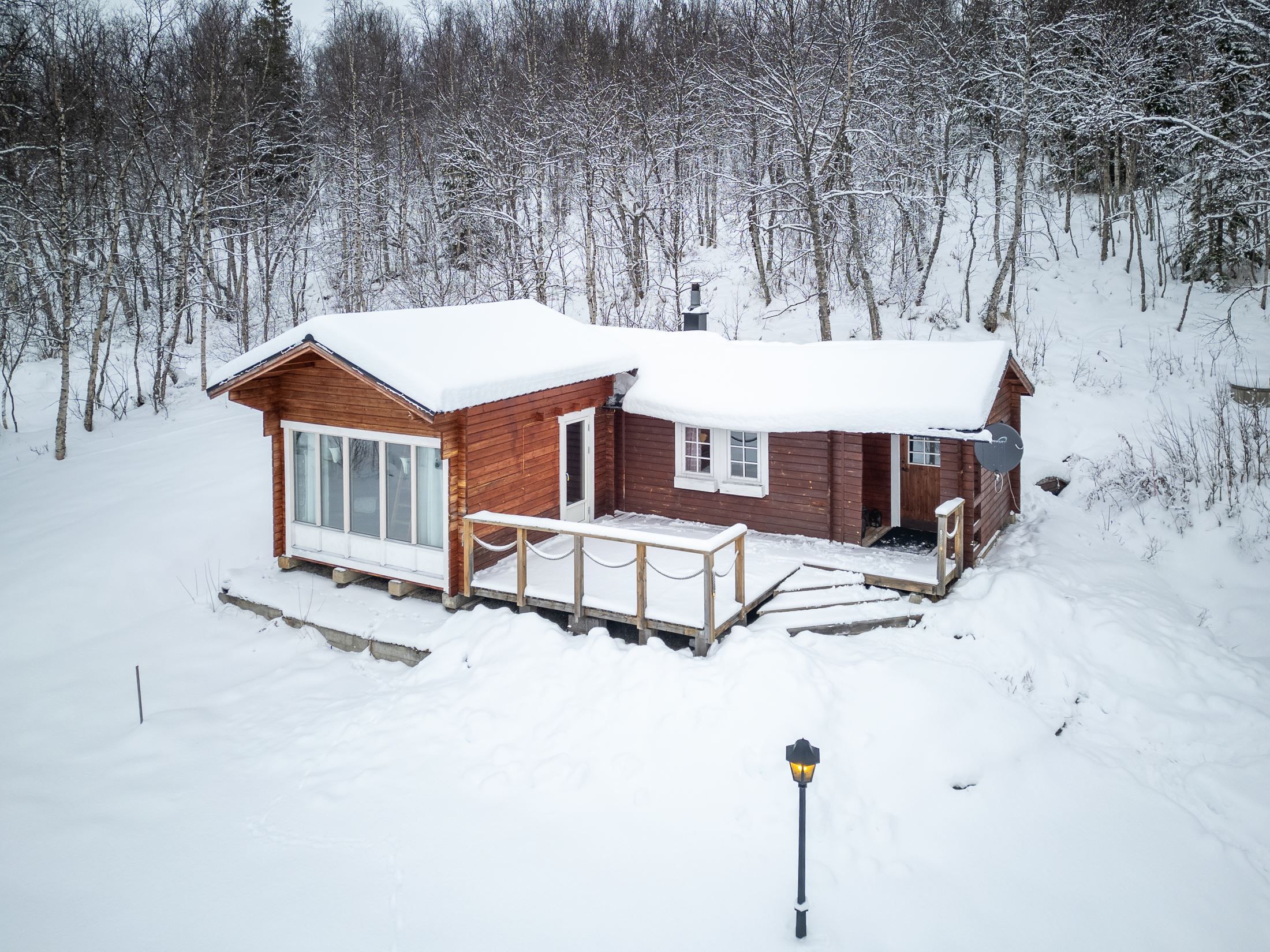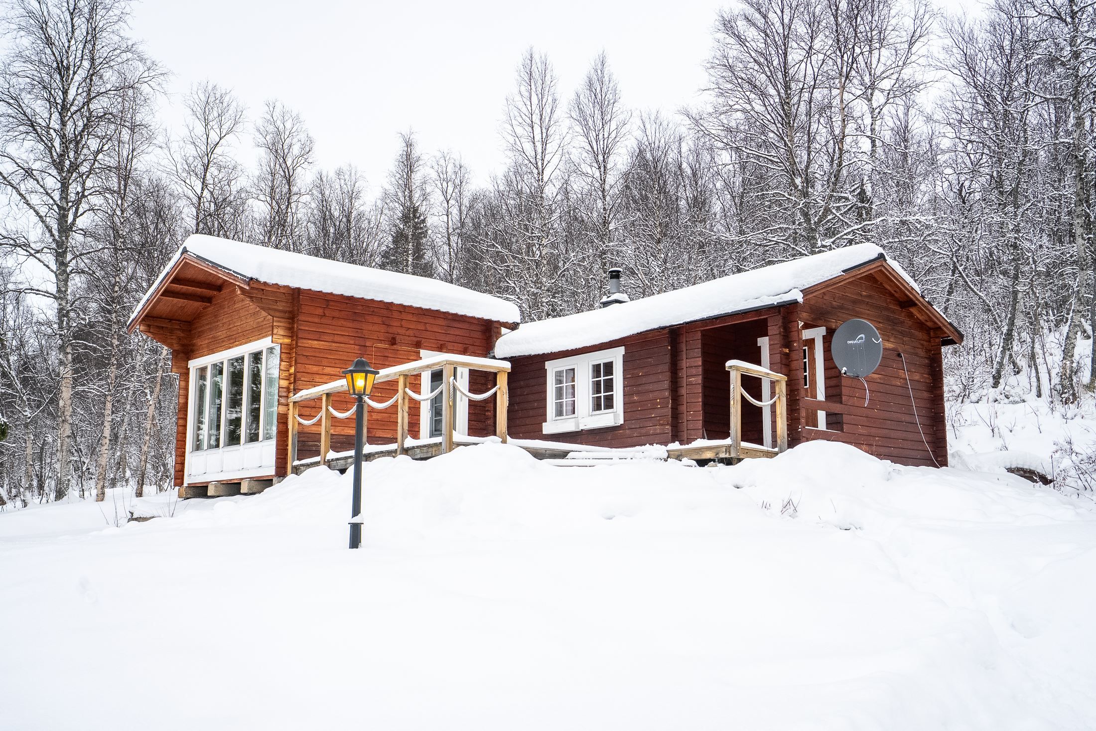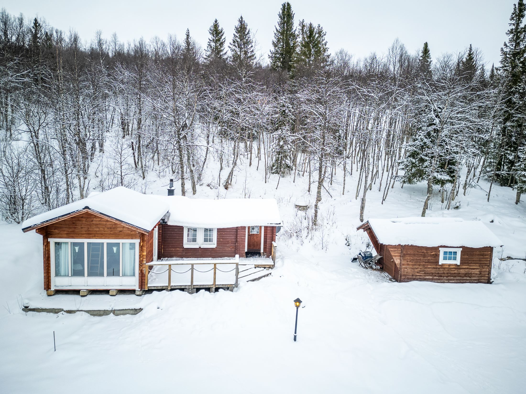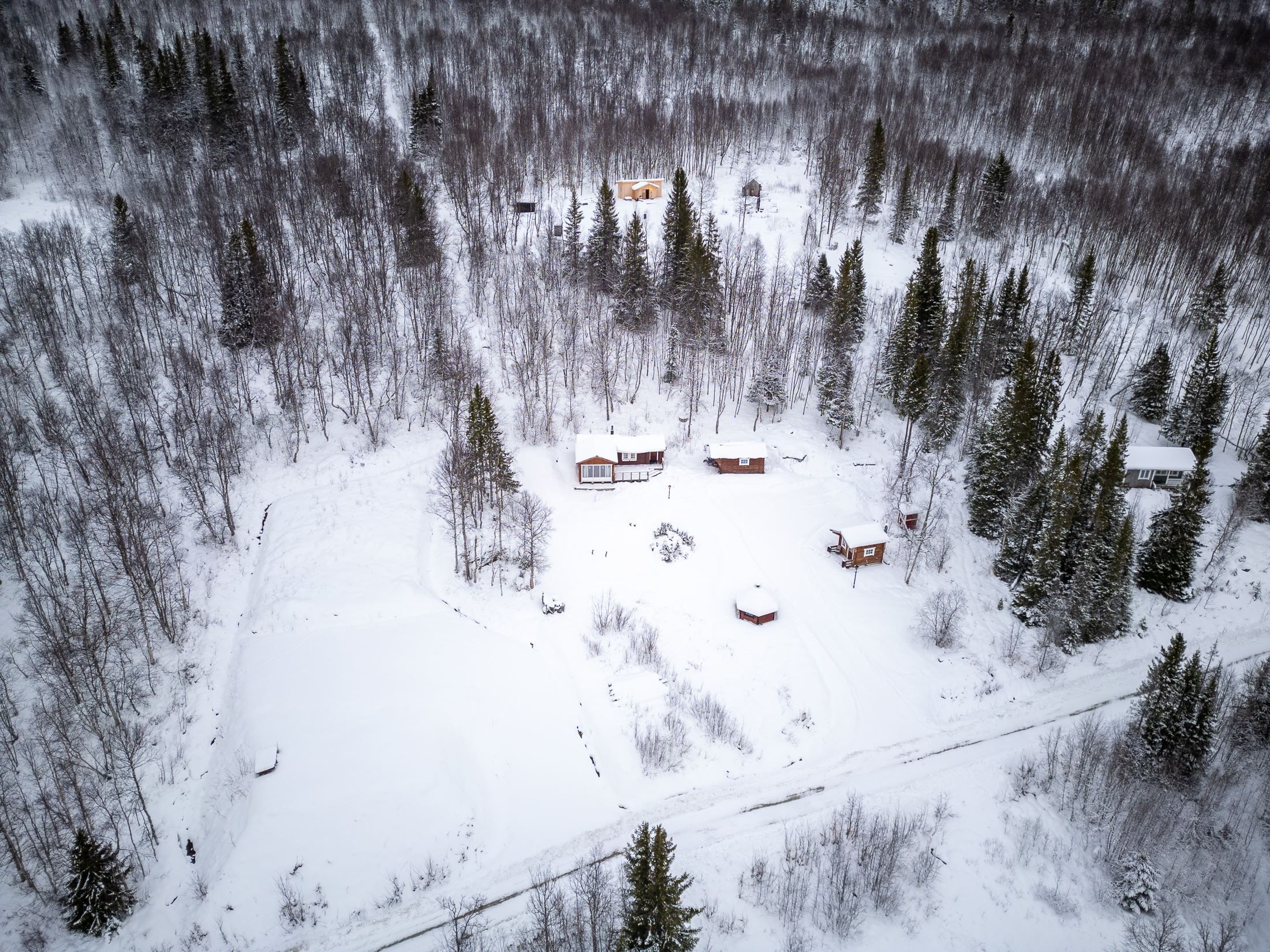 På tomten finns flera uppskattade komplementbyggnader som förstärker helhetsupplevelsen. Skotergaraget ger goda förutsättningar för ett aktivt fritidsliv under vinterhalvåret, med smidig förvaring och hantering av skoter. Gäststugan ger extra utrymme för övernattande vänner och familj och skapar en fin möjlighet att vara många utan att tumma på komforten. Grillkåtan blir en naturlig samlingsplats året runt, där middagar kan tillagas över öppen eld i en stämningsfull miljö.